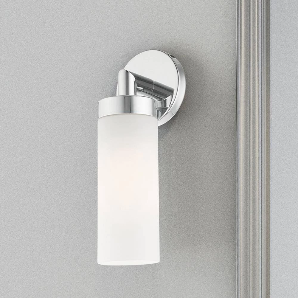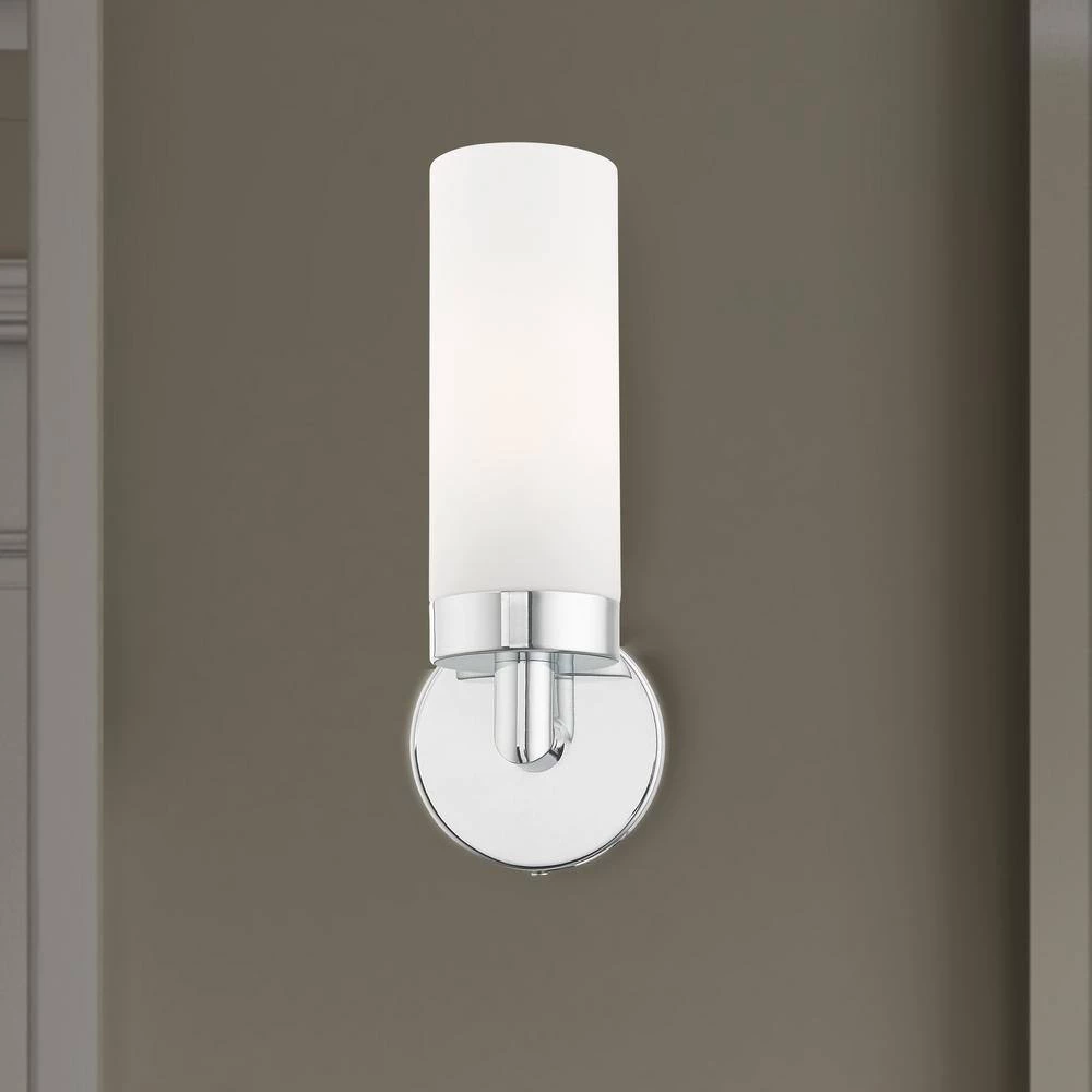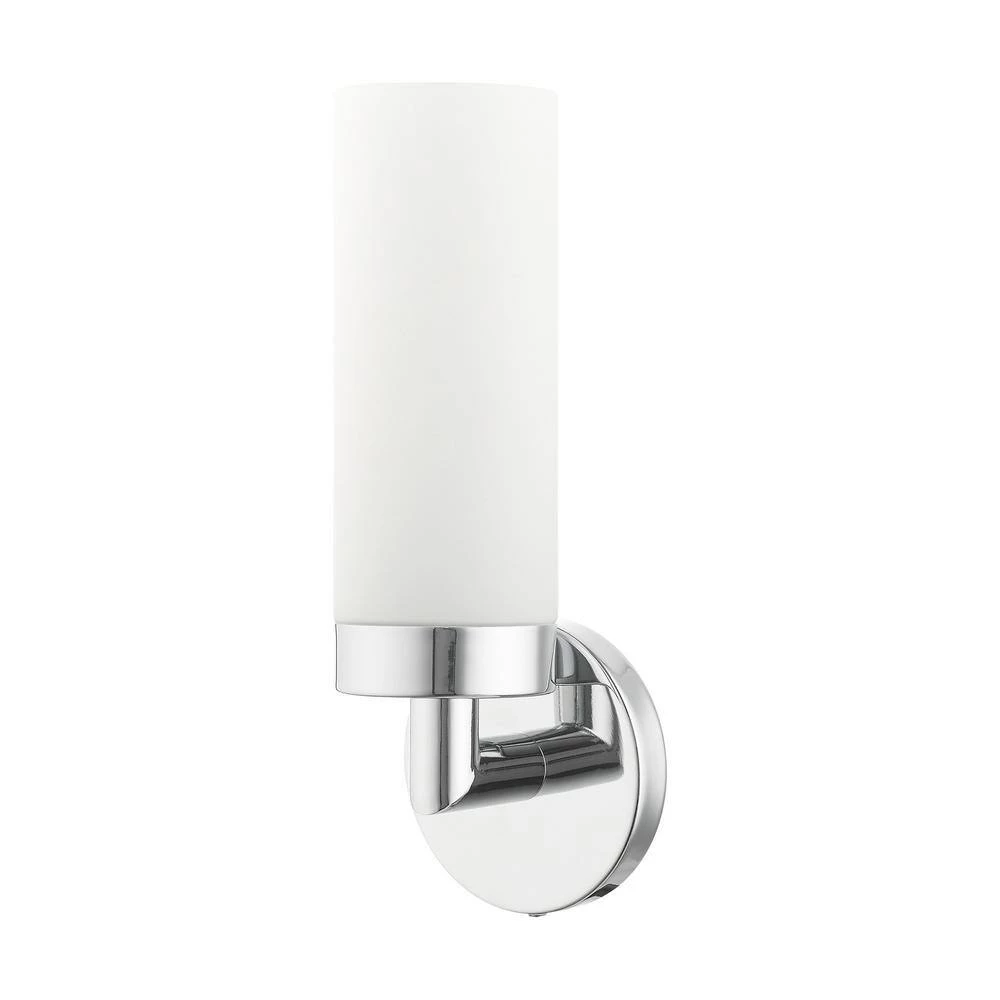 Livex Lighting is well known for quality, style and value. Add a dash of character and radiance to your home with this wall sconce. This single-light fixture from the Aero Collection features a polished chrome finish with a satin opal white glass. The clean lines of the back plate complement the cylindrical glass shade creating a minimal, sleek, urban look that works well in most decors. This fixture adds upscale charm and contemporary aesthetics to your home. This well-rounded fixture is sure to satisfy your lighting needs.