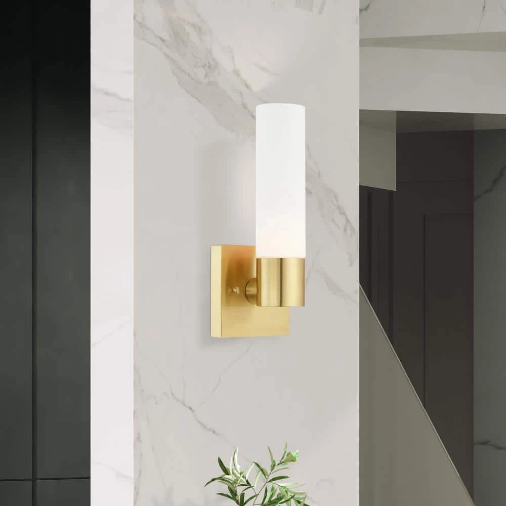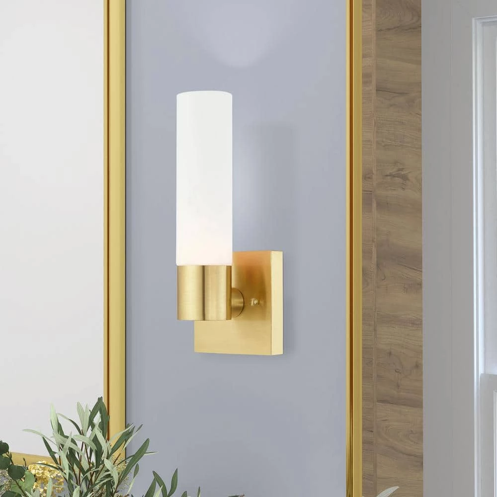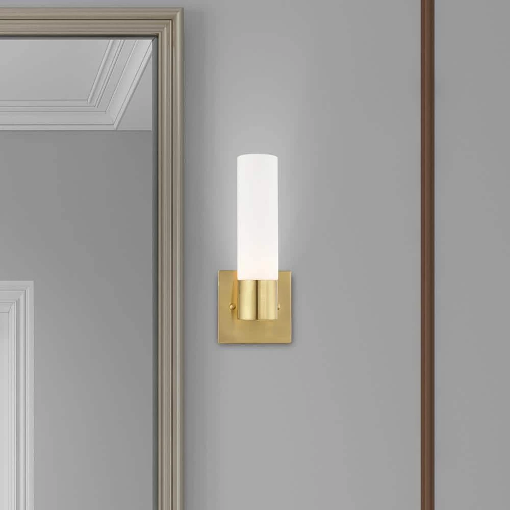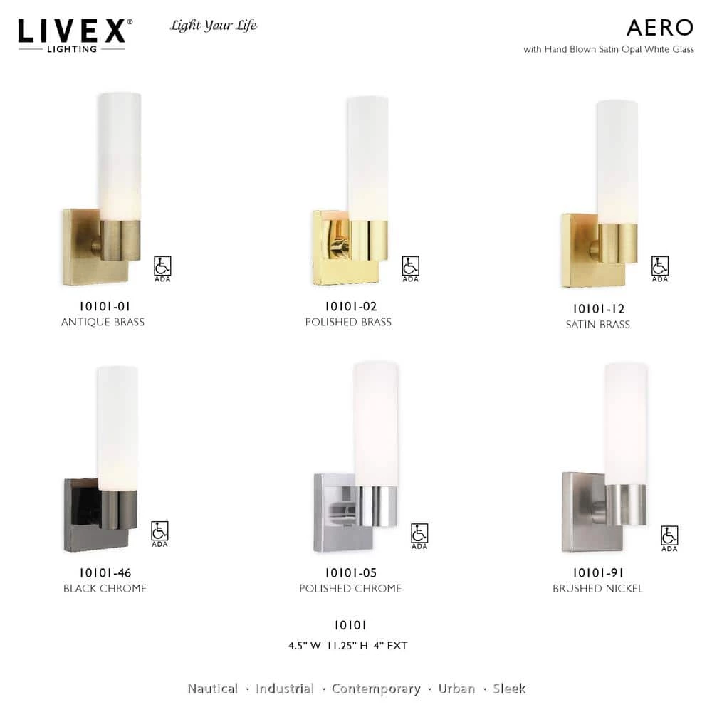 Livex Lighting is well known for quality, style and value. With the sleek contemporary design, the Aero bath bar casts a soft, flattering light as the tubular etched opal glass diffuses the light of one lamp. Available in antique brass, polished brass, polished chrome, satin brass, black chrome or brushed nickel. This well-rounded fixture is sure to satisfy your lighting needs.