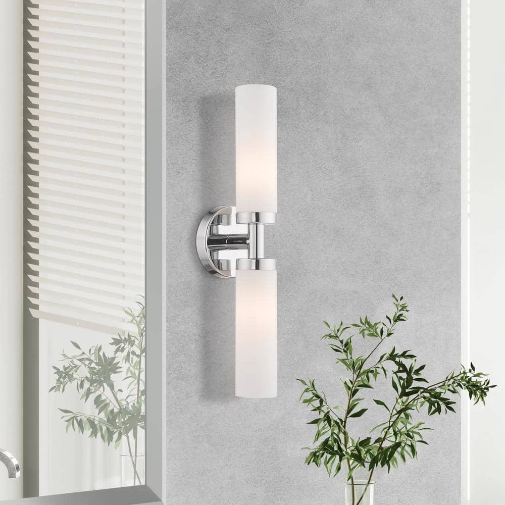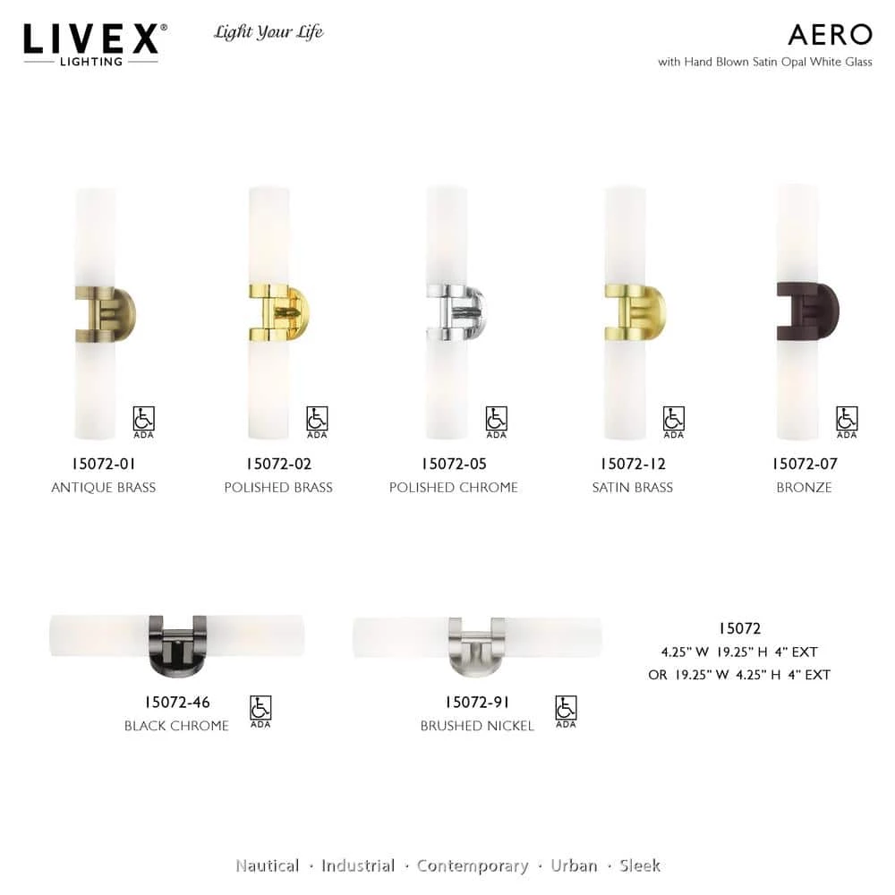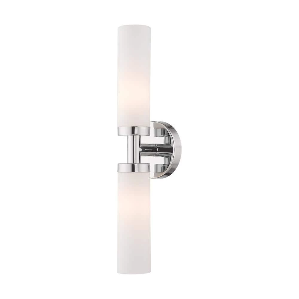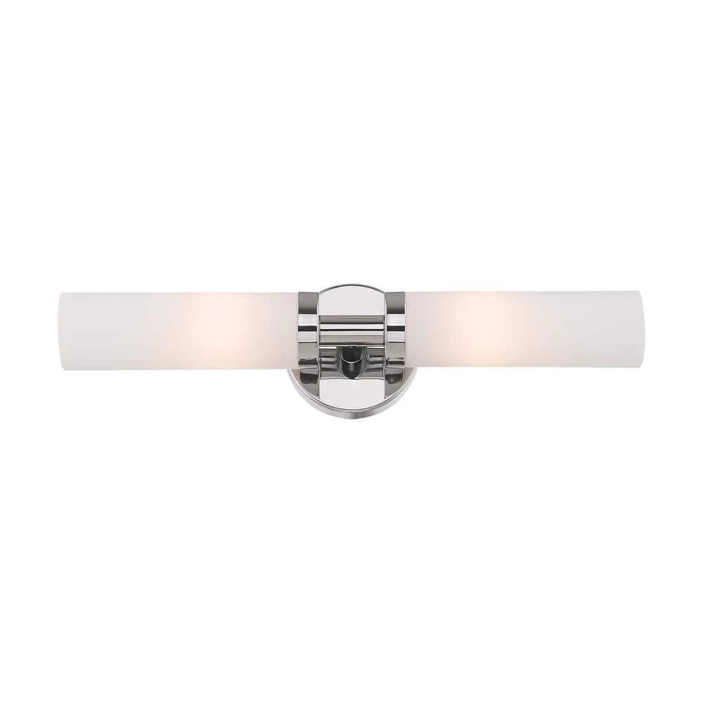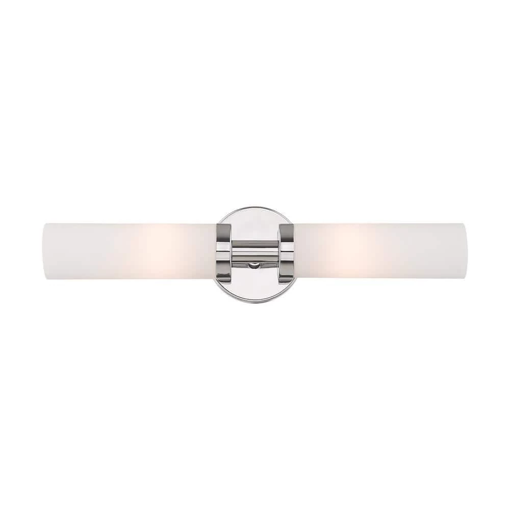 Livex Lighting is well known for quality, style and value. With the sleek contemporary design, the Aero bath bar casts a soft, flattering light which can be mounted horizontal or vertical. The tubular etched opal glass diffuses the light of 2 lamps. Available in brilliant polished chrome or a subdued brushed nickel. This well-rounded fixture is sure to satisfy your lighting needs.