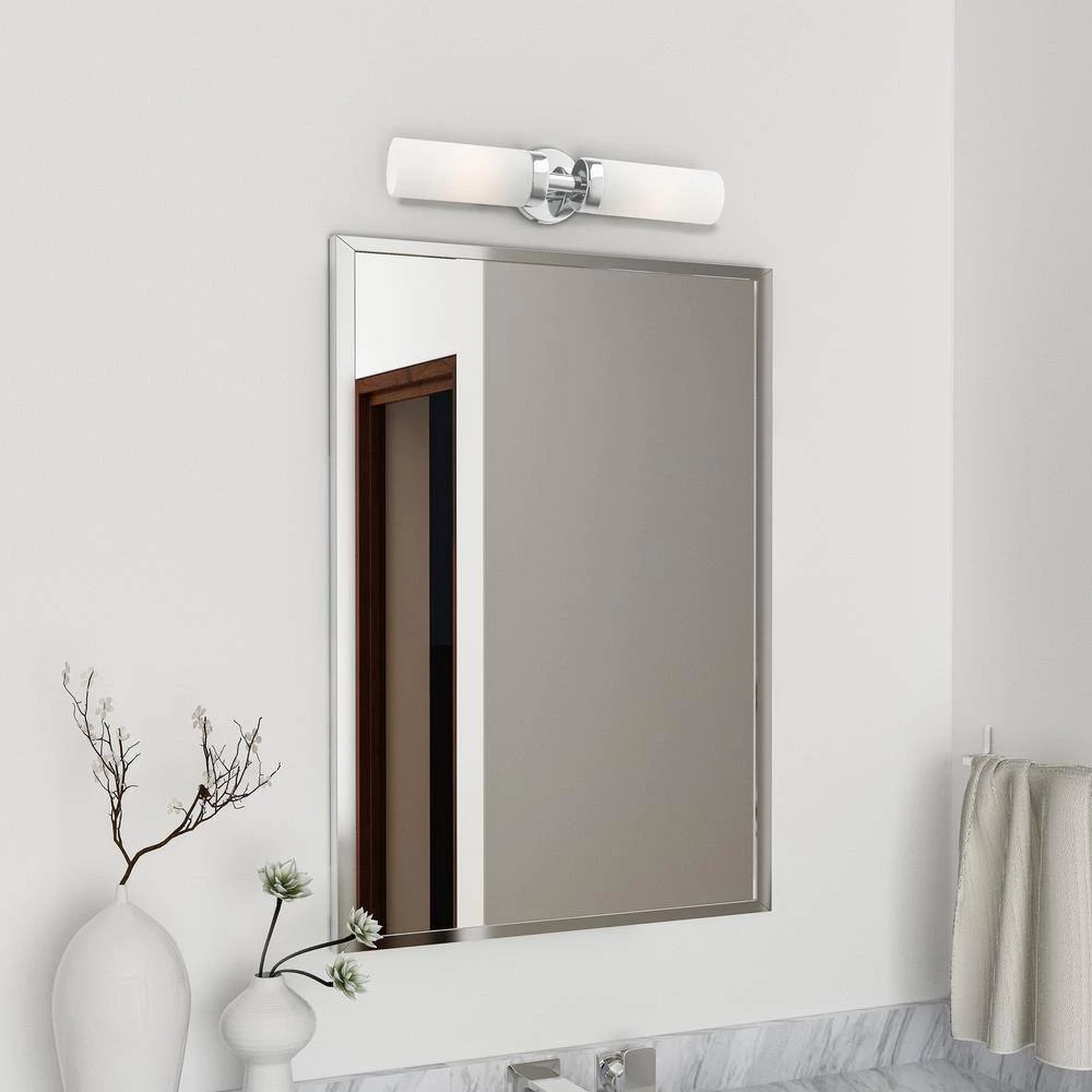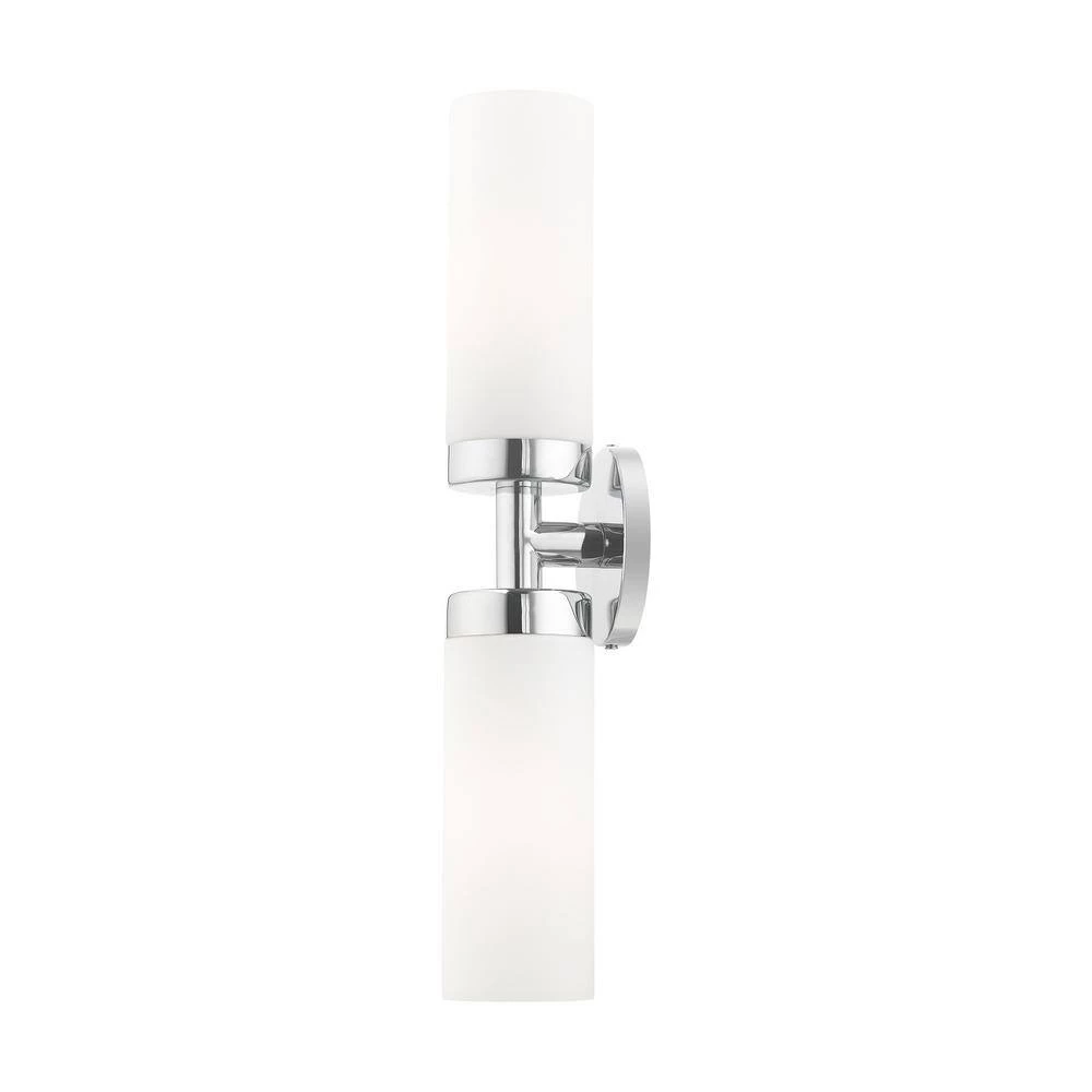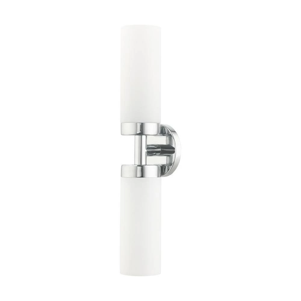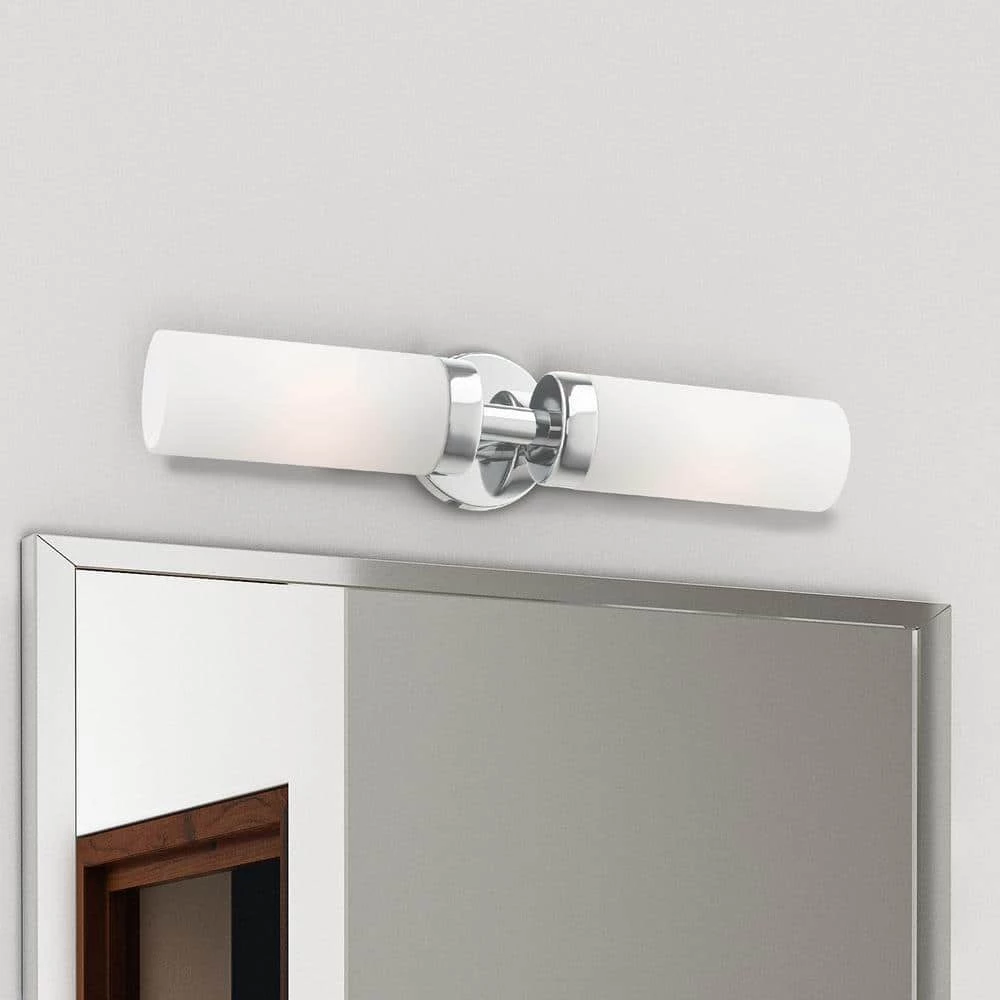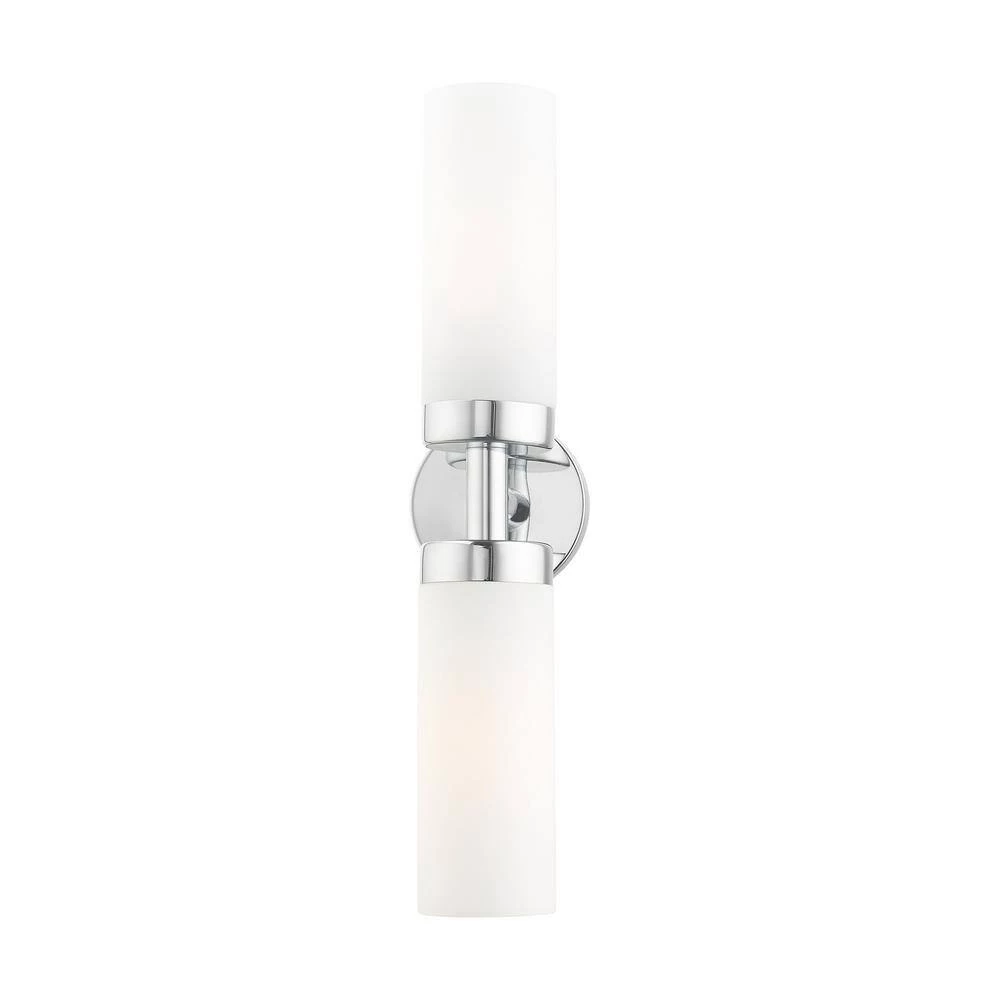 Livex Lighting is well known for quality, style and value. Add a dash of character and radiance to your home with this vanity sconce. This 2-light fixture from the Aero Collection features a polished chrome finish with 2 satin opal white glass cylinder shades on either side. The clean lines of the back plate complement the cylindrical glass shades creating a minimal, sleek, urban look that works well in most decors. This fixture adds upscale charm and contemporary aesthetics to your home. This well-rounded fixture is sure to satisfy your lighting needs.