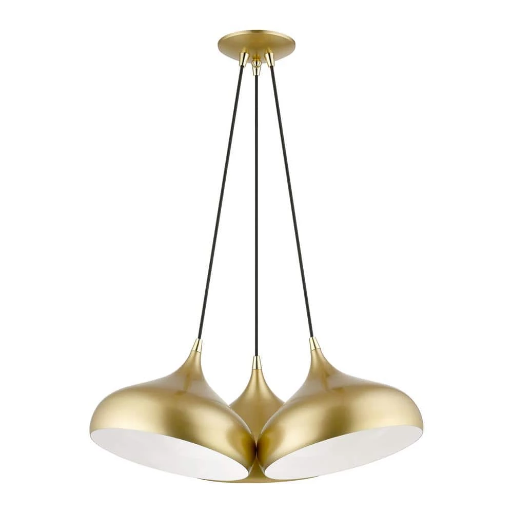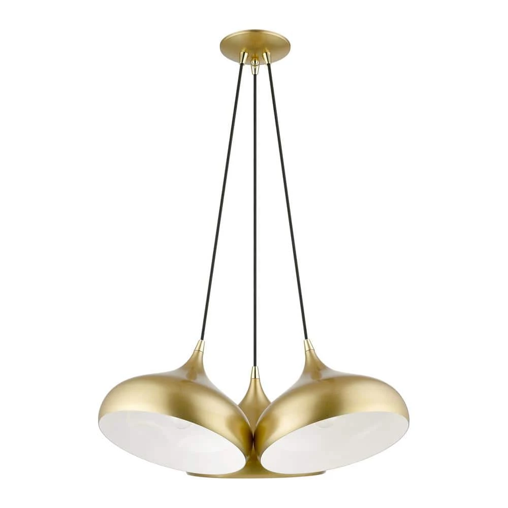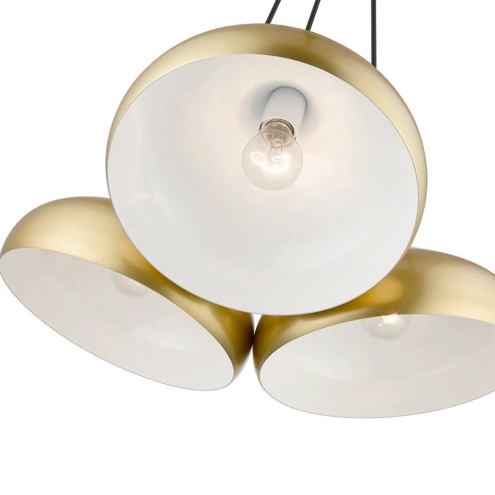 Livex Lighting is well known for quality, style and value. The modern, minimal Amador teardrop 3-light cluster pendant features soft gold finish shades with a shiny white finish inside. Polished brass finish accents complete the look.