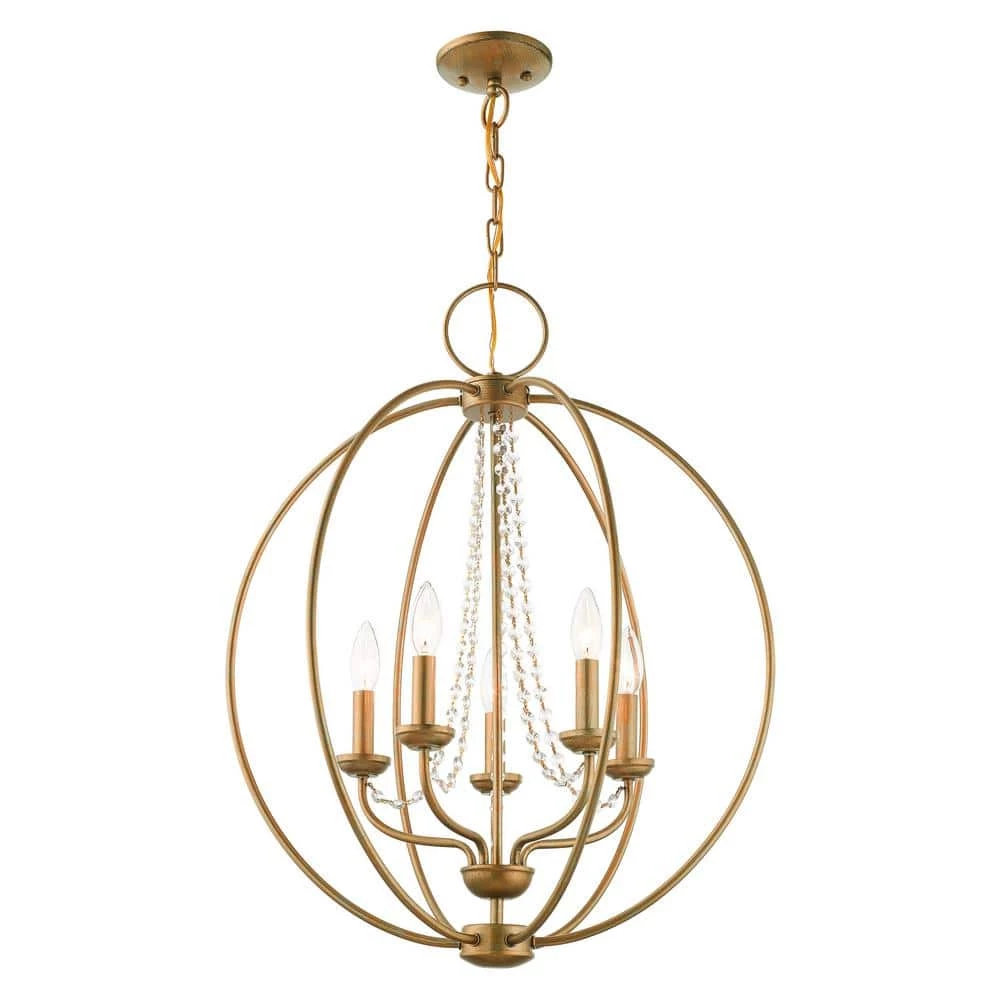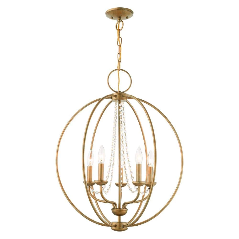 Livex Lighting is well known for quality, style and value. Our Arabella collection 5 light transitional orb features an antique gold leaf sphere with delicate draping crystals. Together, the metal and crystal create a balance between modern and classical. This clever design combination is the model of versatility and perfect for an elegant dining room or use in a casual kitchen setting. This well-rounded fixture is sure to satisfy your lighting needs.