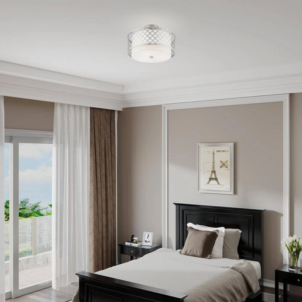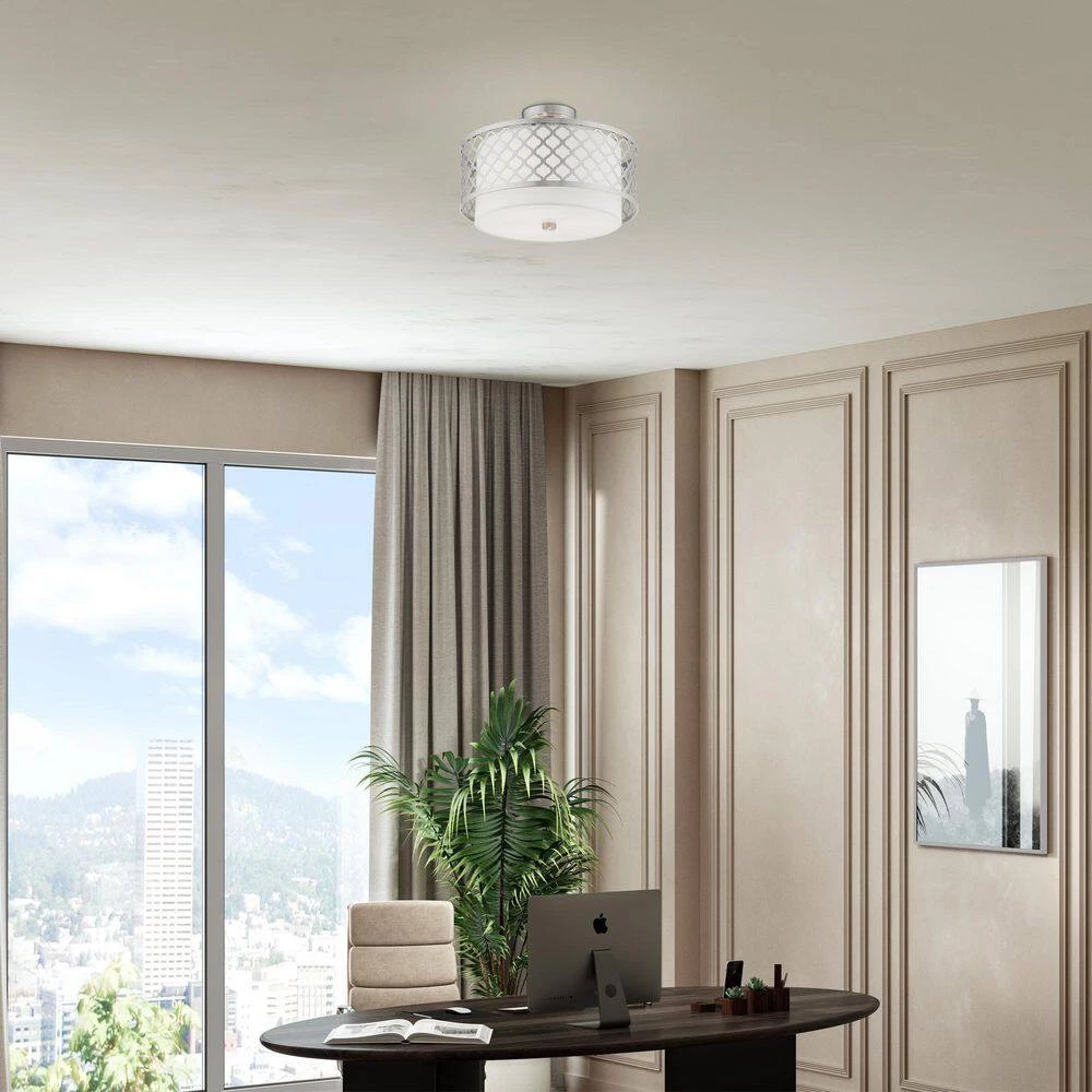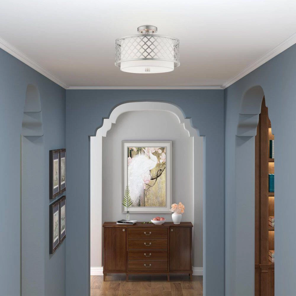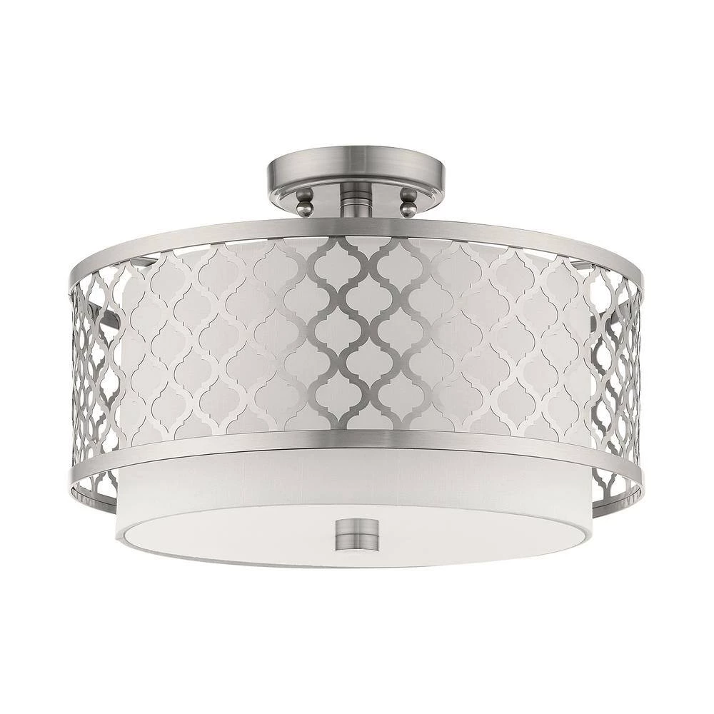 Our Arabesque 3-light semi flush mount will add refined style and a hint of mystery to your decor. The off-white fabric hardback shade creates a warm illumination, while the light brings to life the intricate brushed nickel cutout pattern. With the superb craftsmanship and affordable price this fixture is sure to tastefully indulge your extravagant side.