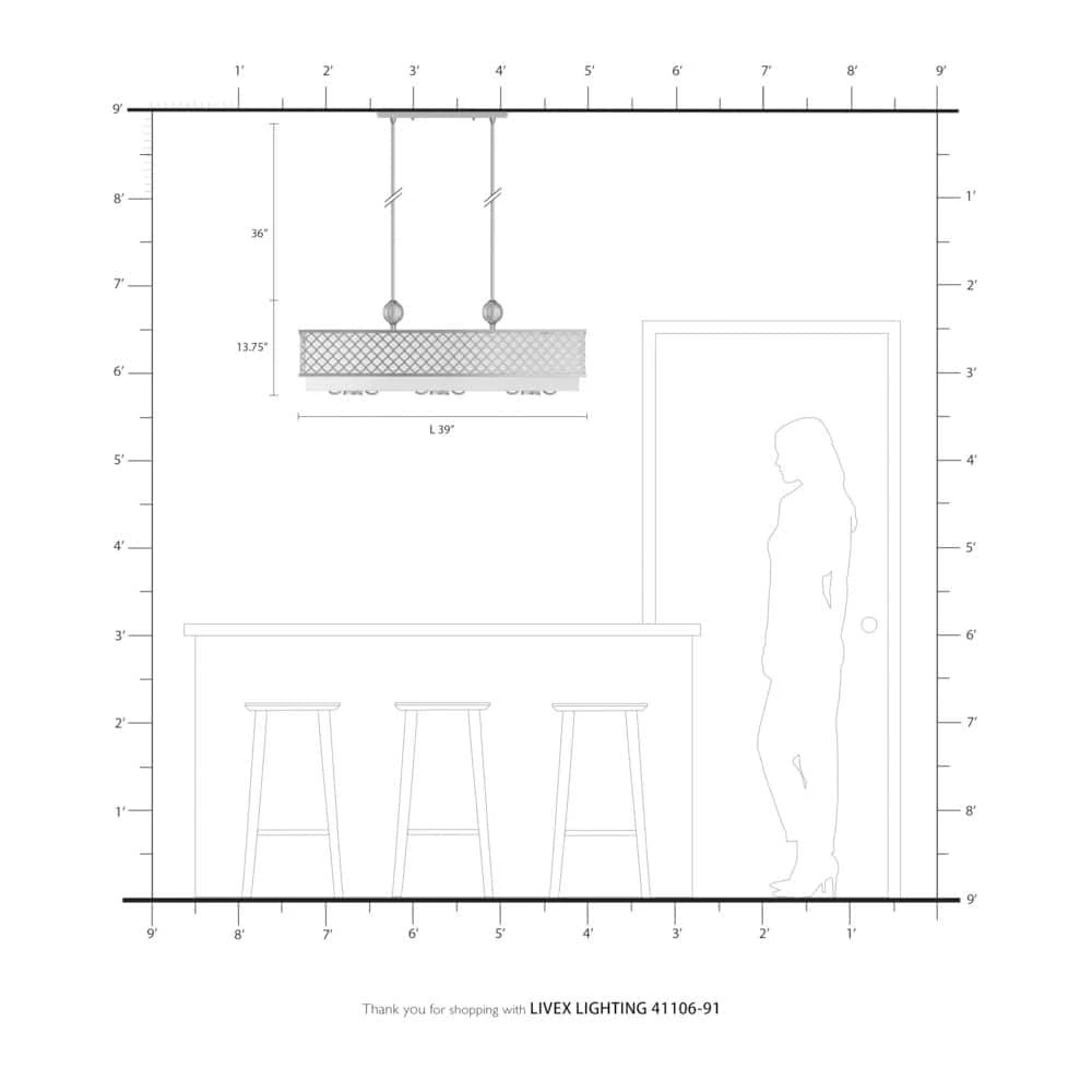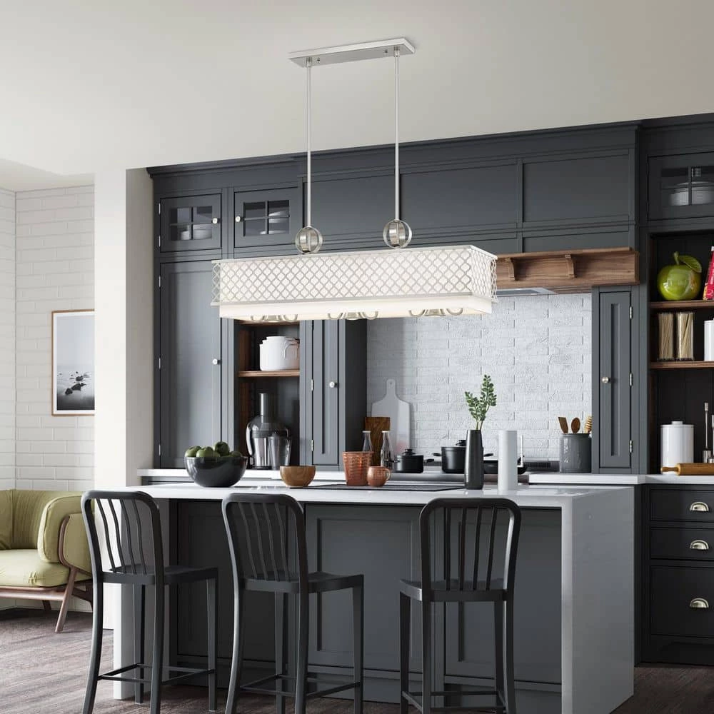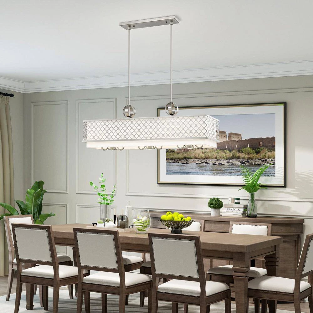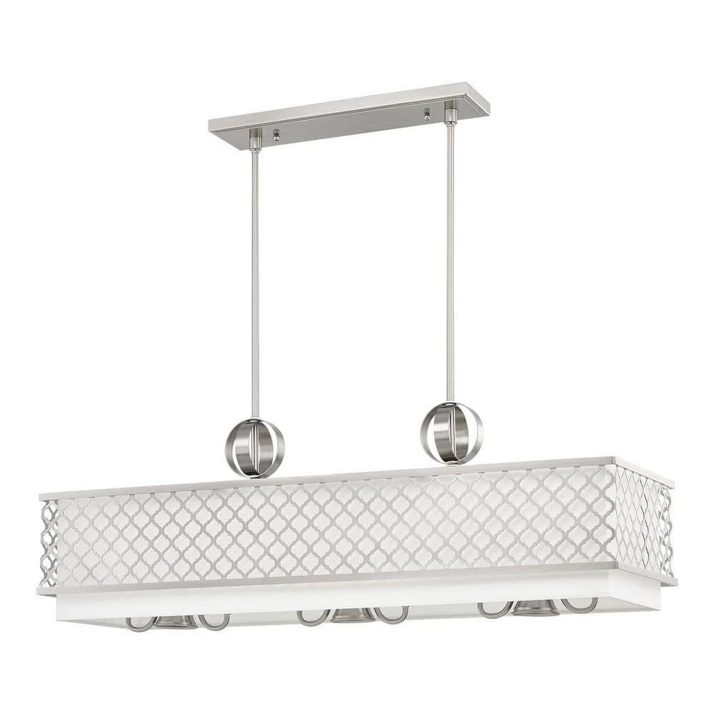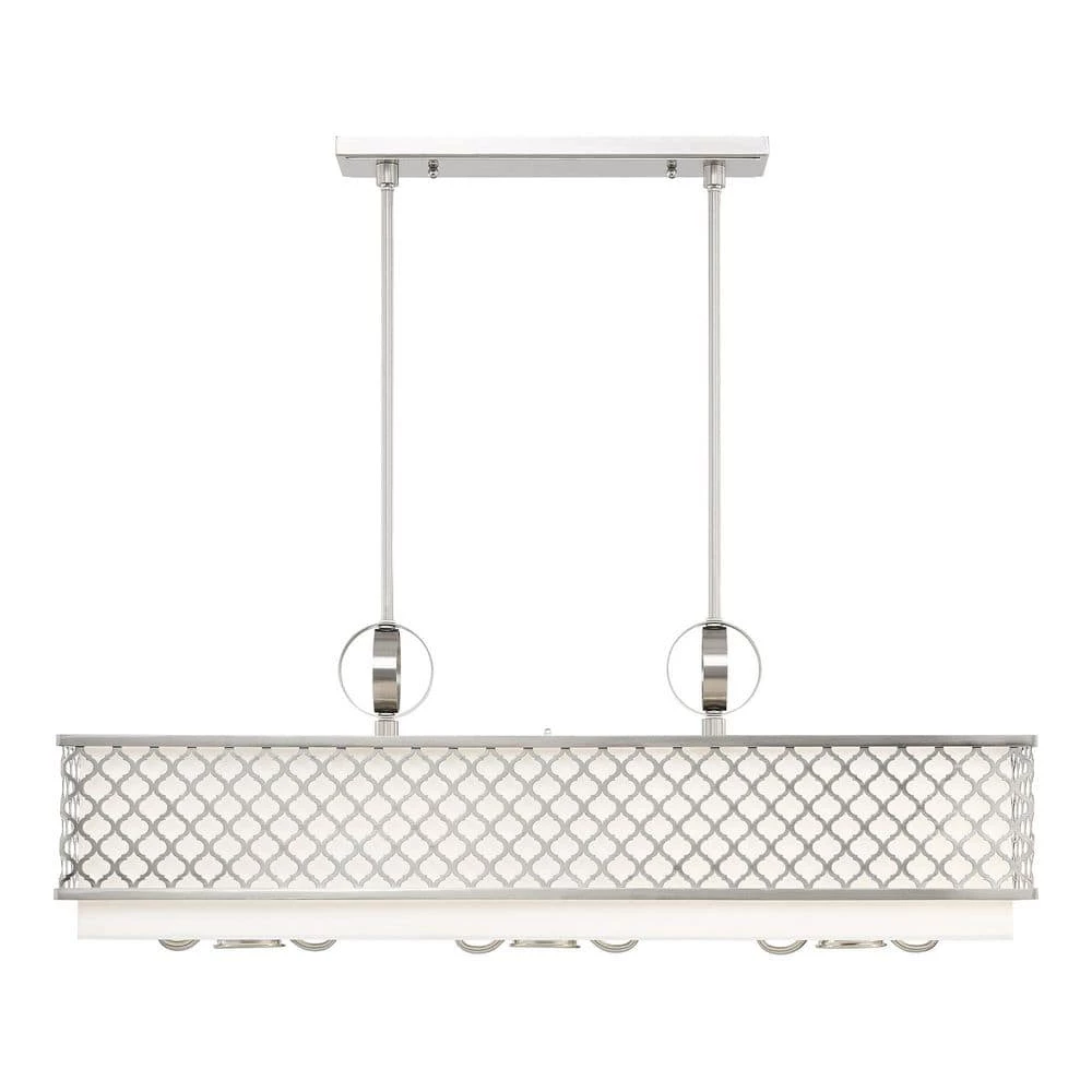 Livex Lighting is well known for quality, style and value. Our Arabesque 6 light linear chandelier with 3 down lights will add refined style and a hint of mystery to your decor. The off-white fabric hardback shade creates a warm illumination, while the light brings to life the intricate brushed nickel cutout pattern. This well-rounded fixture is sure to satisfy your lighting needs.