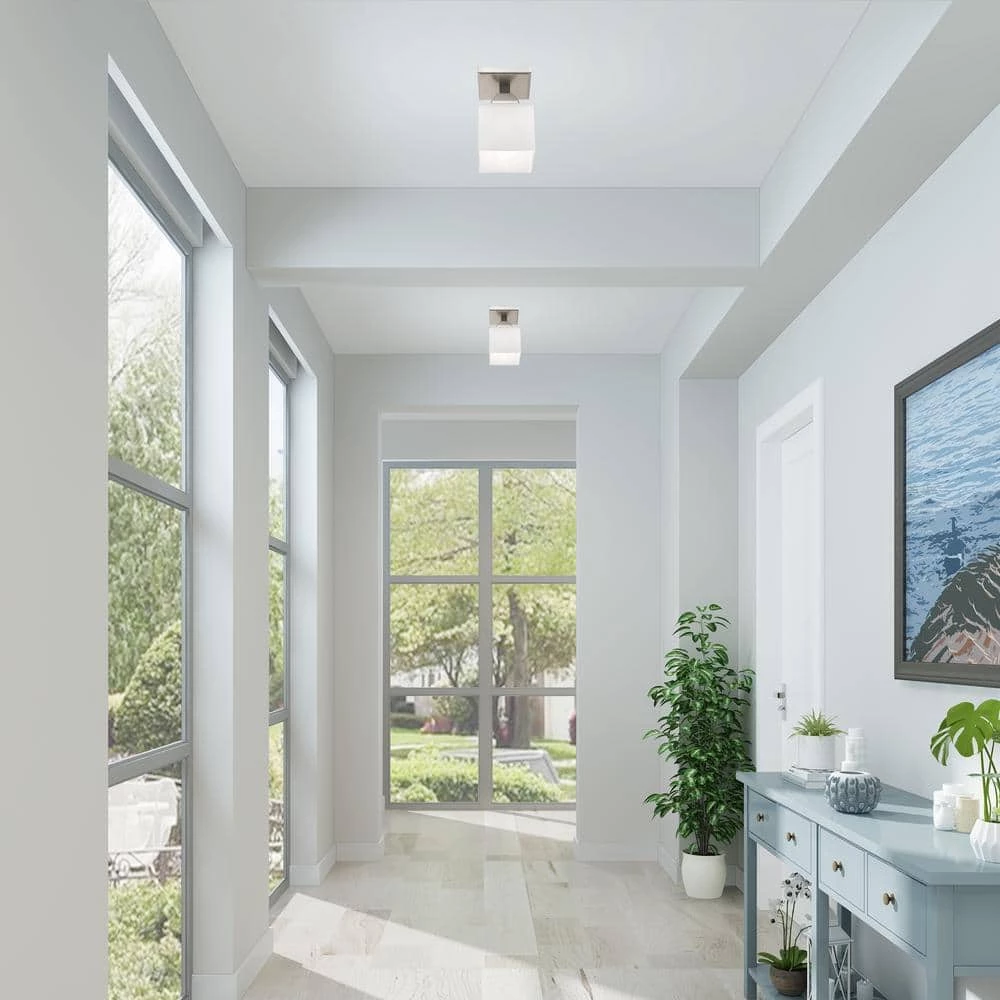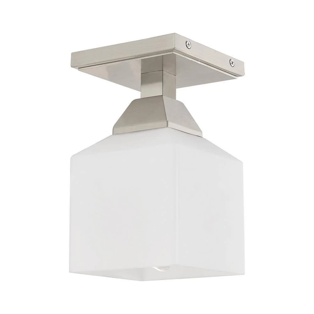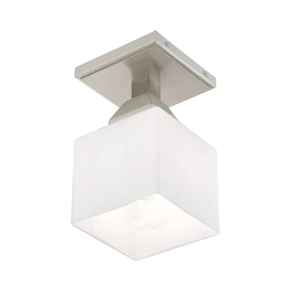 Livex Lighting is well known for quality, style and value. This ceiling mount light is sure to provide reliable illumination without sacrificing style. It features one satin opal white glass shade with an open bottom, exposing the bulb inside. A brushed nickel finish covers the canopy and accents the light. This well-rounded fixture is sure to satisfy your lighting needs.