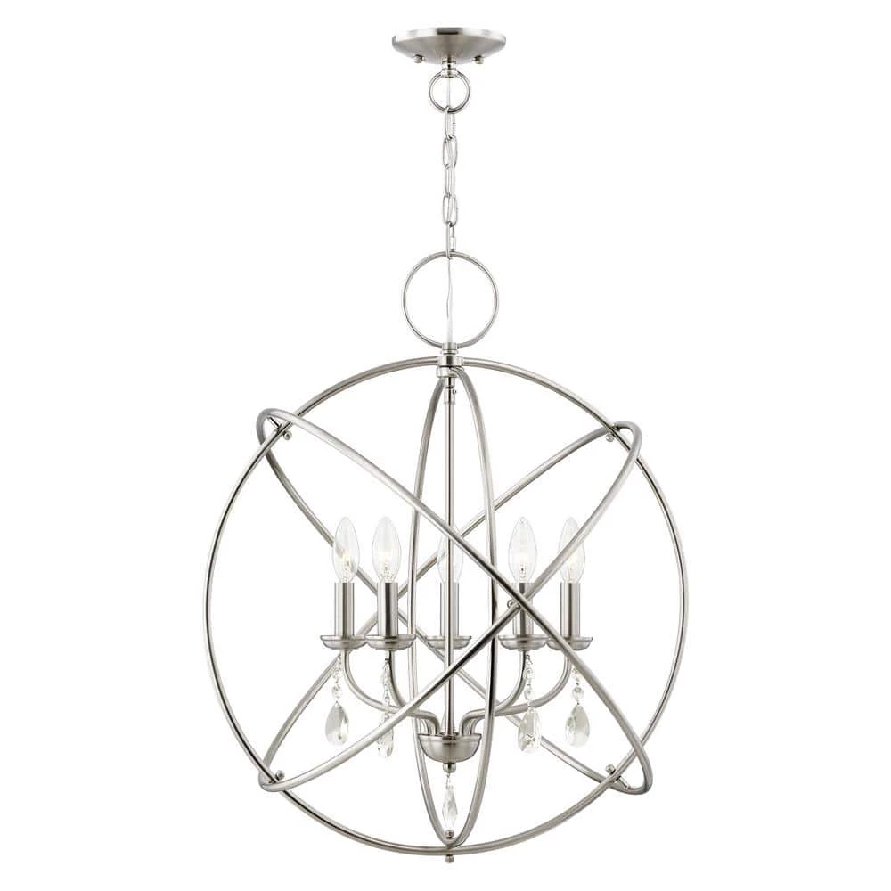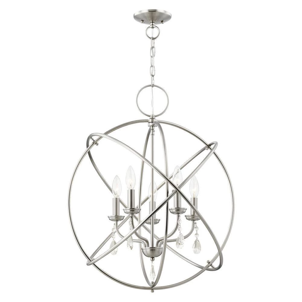 Livex Lighting is well known for quality, style and value. Delicate dangling crystals add a luxurious counterpoint to this brushed nickel orb. The 5 arm cluster nestled within orbiting rings features teardrop crystals. This chandelier is perfect for dining rooms or to give a little pizzazz to your kitchen dining area This well-rounded fixture is sure to satisfy your lighting needs.