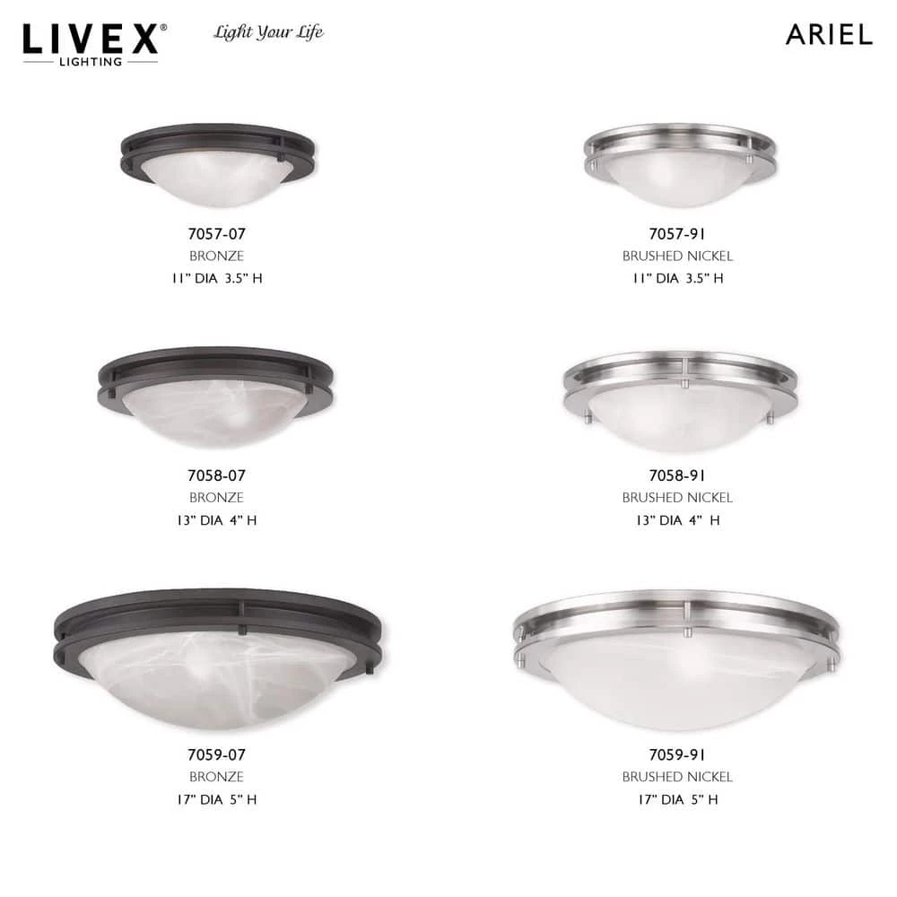 Livex Lighting is well known for quality, style and value. A strong, Art Deco-influenced ceiling light fixture. Features graceful bands of brushed nickel encircling a white alabaster glass. A great lighting look for the kitchen, hallway, bathroom and more. This well-rounded fixture is sure to satisfy your lighting needs.