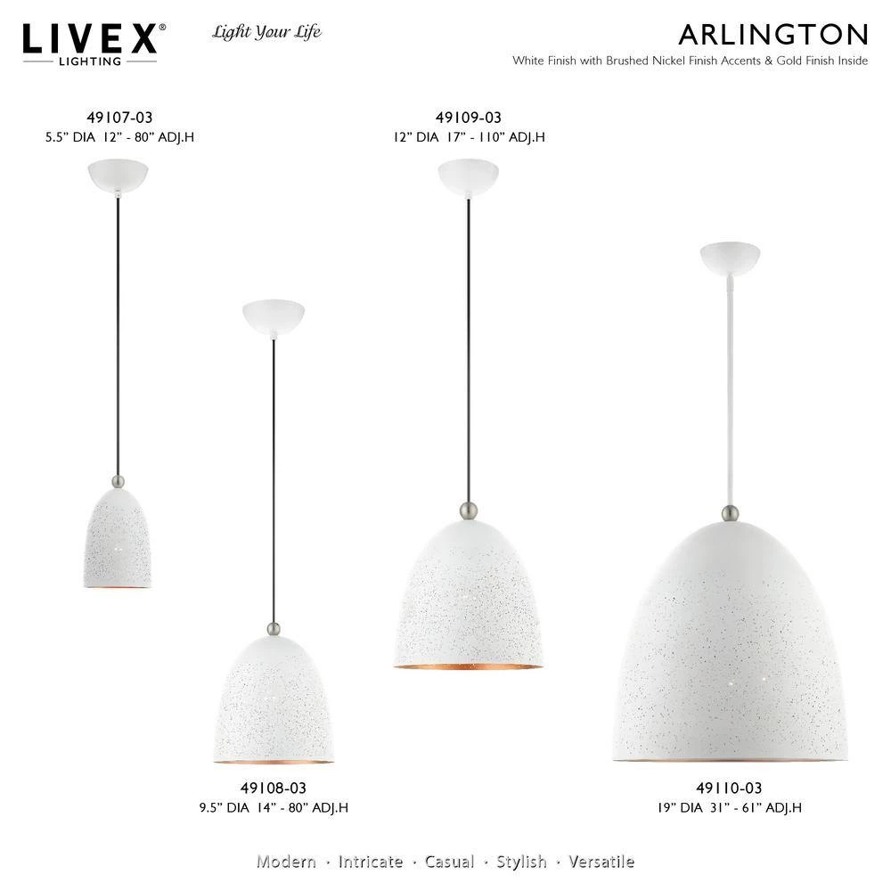 Livex Lighting is well known for quality, style and value. A mini pendant that makes a bold statement in your kitchen, bath or bar area, we present the Arlington. The dynamic design of white outside, gold inside and brushed nickel accents give this mini pendant an innovative and modern look and feel. This well-rounded fixture is sure to satisfy your lighting needs.