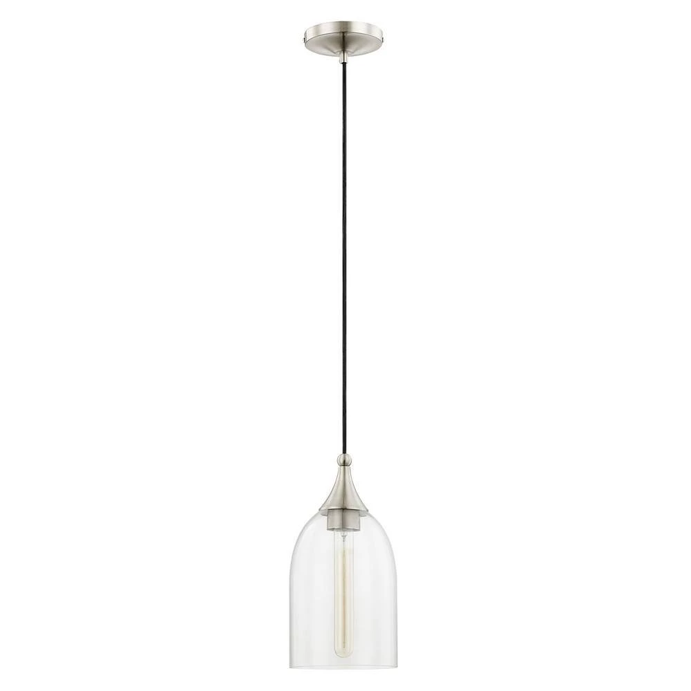 Filament style bulbs showcased in simple shaped hand-blown clear glass add to the authentic charm of this industrial style pendant.