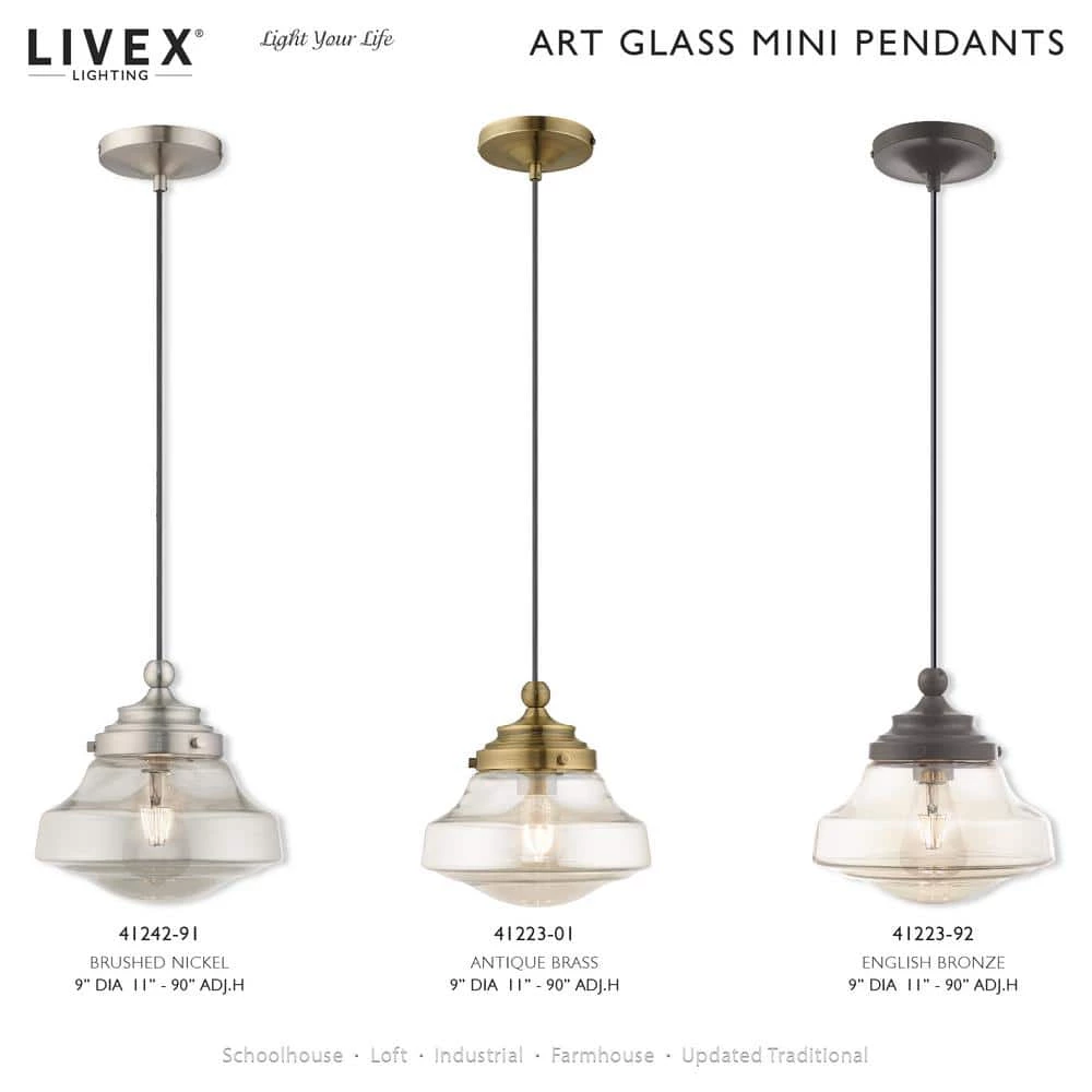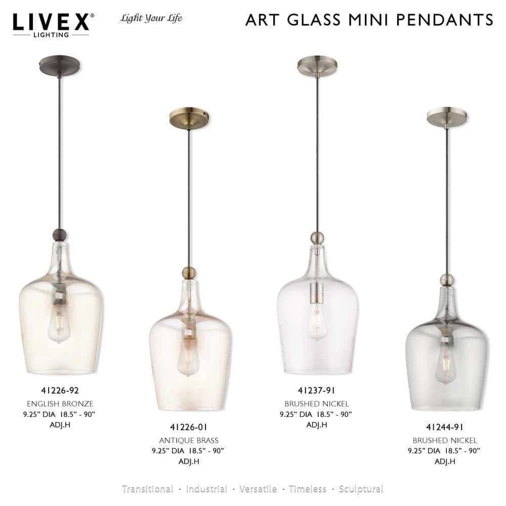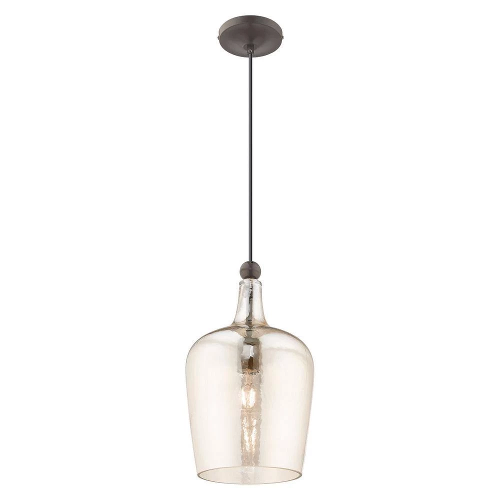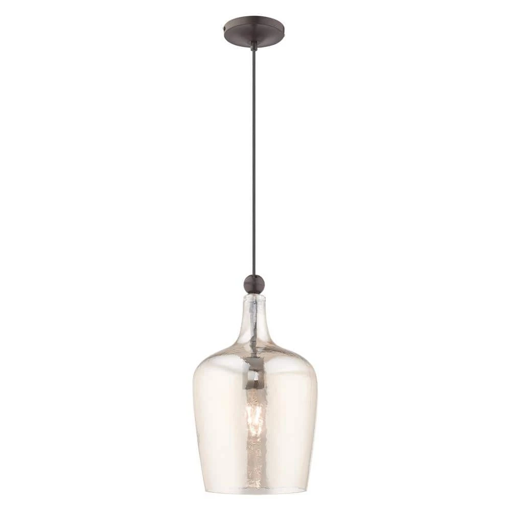 Livex Lighting is well known for quality, style and value. Featuring a black pendant cord and English bronze hardware this graceful carafe shaped champagne glass mini pendant will add a real simple look to any kitchen, bar, and hallway. This well-rounded fixture is sure to satisfy your lighting needs.