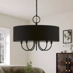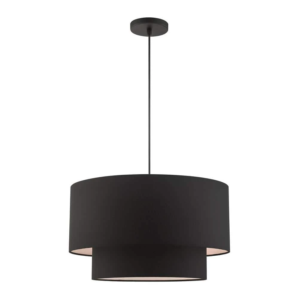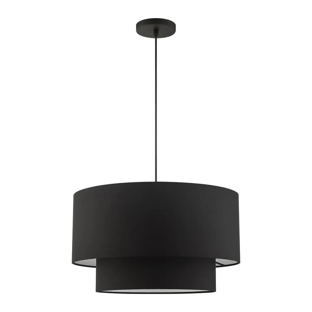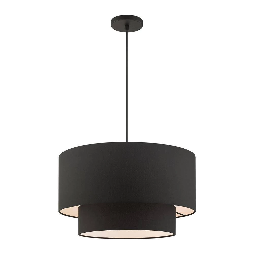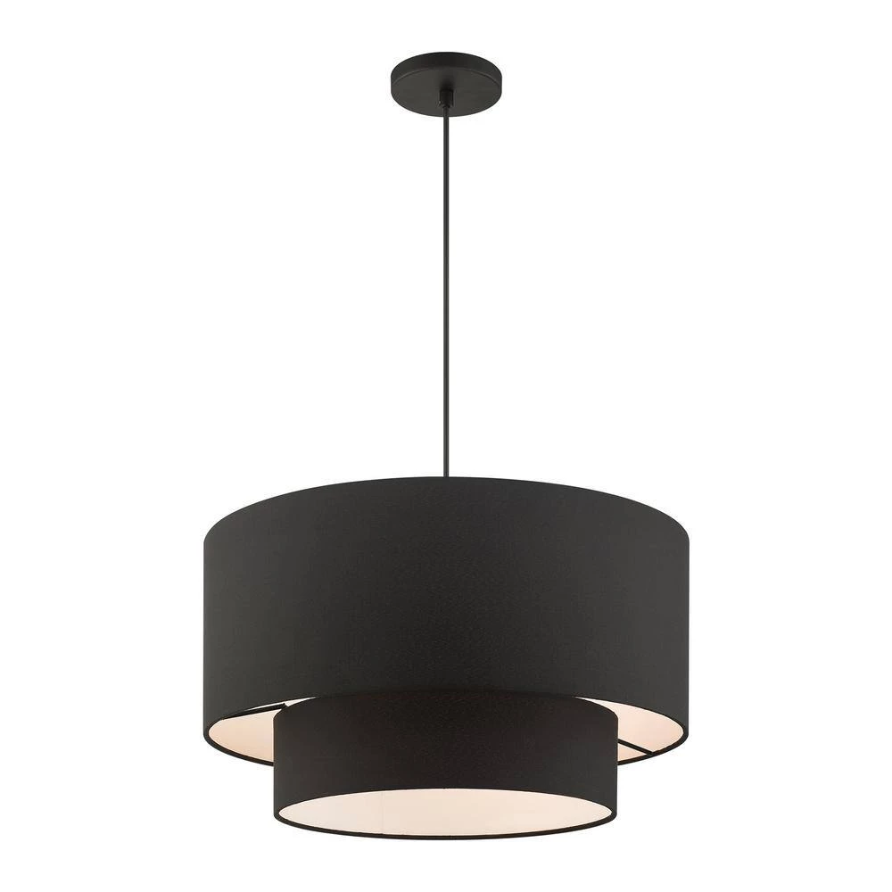 Livex Lighting is well known for quality, style and value. The Bainbridge collection is both modern and versatile. The hand-crafted black fabric hardback shade is set off by the silky white fabric on the inside setting a pleasant mood. The 3-light double drum shade adds character to this handsomely styled pendant. Perfect fit for the living room, dining room, kitchen and bedroom. This sleek design is shown in a black finish. This well-rounded fixture is sure to satisfy your lighting needs.