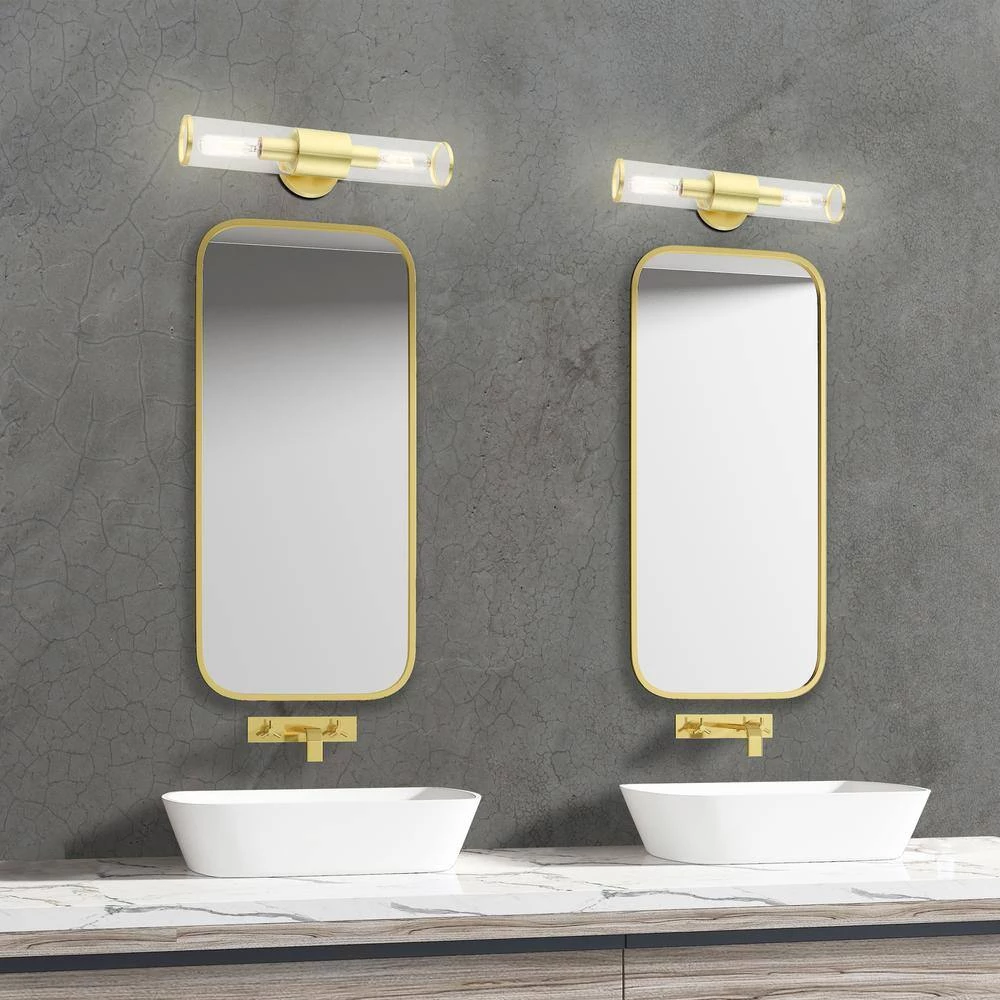 Livex Lighting is well known for quality, style and value. Add a dash of character and radiance to your home with this vanity sconce. This 2-light fixture from the Banca Collection features a satin brass finish with 2 clear hand blown glass cylinder shades on either side, intentionally exposing the bulb inside for a trendy look. The clean lines of the back plate complement the cylindrical glass shades adorned with detailed trim at the end of each glass creating an industrial, sleek, urban look that works well in most of today’s interiors. This fixture adds upscale charm and contemporary aesthetics to your home. This well-rounded fixture is sure to satisfy your lighting needs.