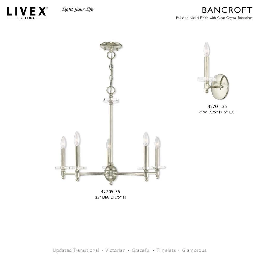 Livex Lighting is well known for quality, style and value. Add an aura of sophistication and elegance with the Bancroft transitional wall sconce. With the polished nickel finish and clear crystal bobeche, it looks especially decadent. The Bancroft collection delivers an inspiring and upscale mood to a new or remodeled bath space. This well-rounded fixture is sure to satisfy your lighting needs.