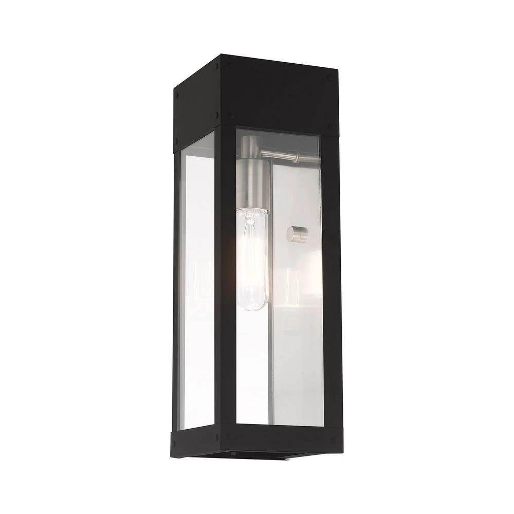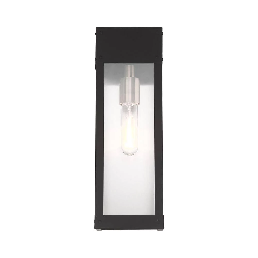 Made of stainless steel this charming, black finish outdoor wall lantern has a versatile look that can be placed almost anywhere. The brushed nickel accent and clear glass adds a traditional touch to the clean, transitional-contemporary lines. With the superb craftsmanship and affordable price this fixture is sure to tastefully indulge your extravagant side.