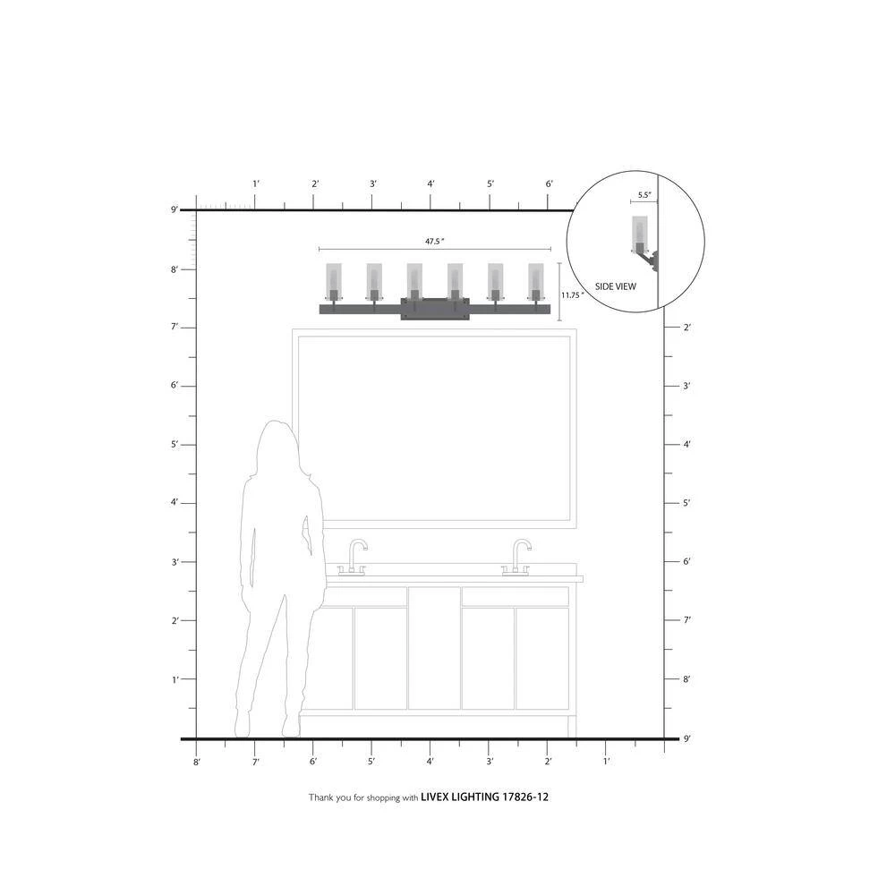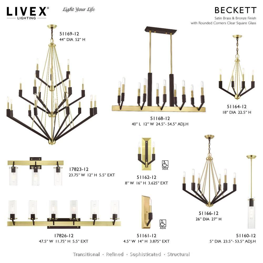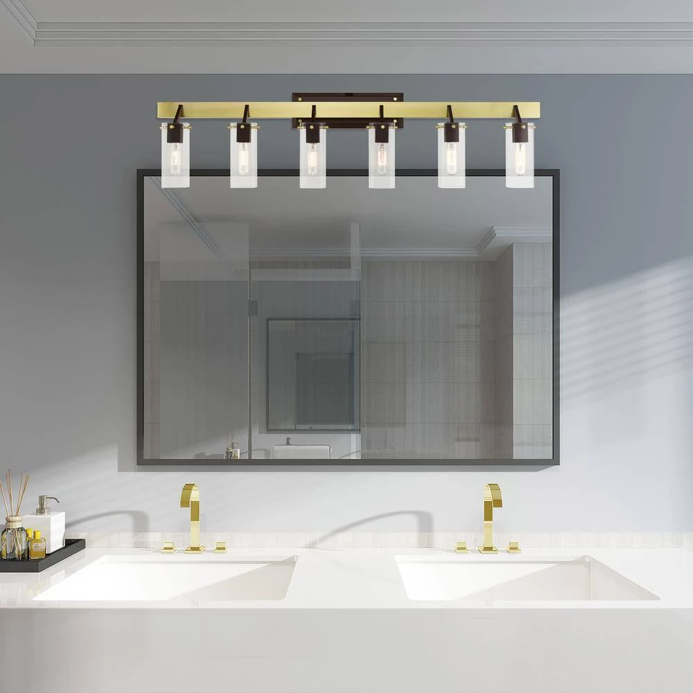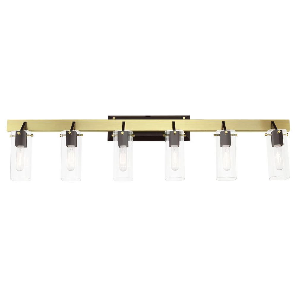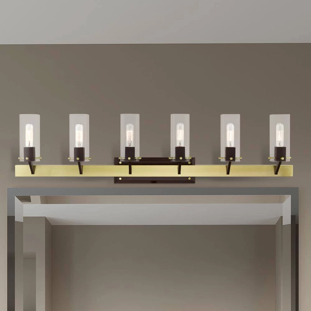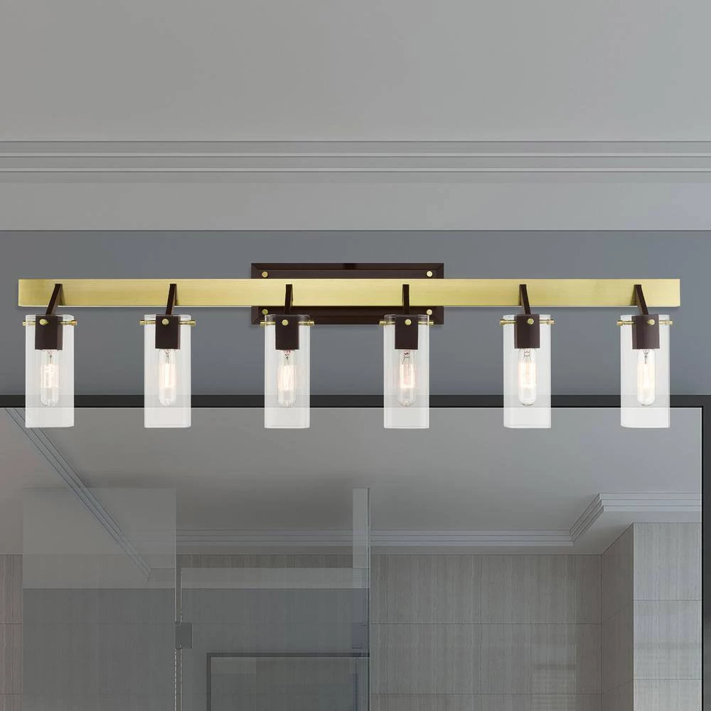 Livex Lighting is well known for quality, style and value. Illuminate your home with a bright design from the Beckett collection. This 6 light vanity sconce is adorned with rounded corners clear square glass shades, emulates a mid-century modern style made popular in the 50s and 60s. The satin brass frame is combined with bronze finish accents. Perfect for a contemporary or transitional luxury bathroom setting. This well-rounded fixture is sure to satisfy your lighting needs.
