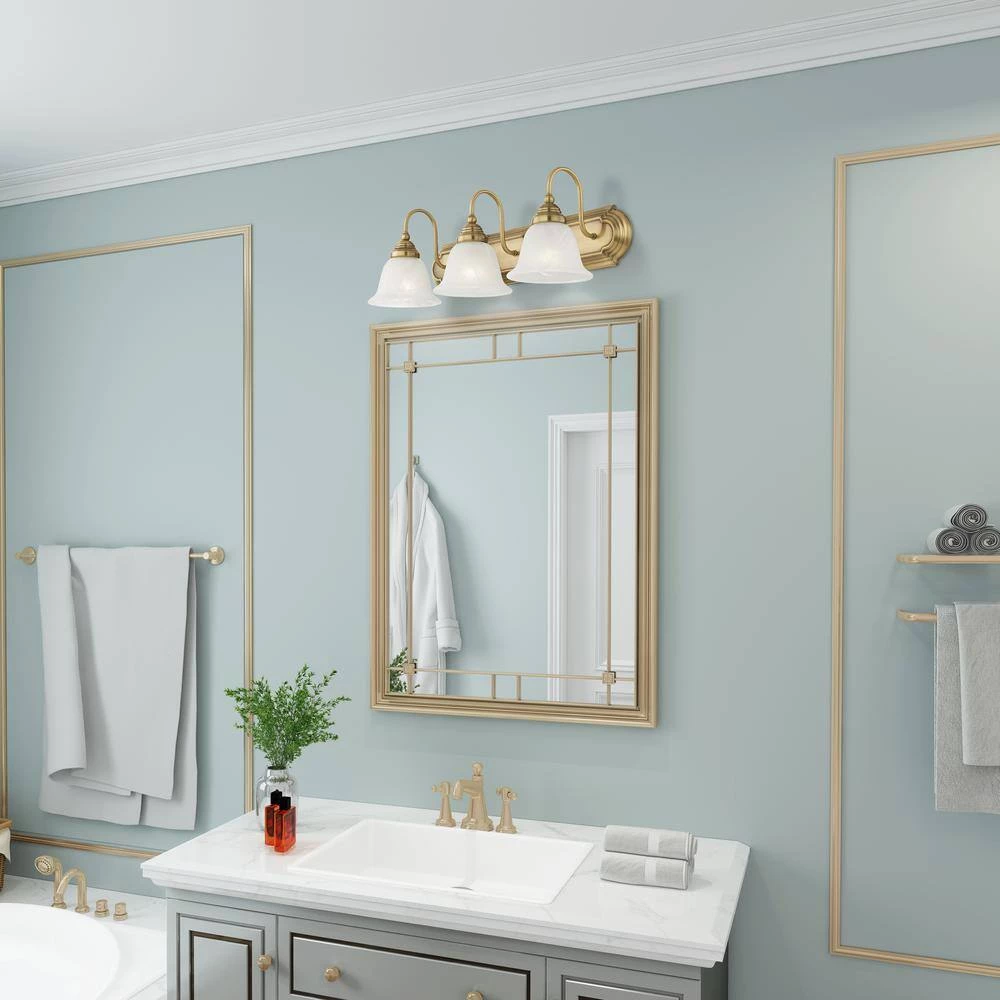 The Belmont bath bracket with sweeping antique brass arcs framing elegant, alabaster swirl glass. The Belmont collection is warm and traditional and will easily become the focal point of your special room. with the superb craftsmanship and affordable price this fixture is sure to tastefully indulge your extravagant side.