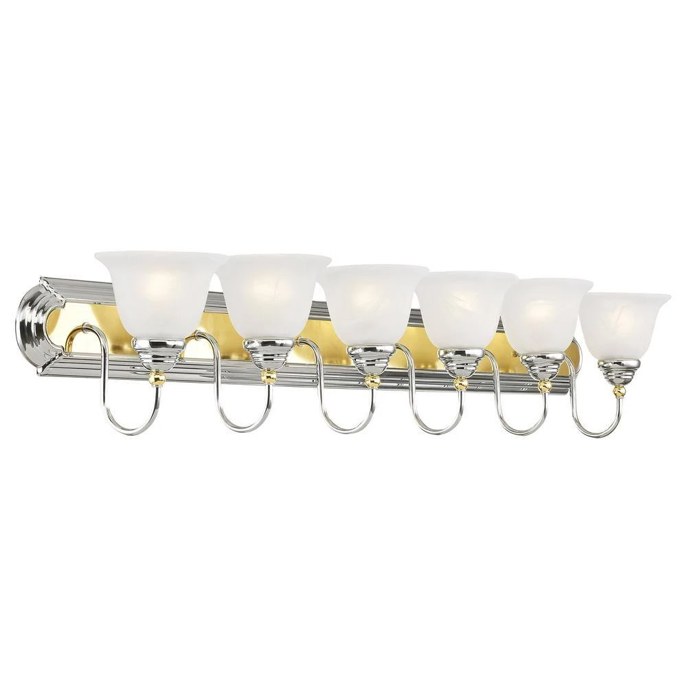 Livex Lighting is well known for quality, style and value. The Belmont bath bracket with polished brass accents and sweeping polished chrome arcs framing elegant, alabaster swirl glass. The Belmont collection is warm and traditional and will easily become the focal point of your special room. This well-rounded fixture is sure to satisfy your lighting needs.