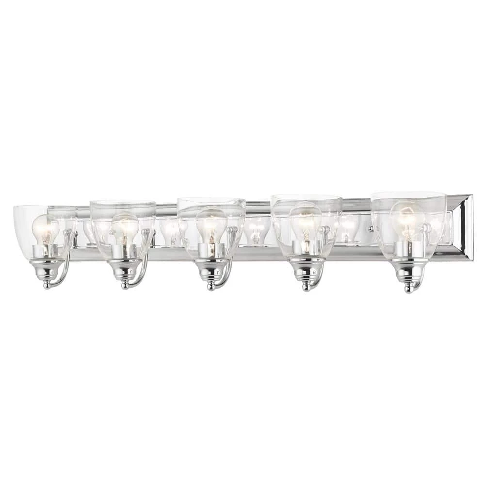 Livex Lighting is well known for quality, style and value. Bring a beautiful new look to your bathroom or vanity area with this charming large 5-light vanity sconce from the Birmingham collection. A wide rectangular polished chrome finish back plate supports 5 simple graceful arms that hold 5 hand blown clear glass shades. The clean lines of this updated classic will make this piece an appealing part of your home. This well-rounded fixture is sure to satisfy your lighting needs.