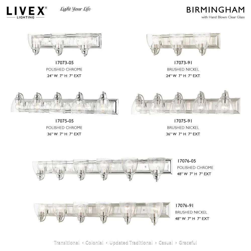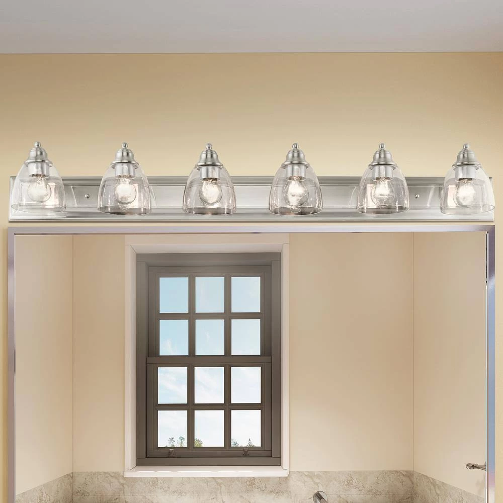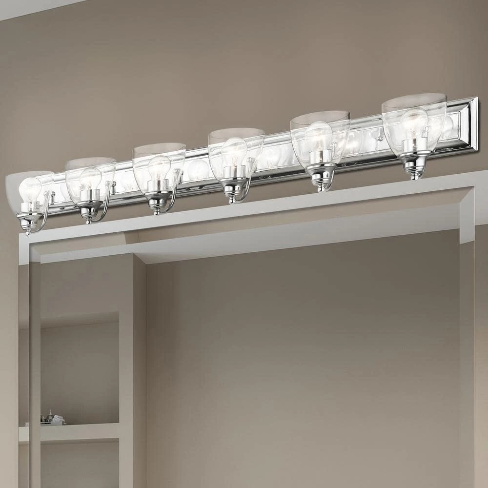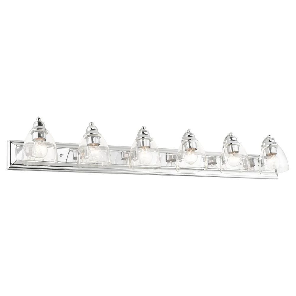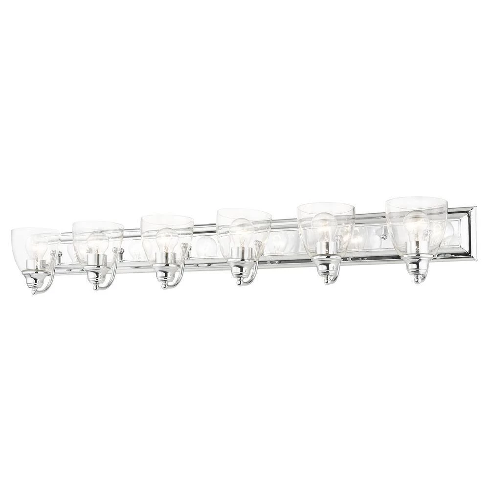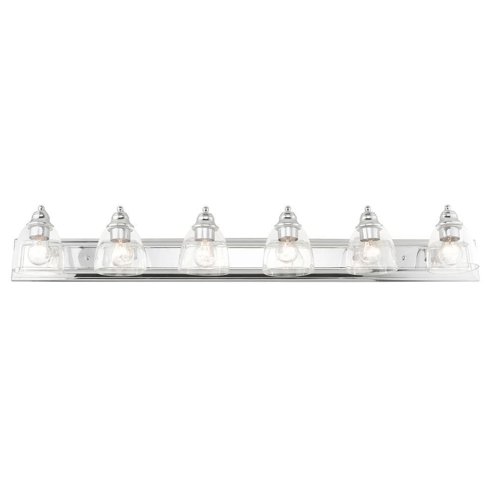 Livex Lighting is well known for quality, style and value. Bring a beautiful new look to your bathroom or vanity area with this charming extra-large six-light vanity sconce from the Birmingham collection. A wide rectangular polished chrome finish back plate supports 6 simple graceful arms that hold 6 hand blown clear glass shades. The clean lines of this updated classic will make this piece an appealing part of your home. This well-rounded fixture is sure to satisfy your lighting needs.