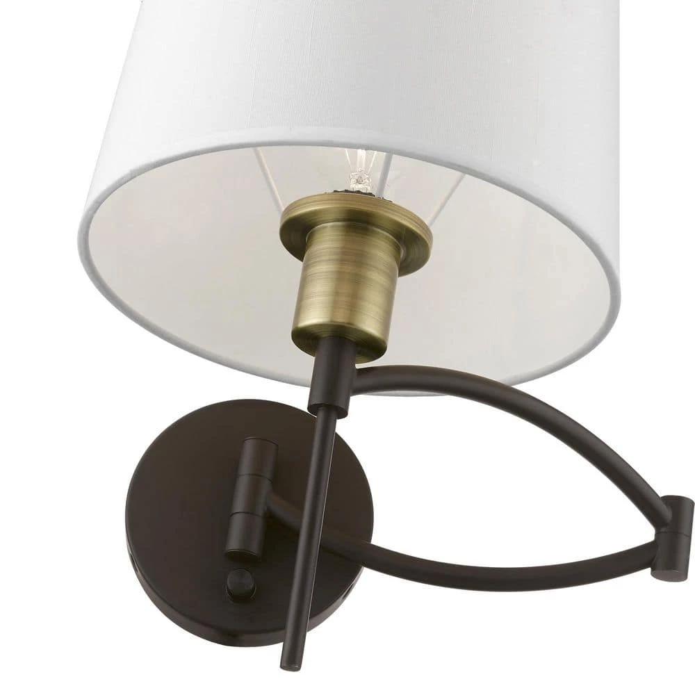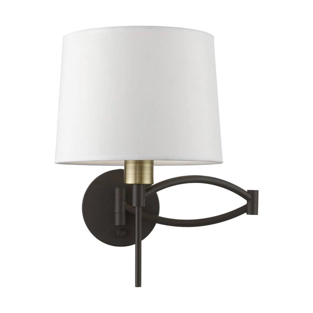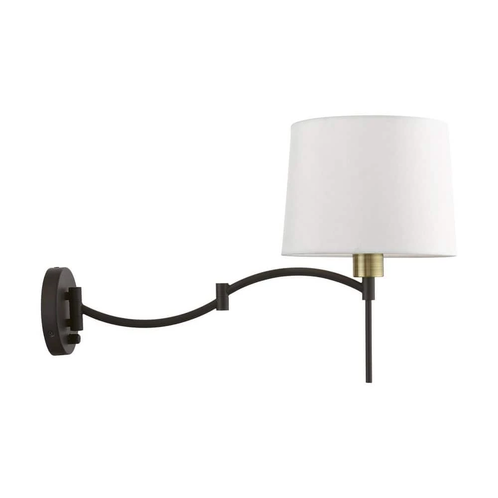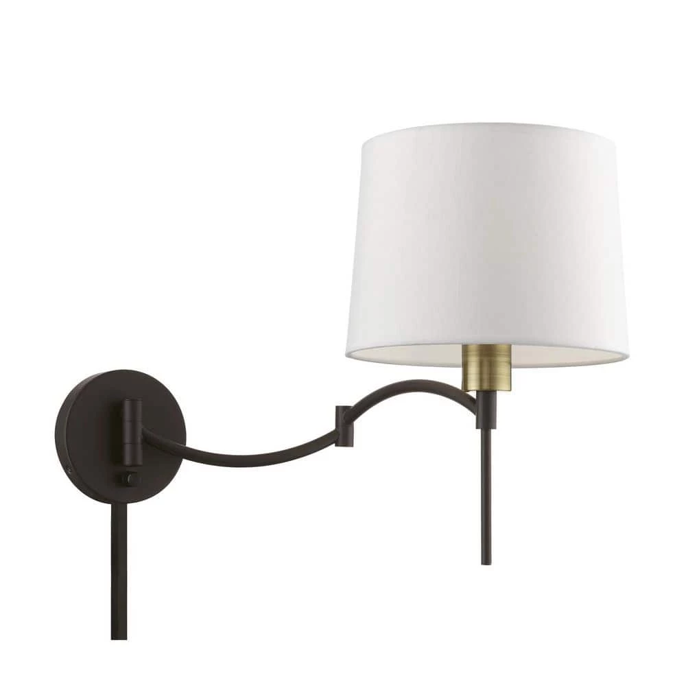 The easy combination of gentle curves and straight lines bring the perfect balance to this plug-in/hardwired swing arm wall lamp. In a bronze finish with an antique brass finish accent and a hand crafted off white hardback shade, this transitional lamp is handsome and just right for bringing functional lighting style to any home. With the superb craftsmanship and affordable price this fixture is sure to tastefully indulge your extravagant side.