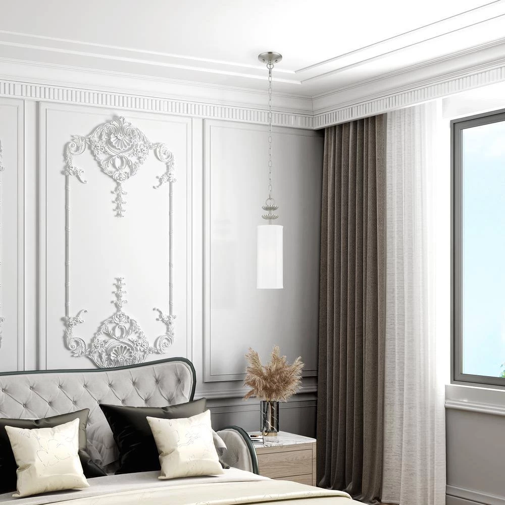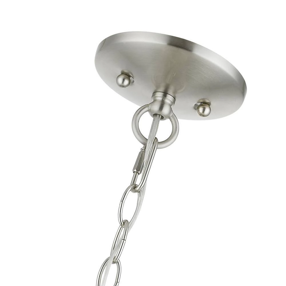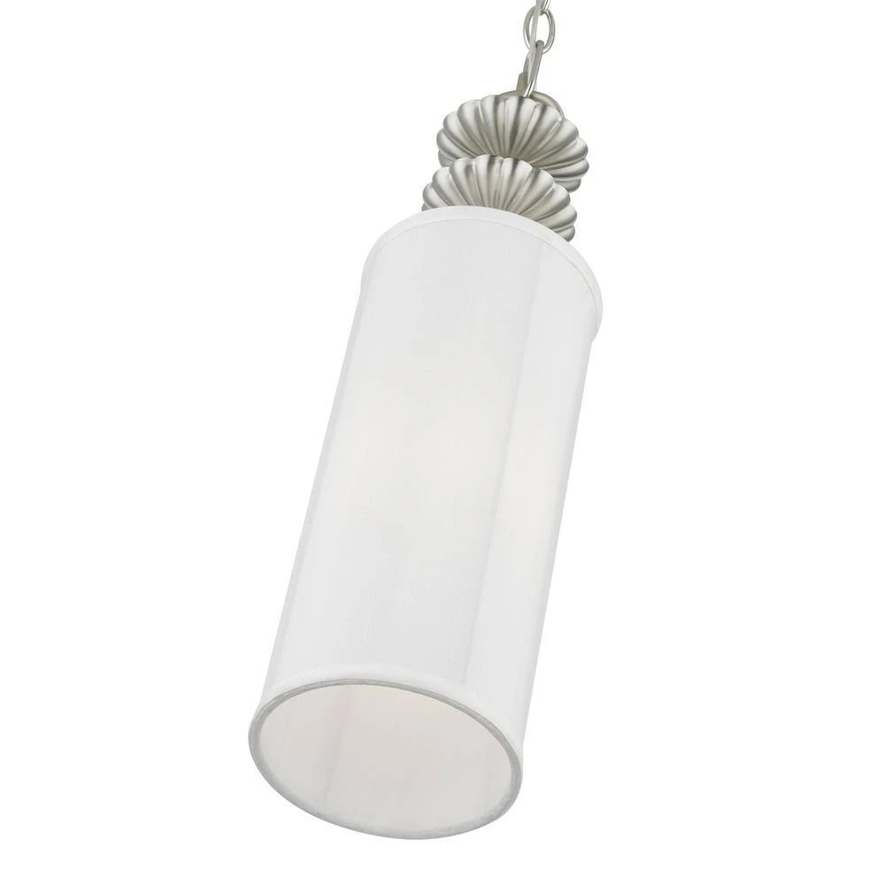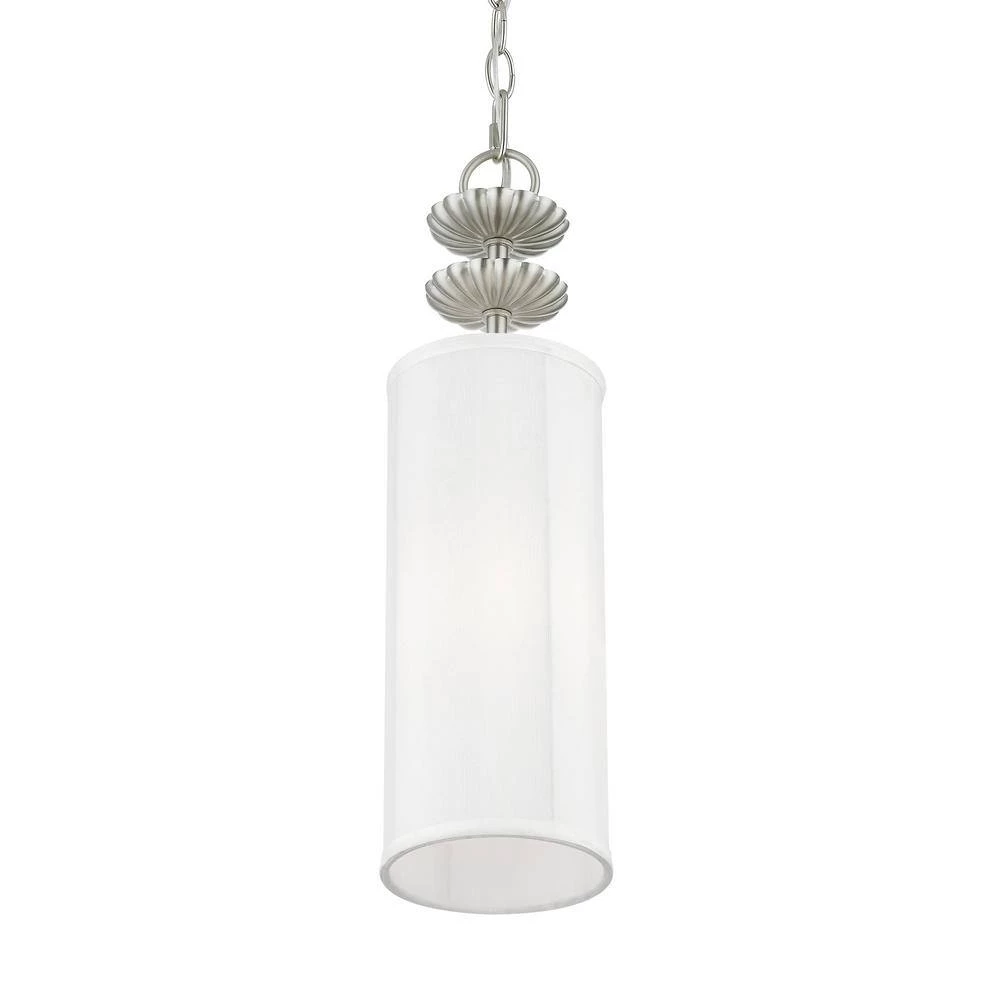 The single light brushed nickel finish Brookdale mini pendant combines floral details and casual elements to create an updated look. The hand-crafted off-white fabric hardback drum shade is set off by an inner silky white fabric which creates a versatile effect. With the superb craftsmanship and affordable price this fixture is sure to tastefully indulge your extravagant side.
