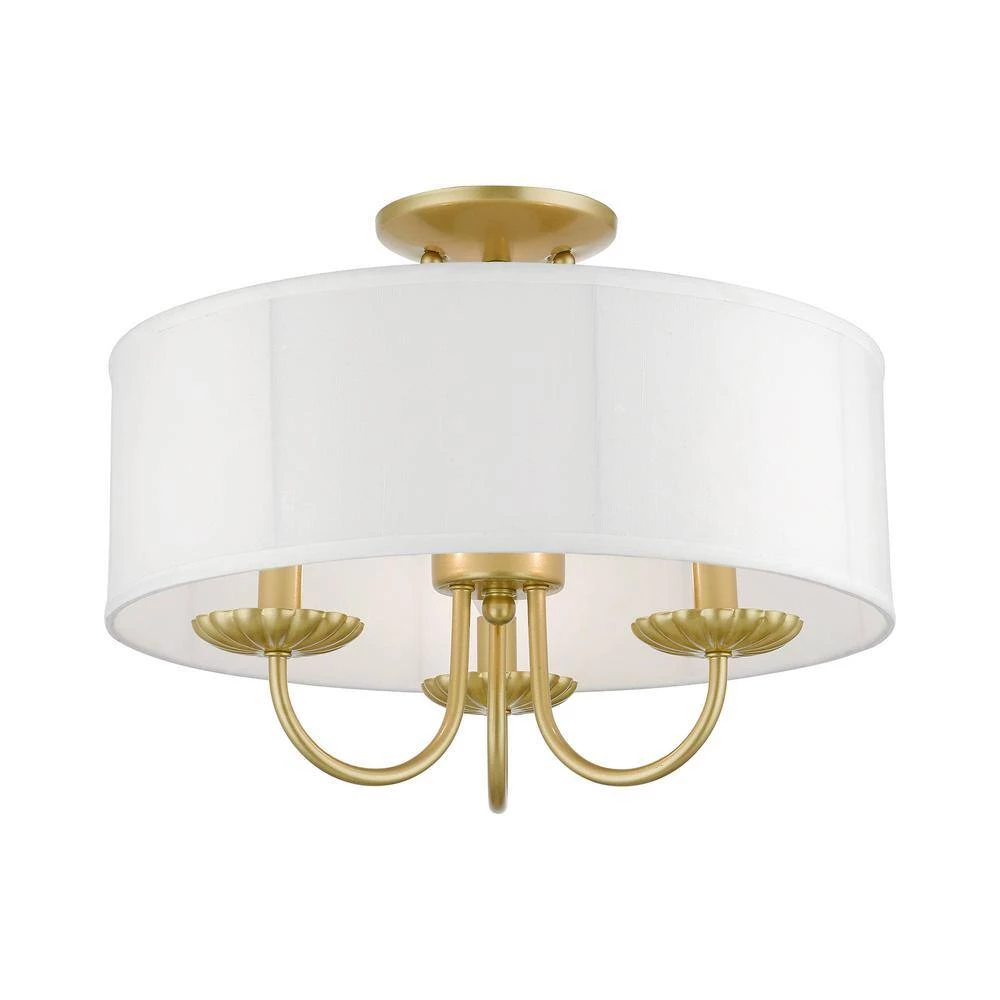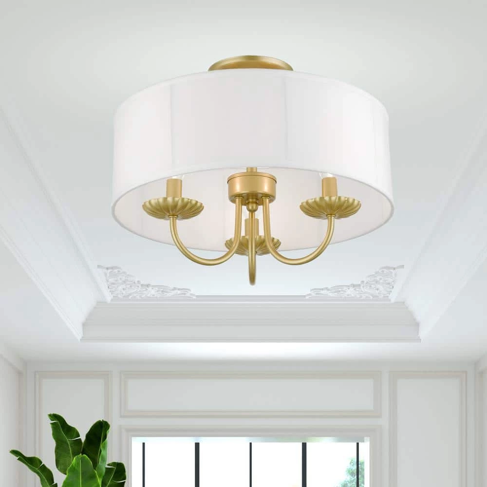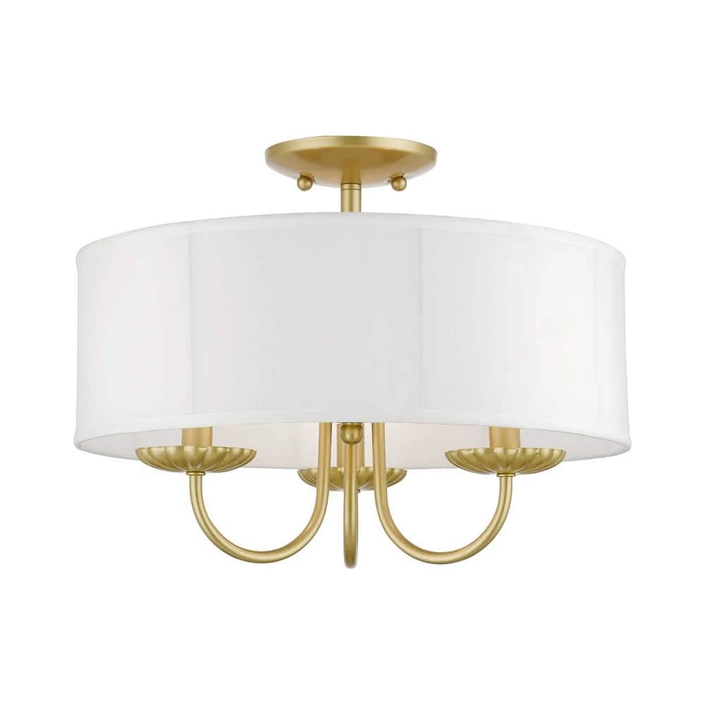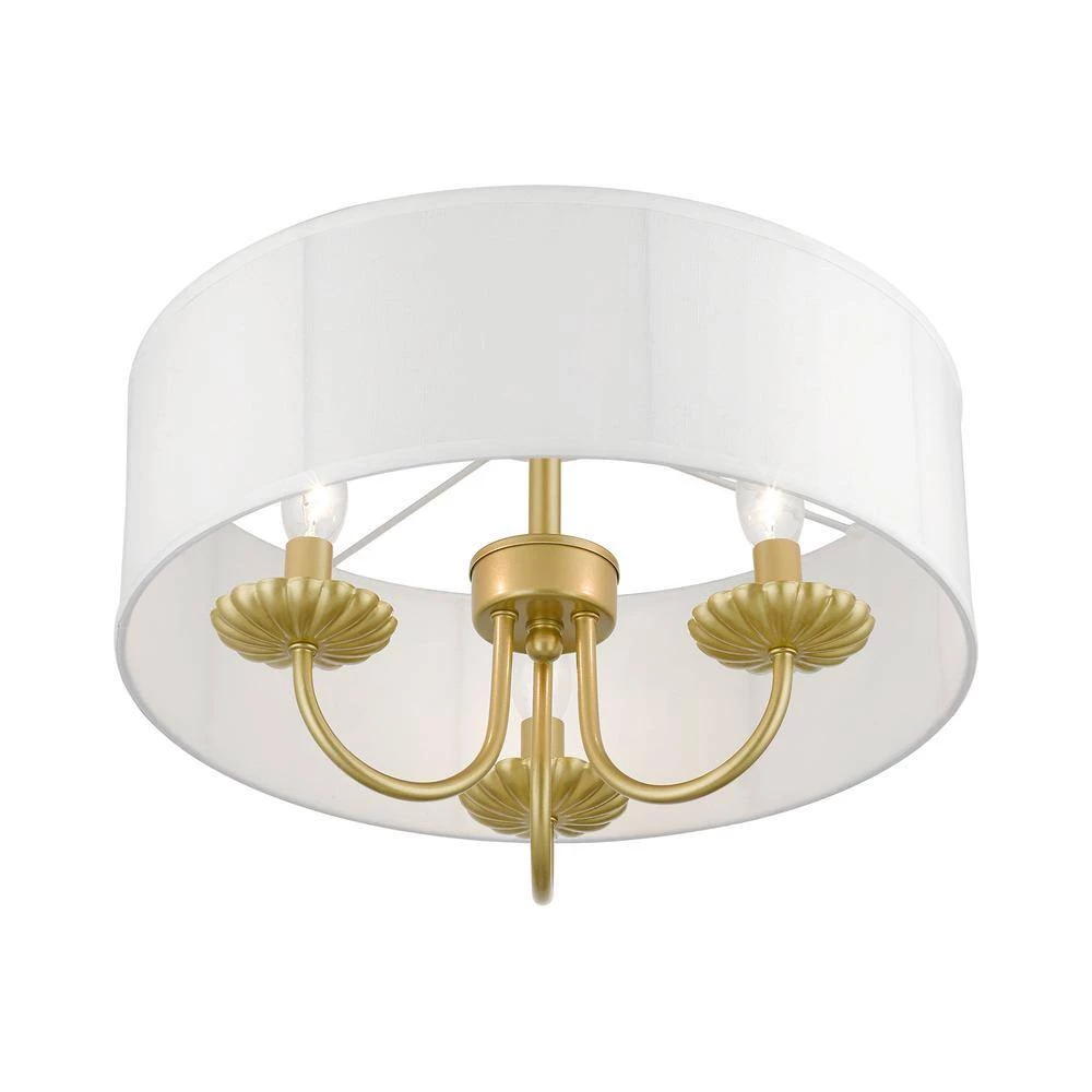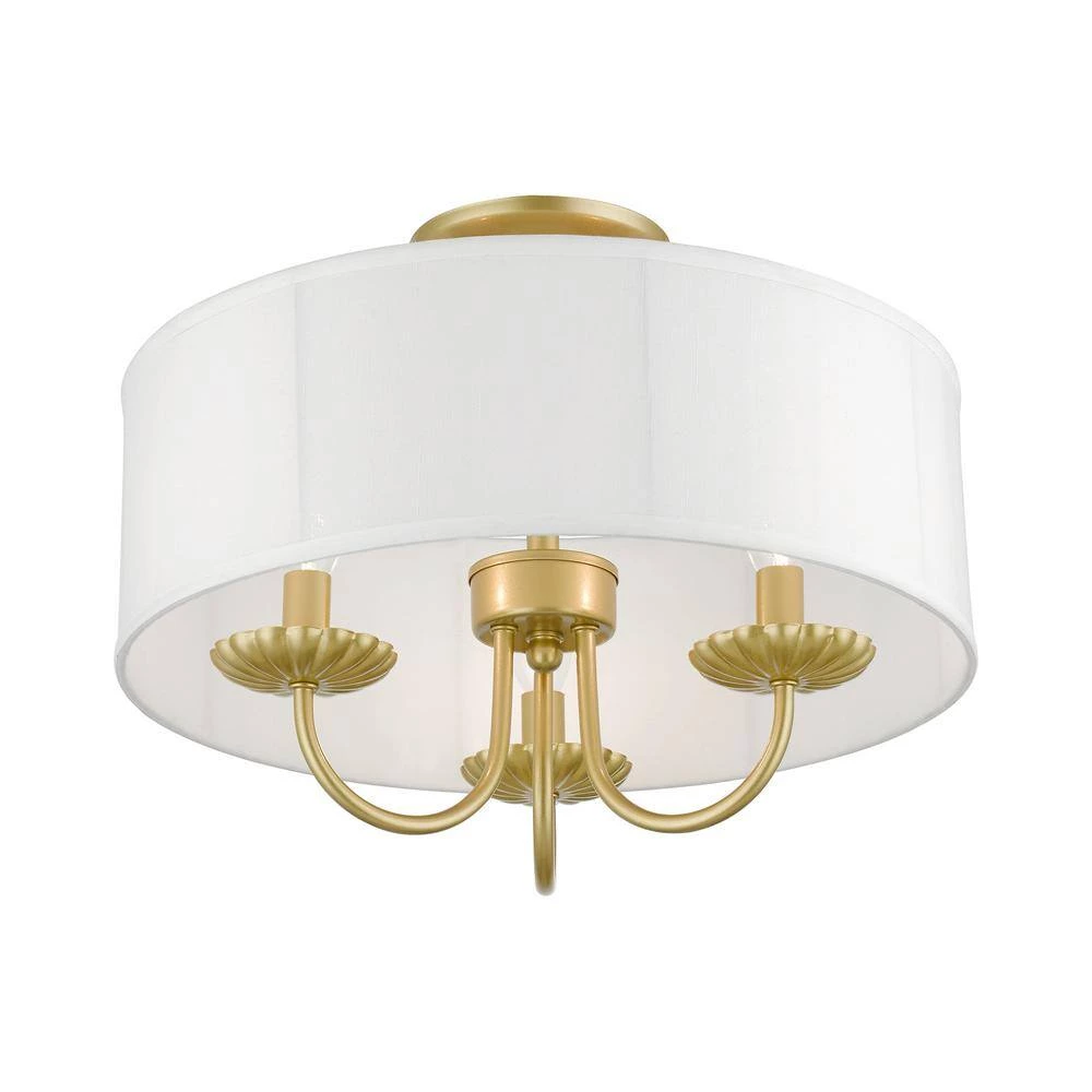 The 3-light Brookdale semi-flush combines floral details and casual elements to create an updated look. The hand-crafted off-white fabric hardback drum shade is set off by an inner silky white fabric that combines with chandelier-like soft gold finish sweeping arms which creates a versatile effect. Perfect fit for the living room, dining room, kitchen or bedroom.