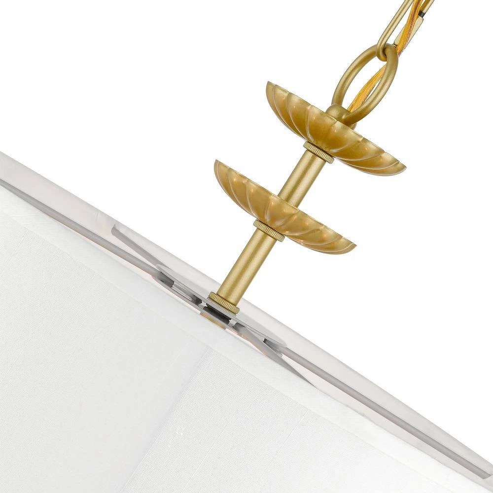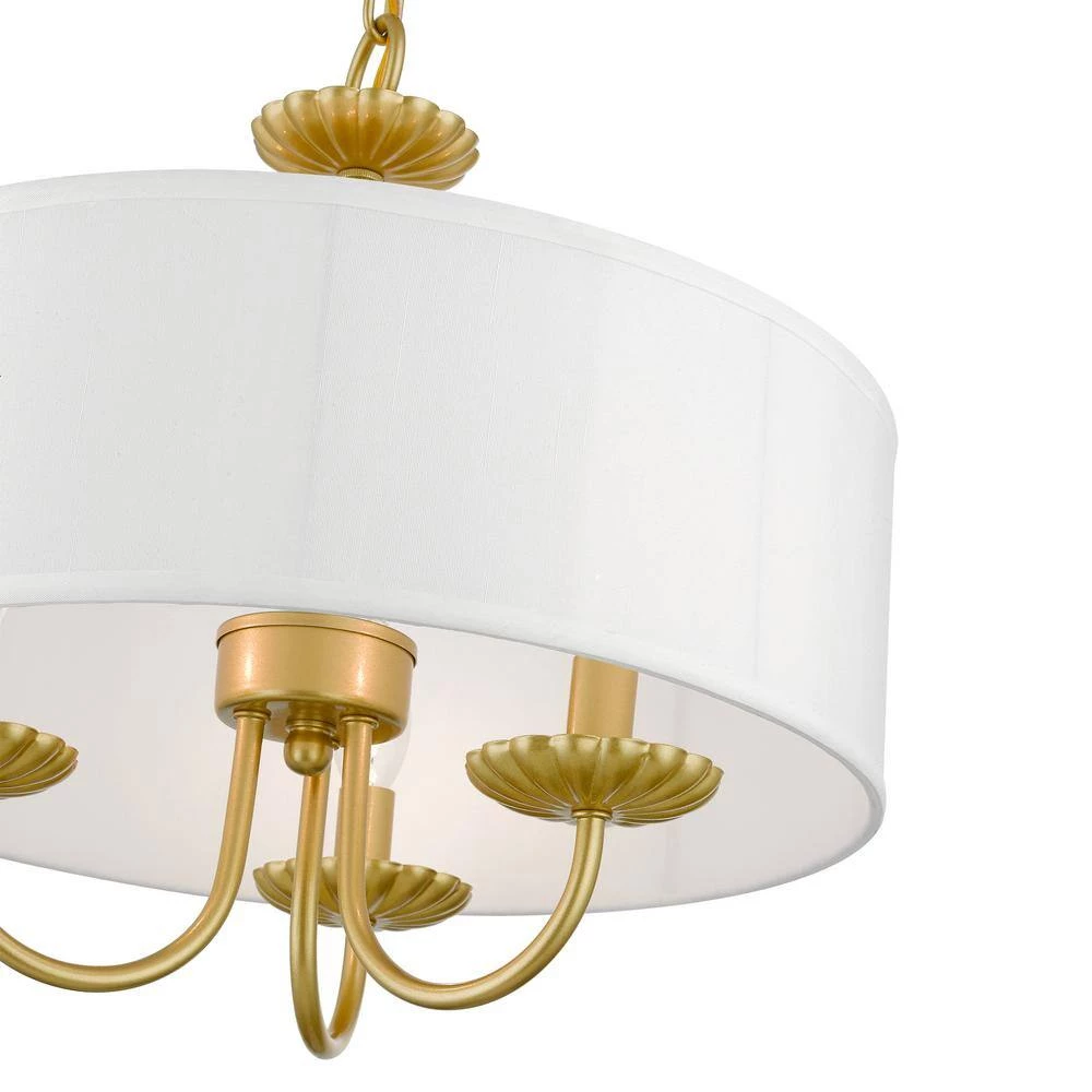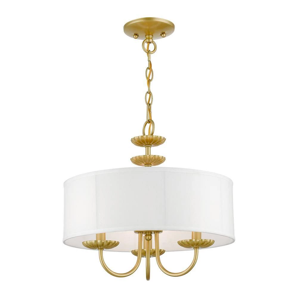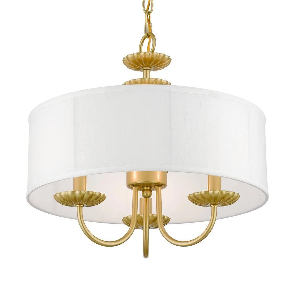 The 3-light Brookdale pendant chandelier combines floral details and casual elements to create an updated look. The hand-crafted off-white fabric hardback drum shade is set off by an inner silky white fabric that combines with chandelier-like soft gold finish sweeping arms which creates a versatile effect. Perfect fit for the living room, dining room, kitchen or bedroom.