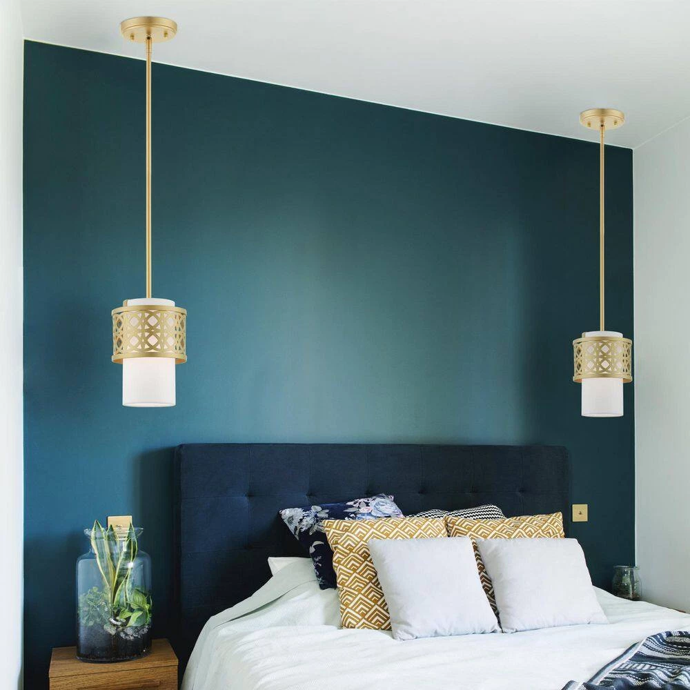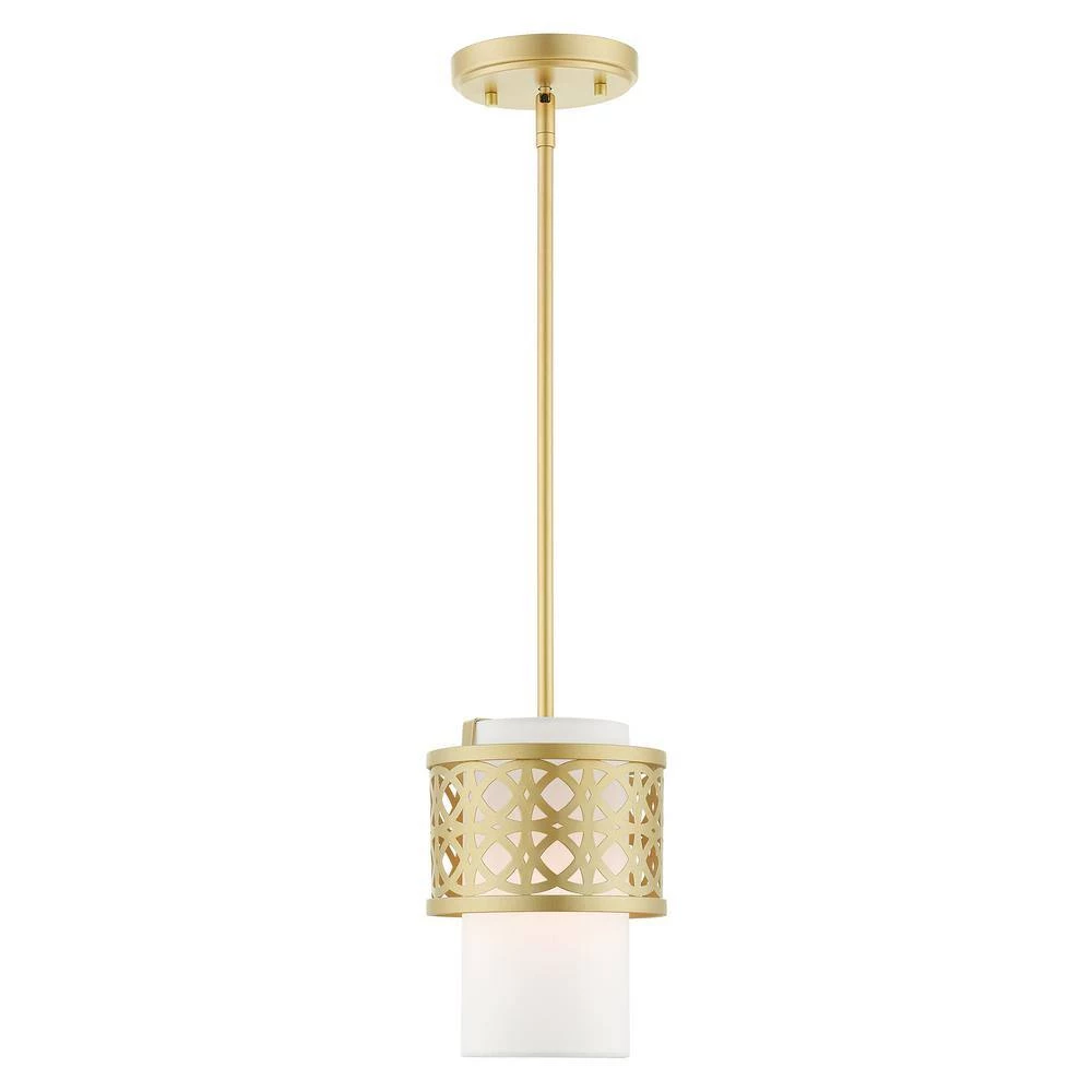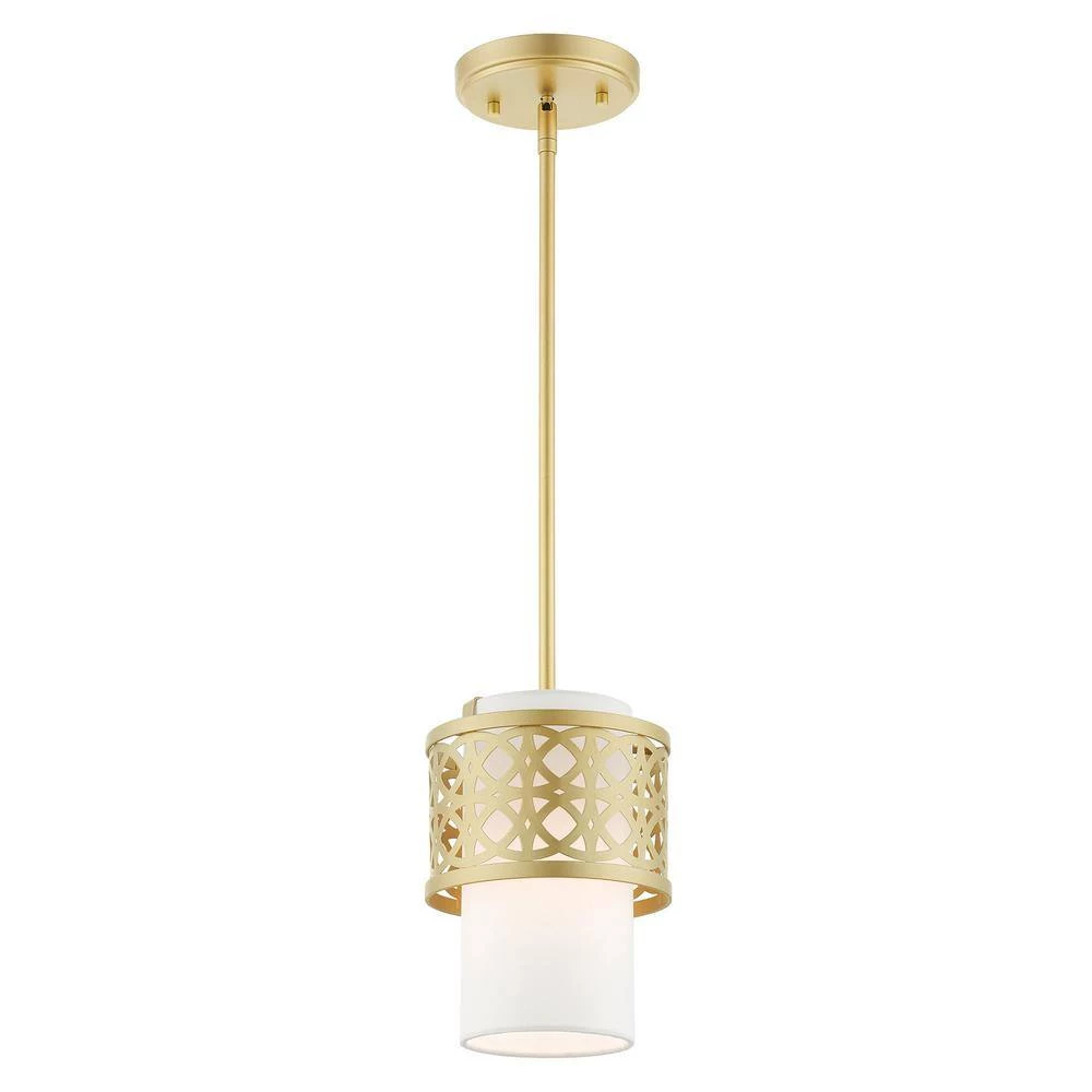 Livex Lighting is well known for quality, style and value. The transitional Calinda series adds refined style and a hint of mystery to your decor. The soft gold finish and an off-white handcrafted hardback shade create warm illumination, while soft light brings to life the intricate fretwork pattern. This single-light mini pendant will add a sophisticated and glamorous look to almost any interior design style. It will work great in the living room or over the dining table in multiples, bathroom or in the bedroom over the nightstand. This well-rounded fixture is sure to satisfy your lighting needs.