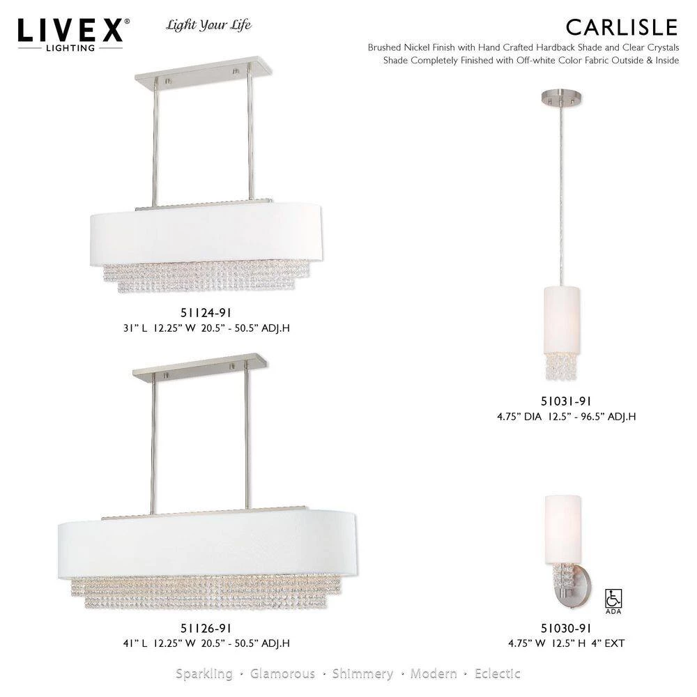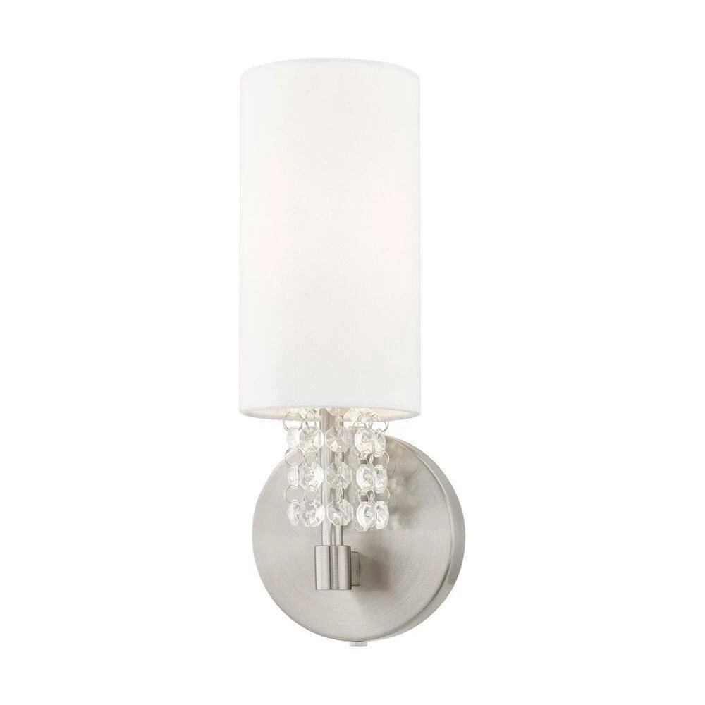 A contemporary style wall sconce from the Carlisle collection. The design features a brushed nickel wall sconce, with hanging strands of beautiful clear crystal. The crystal drapes from a hand crafted off white fabric hardback shade and creates a magnificently sophisticated look.