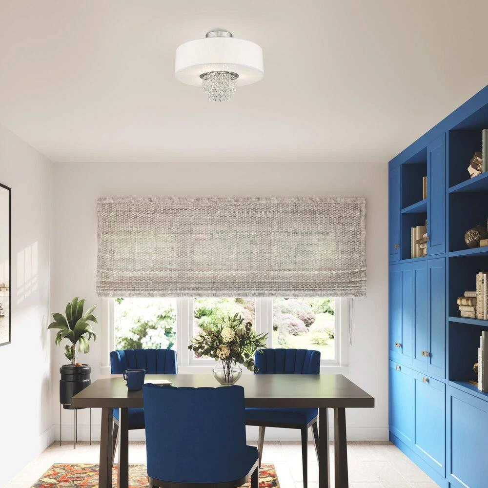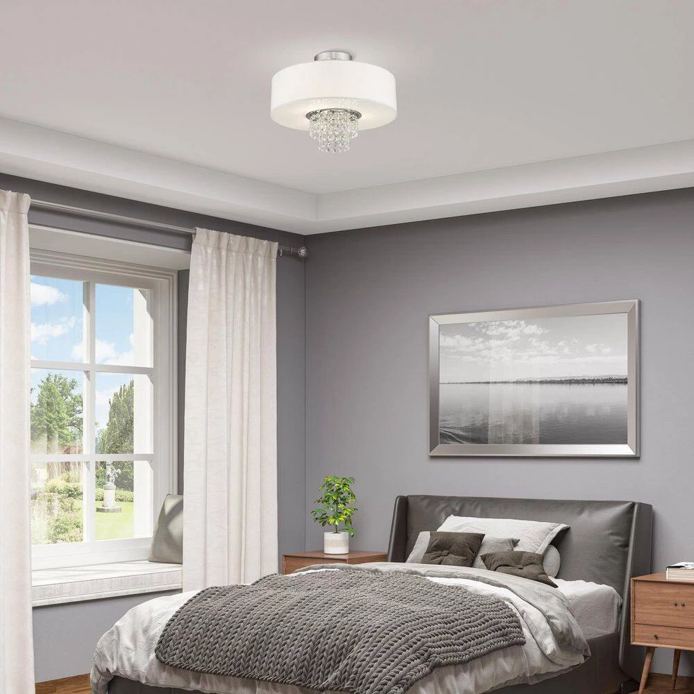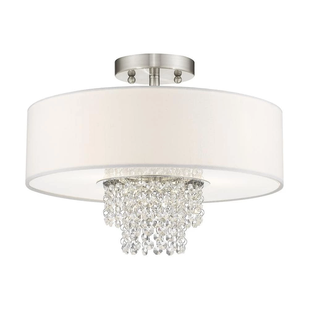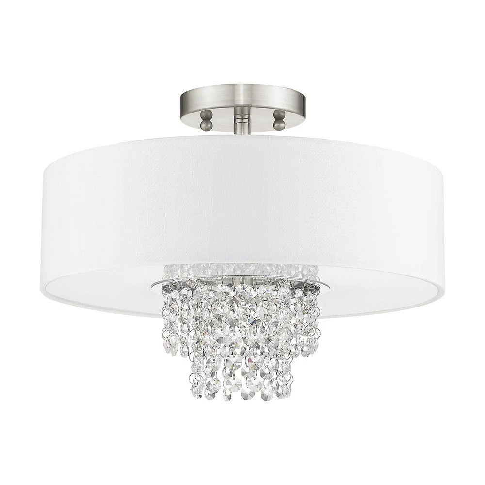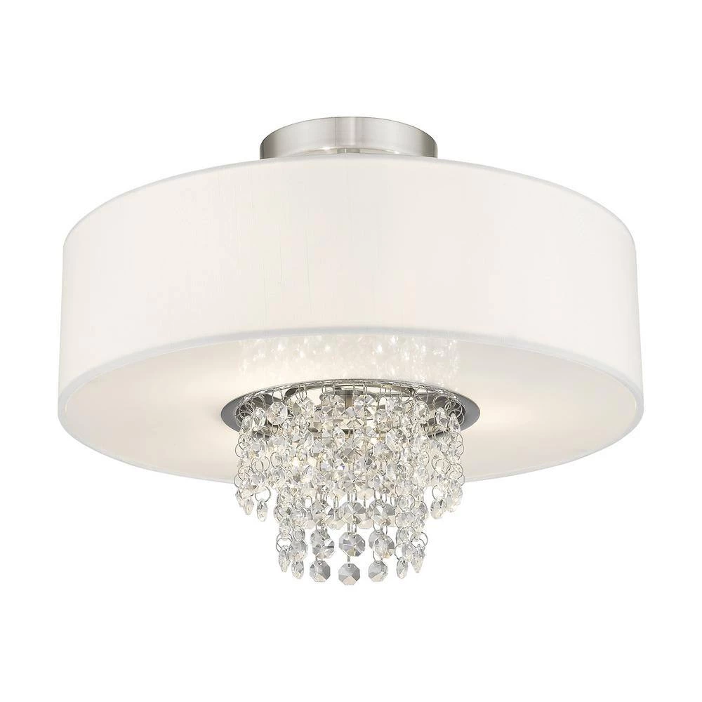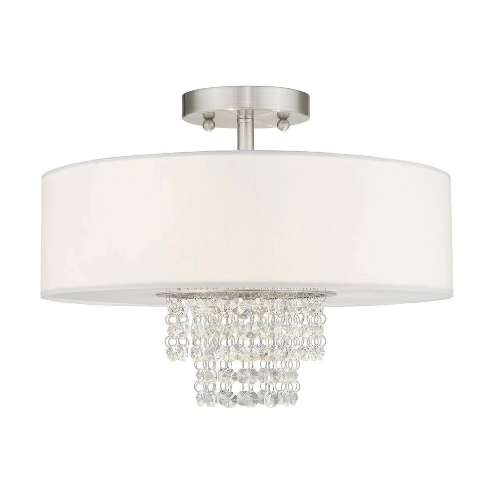 Livex Lighting is well known for quality, style and value. A contemporary style semi flush mount from the Carlisle collection. The design features a brushed nickel housing and canopy, with hanging strands of beautiful clear crystal. A hand crafted off white fabric hardback drum shade surrounds the crystals and fixture frame, and creates a magnificently sophisticated look. This well-rounded fixture is sure to satisfy your lighting needs.