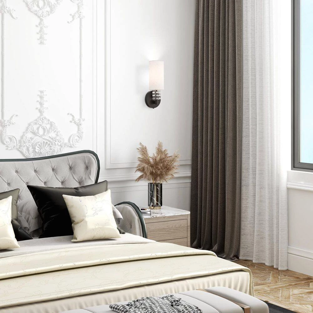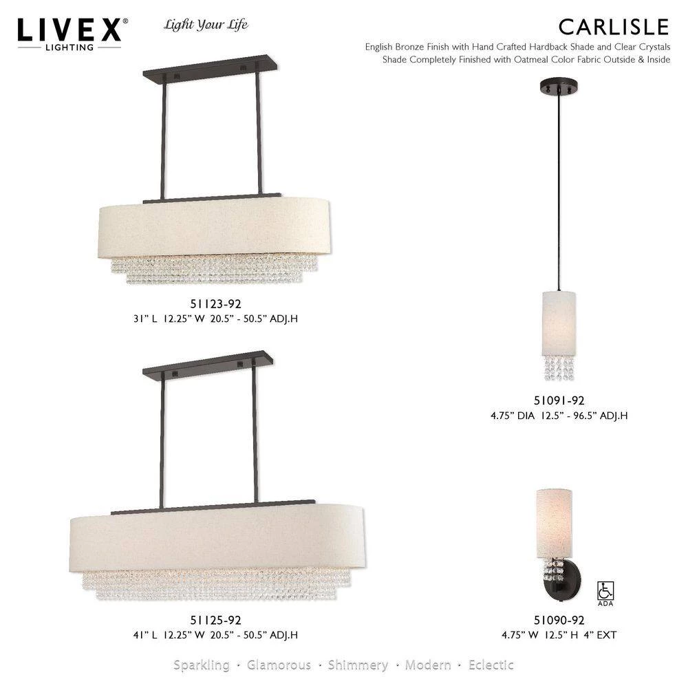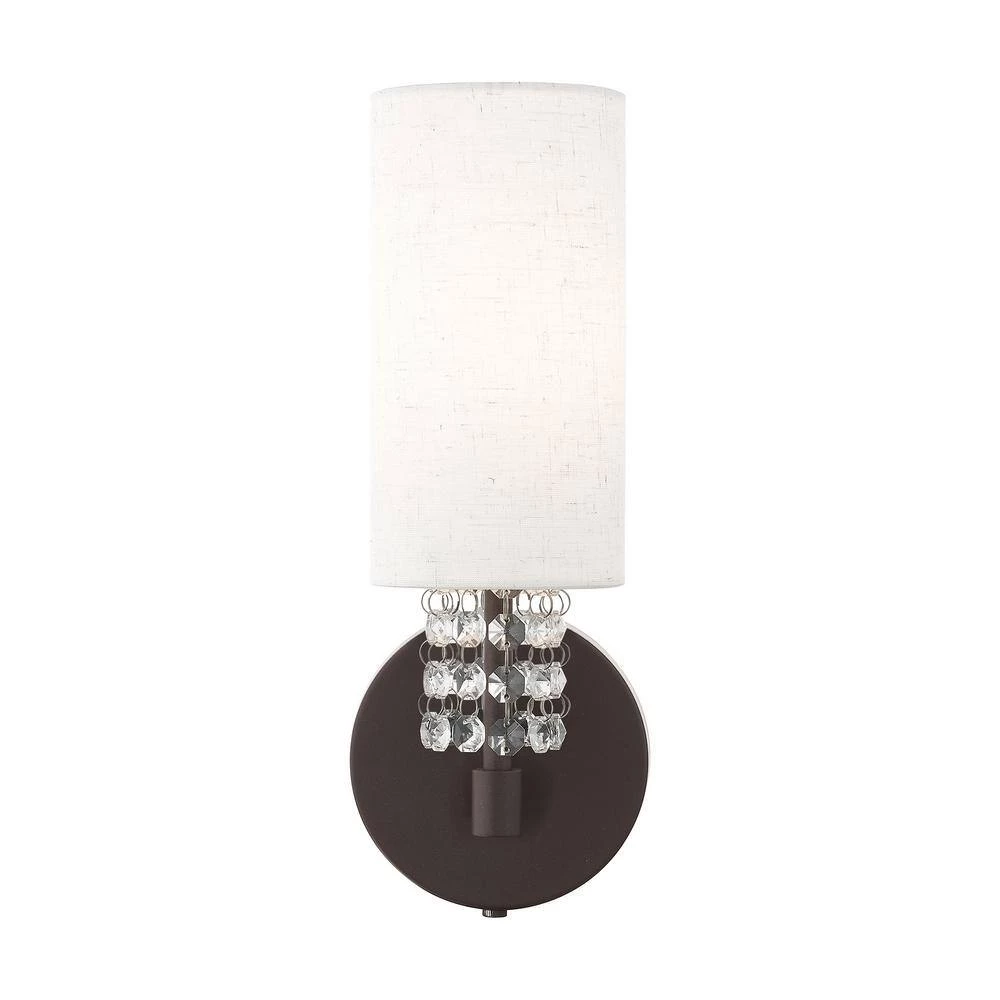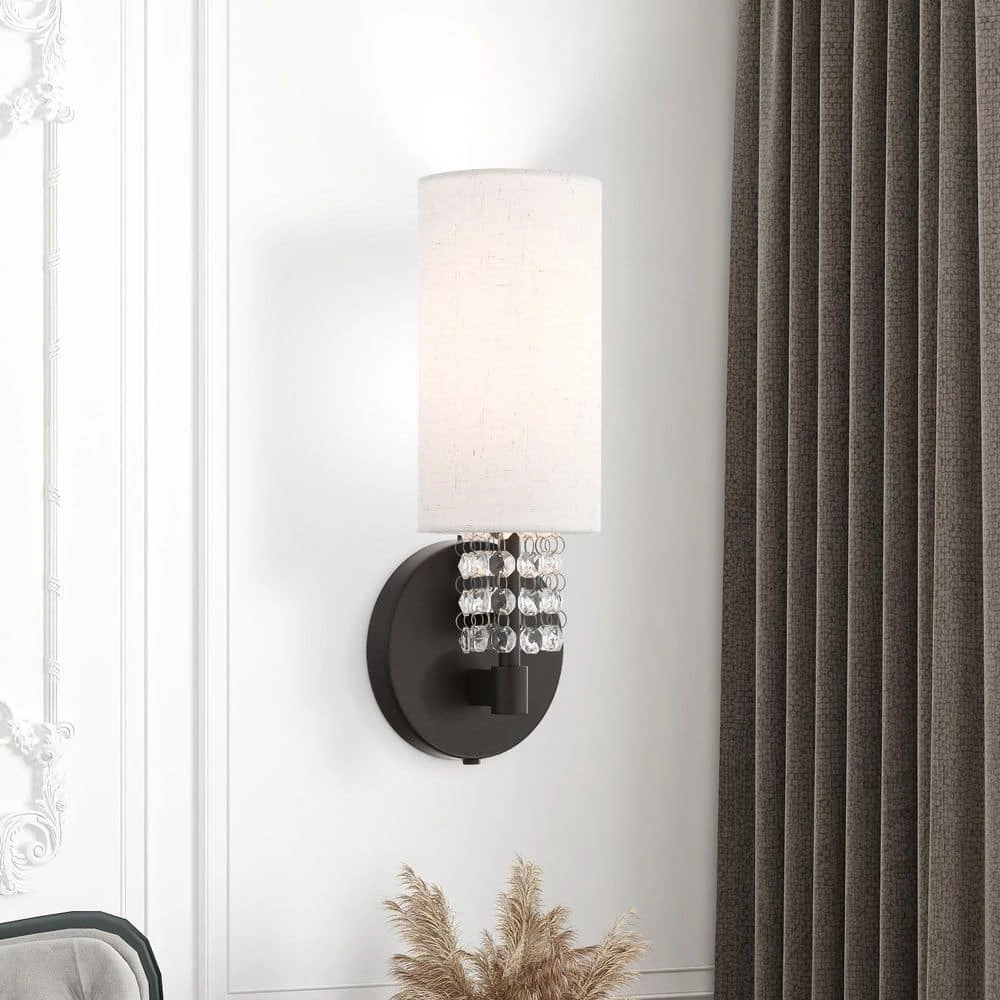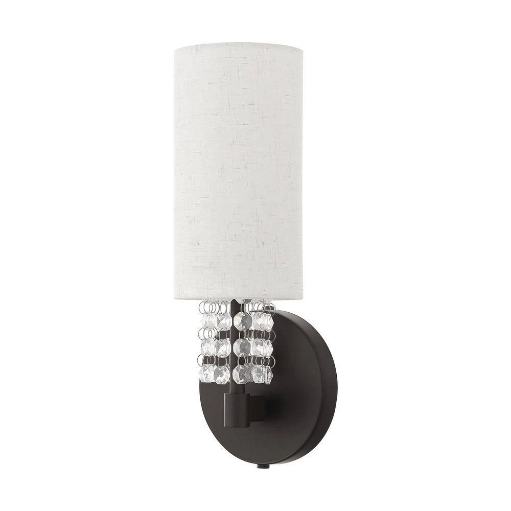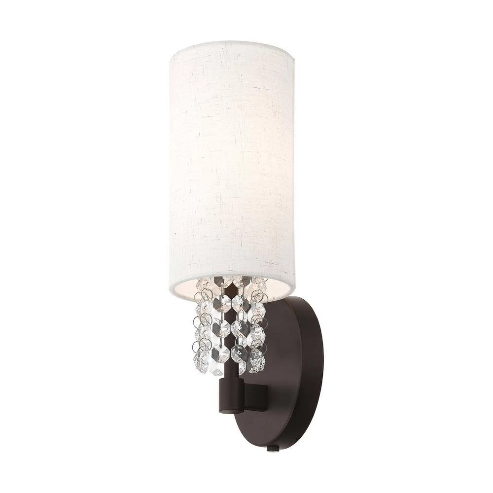 This contemporary style wall sconce from the Carlisle collection features an English bronze finish with hanging strands of beautiful clear crystals. The crystal drapes from a hand crafted oatmeal fabric hardback shade and creates a magnificent sophisticated look. With the superb craftsmanship and affordable price this fixture is sure to tastefully indulge your extravagant side.