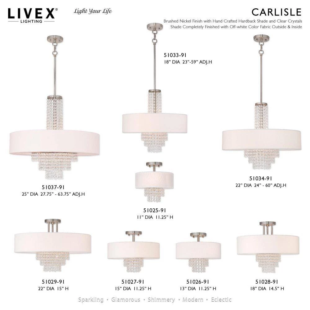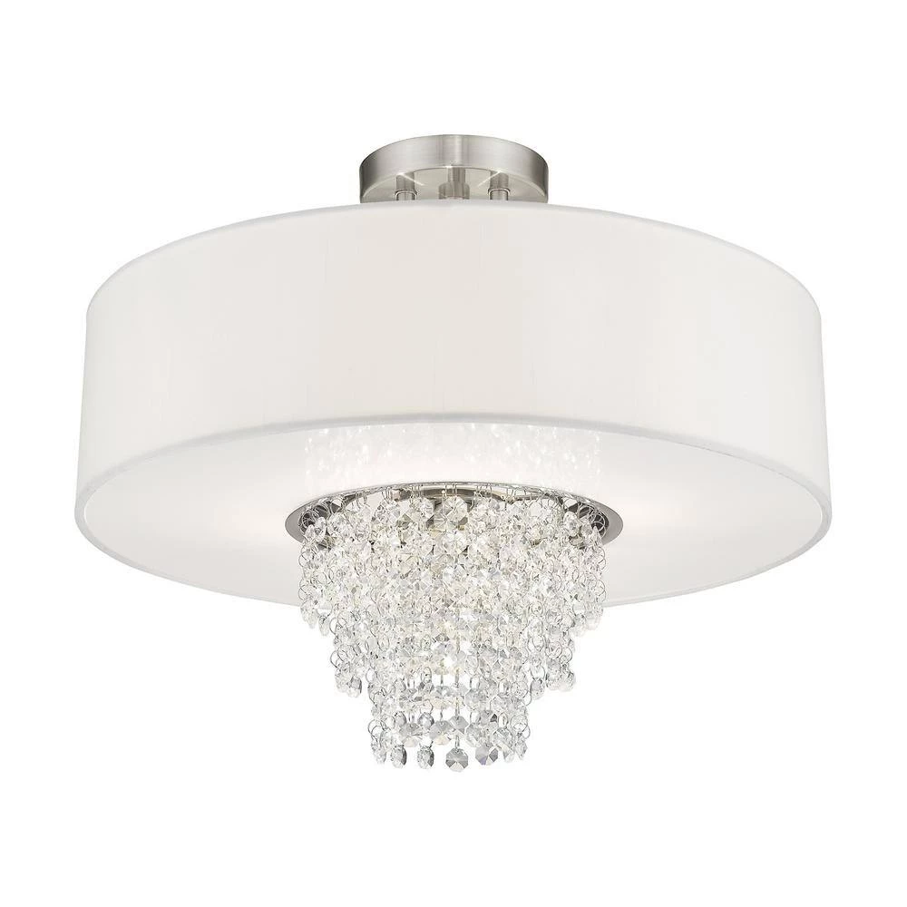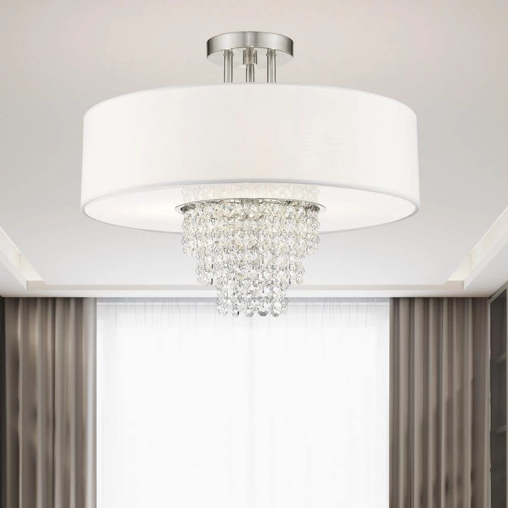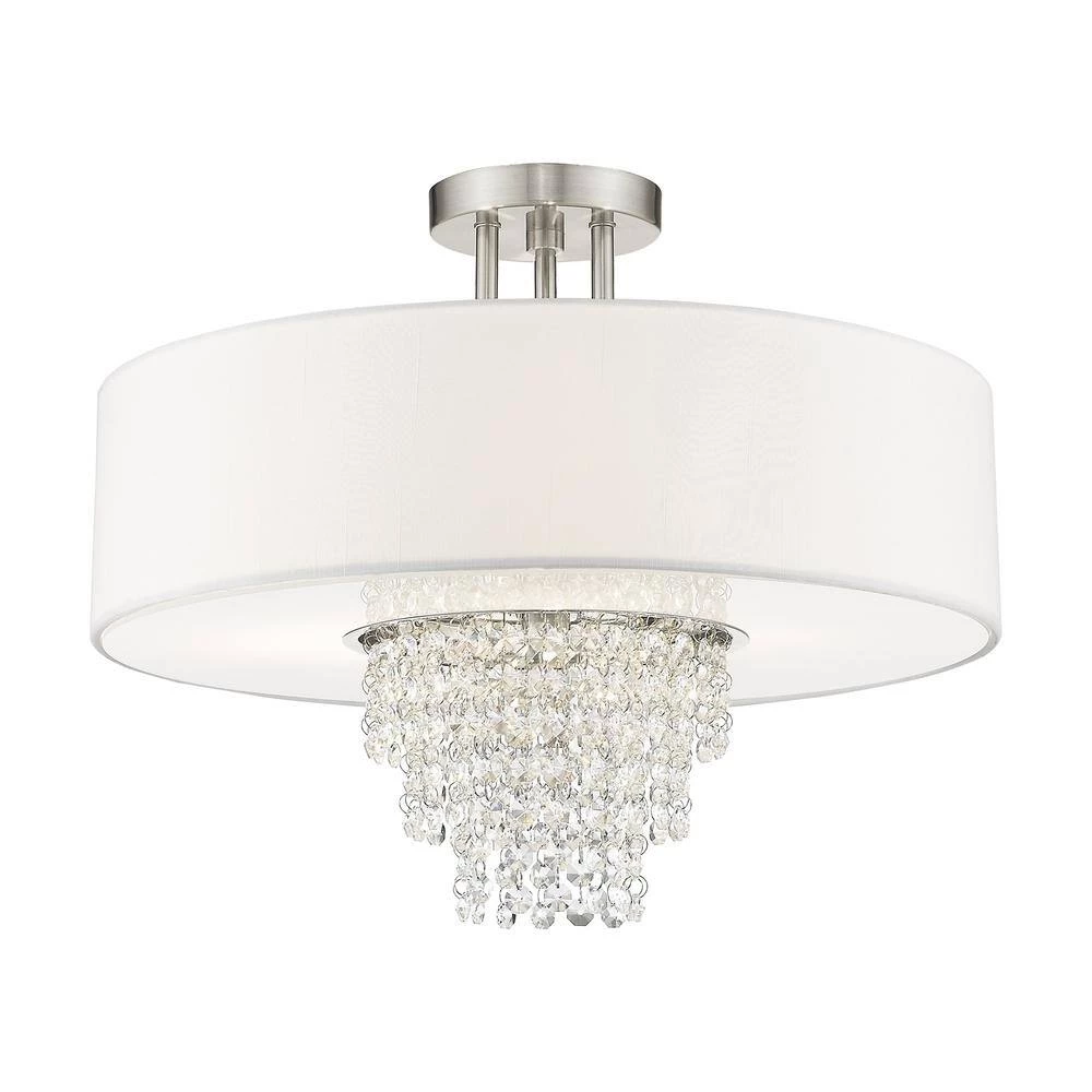 Livex Lighting is well known for quality, style and value. A contemporary style semi flush mount from the Carlisle collection. The design features a brushed nickel housing and canopy, with hanging strands of beautiful clear crystal. A hand crafted off white fabric hardback drum shade surrounds the crystals and fixture frame, and creates a magnificently sophisticated look. This well-rounded fixture is sure to satisfy your lighting needs.