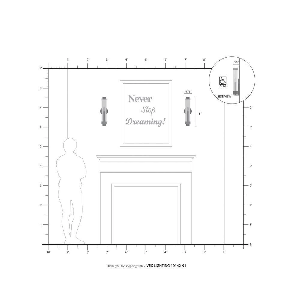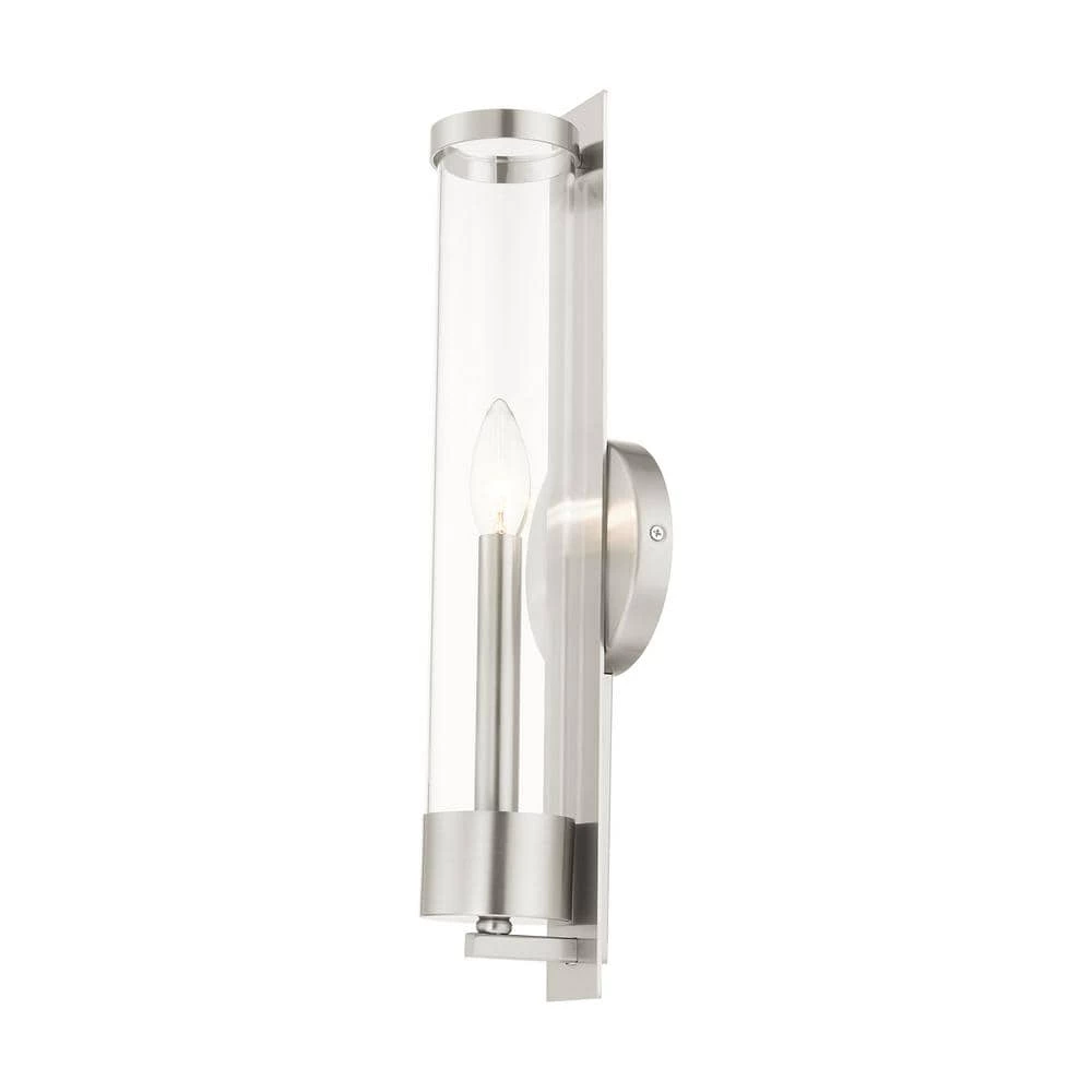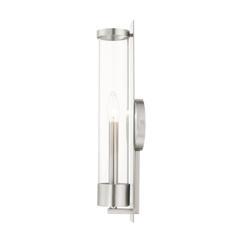 Livex Lighting is well known for quality, style and value. A glass cylinder shines with light as steel straps and a rounded back plate ground this Castleton sconce with modern style. The clean, transitional, versatile sleek look will add romantic light while maintaining your minimalist interior. This beautiful sconce comes in a brushed nickel finish. With its easy installation and low upkeep requirements, this light will not disappoint. This well-rounded fixture is sure to satisfy your lighting needs.