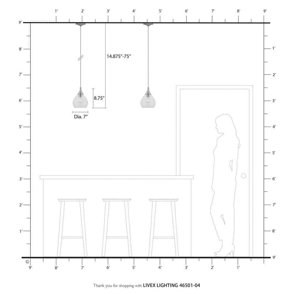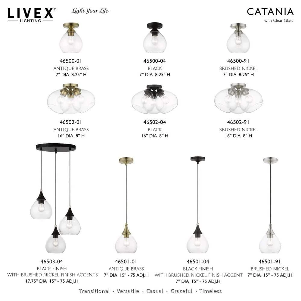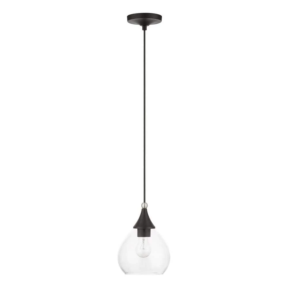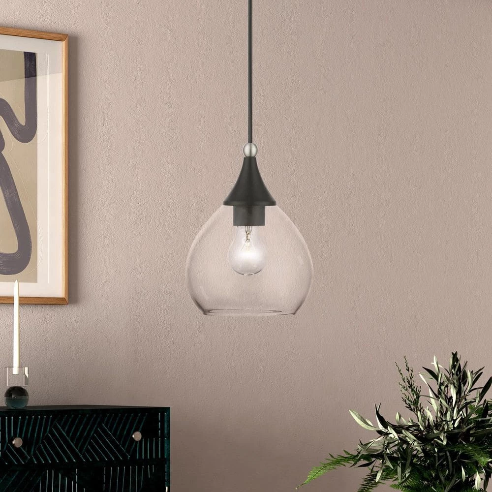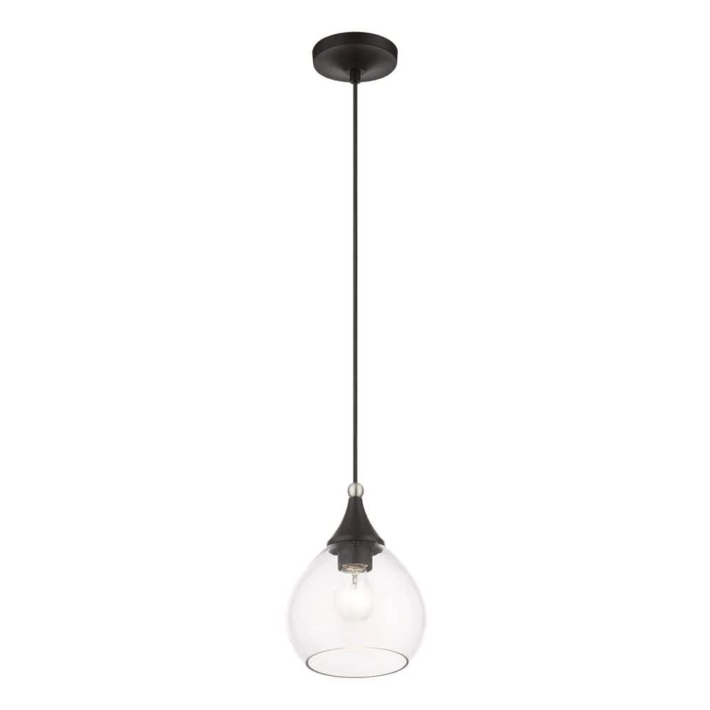 Livex Lighting is well known for quality, style and value. The Catania single light pendant suspends simply and it’s great solo over focus points or set in pairs or trios over long counter tops and islands. It is shown in a black finish with a brushed nickel finish accent and clear glass.