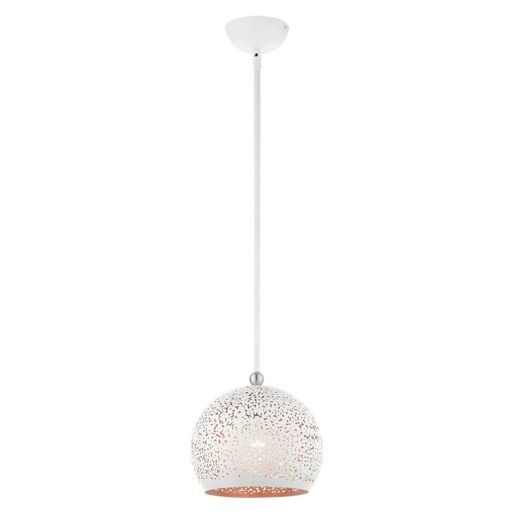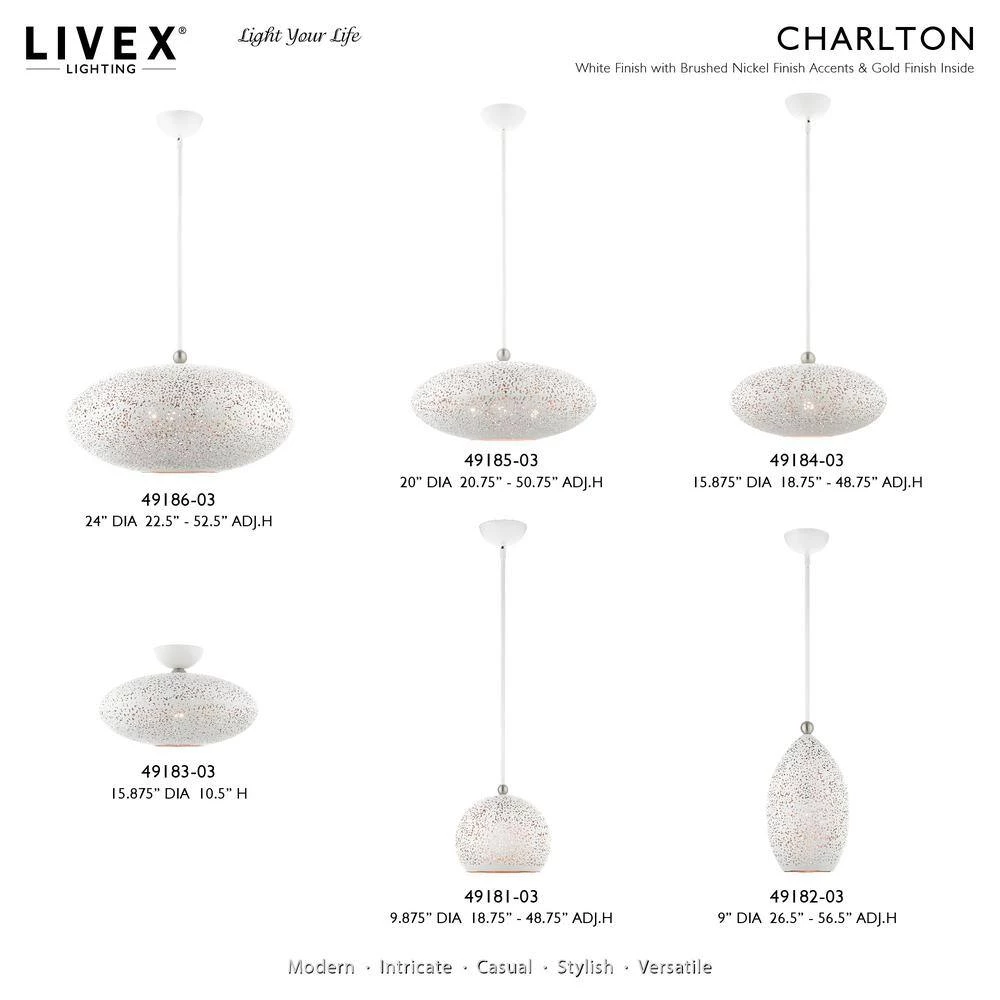 Livex Lighting is well known for quality, style and value. A mini pendant that makes a bold statement in your kitchen, bath or bar area, we present the Charlton. The dynamic design of white outside, gold inside and brushed nickel accents give this mini pendant a transitional look and feel. This well-rounded fixture is sure to satisfy your lighting needs.