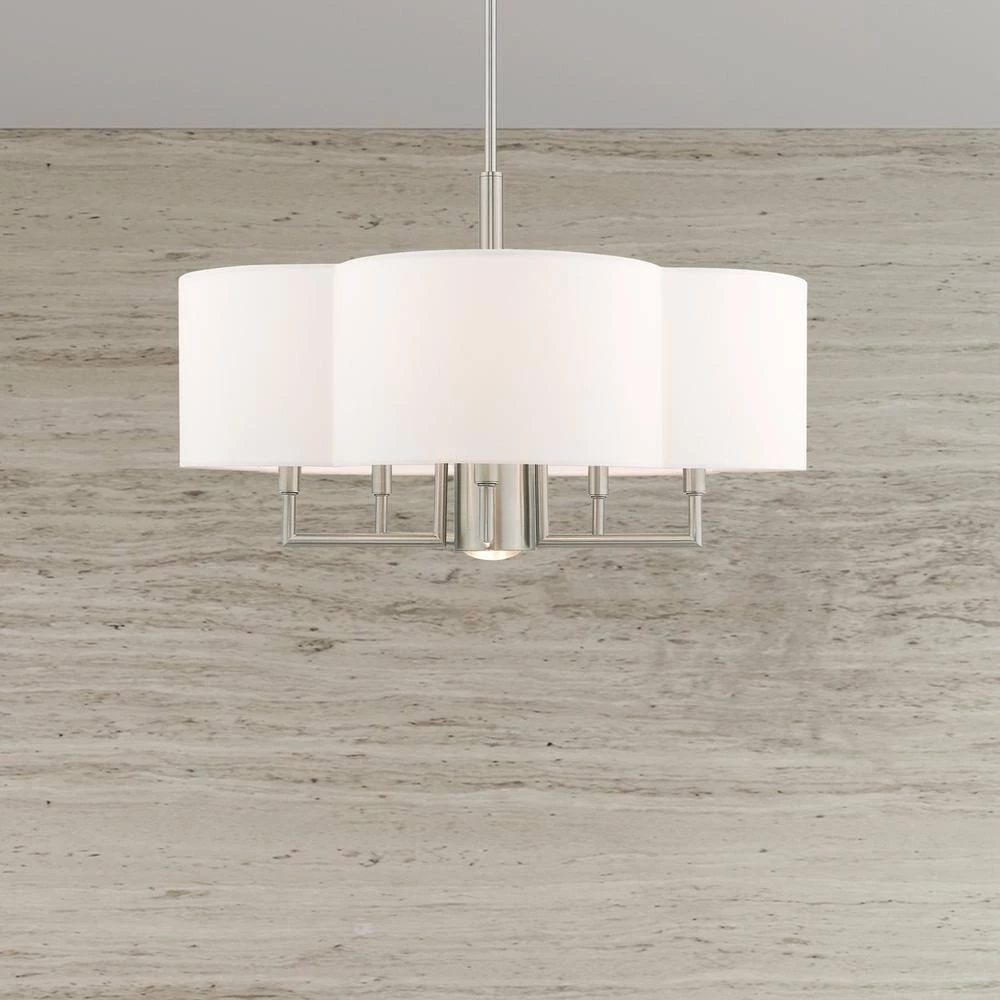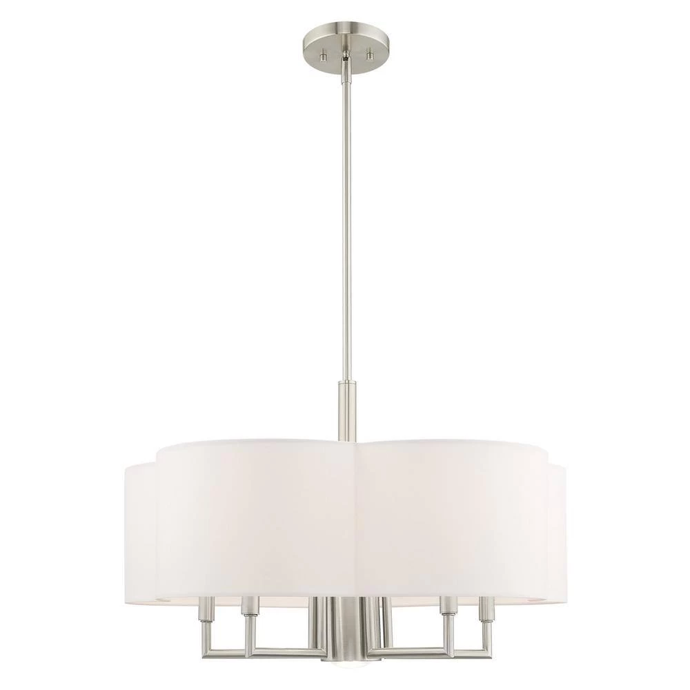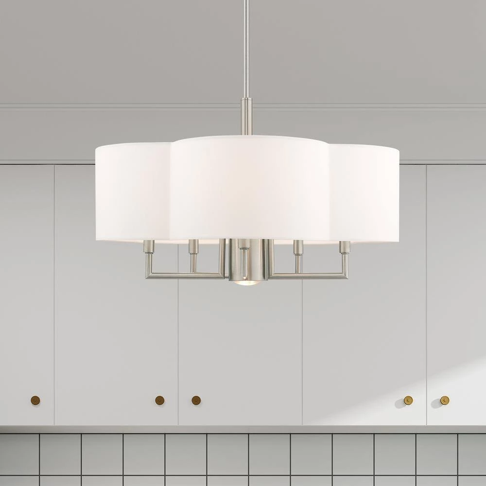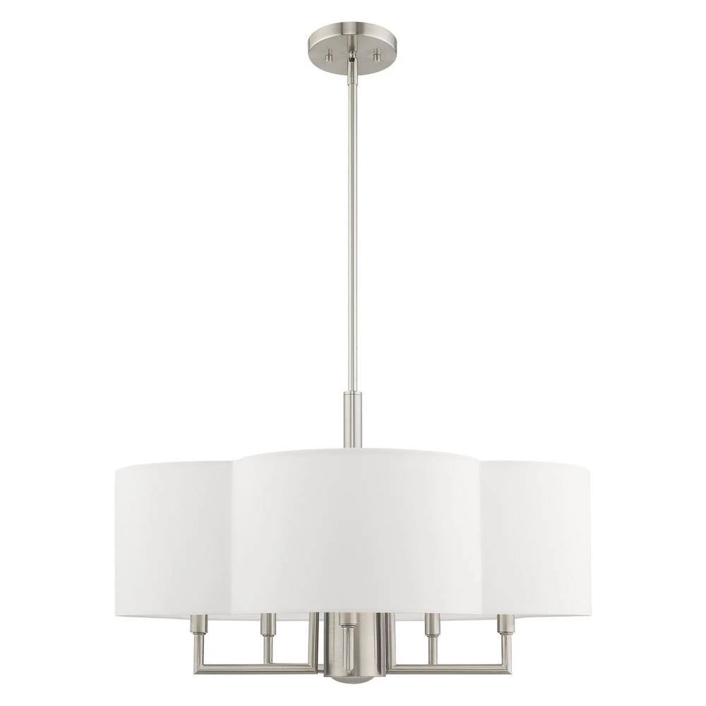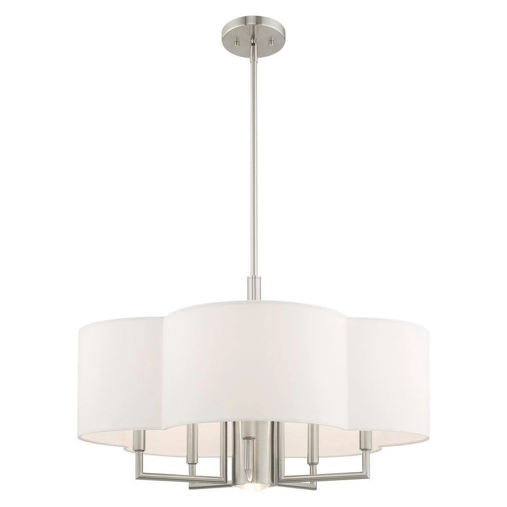 Livex Lighting is well known for quality, style and value. The Chelsea 6 light pendant chandelier features a beautiful hand crafted clover shaped, off-white hardback shade situated on a brushed nickel frame. It will be the perfect pick for a traditional to contemporary style. This well-rounded fixture is sure to satisfy your lighting needs.