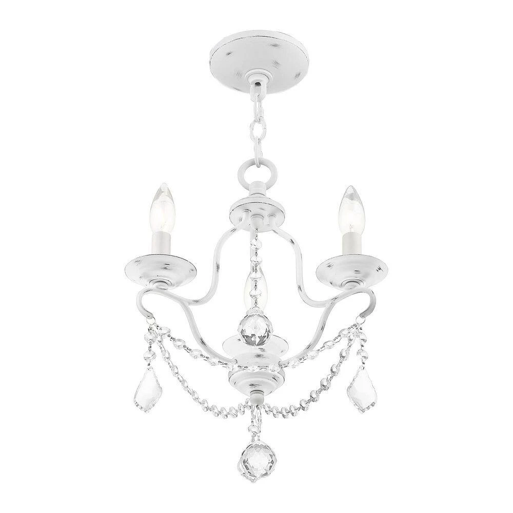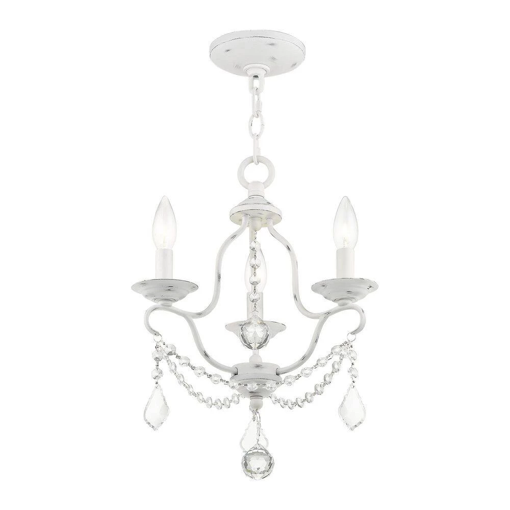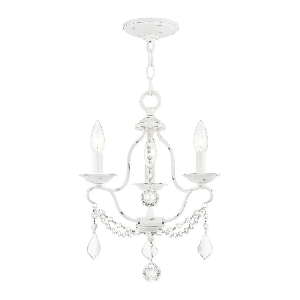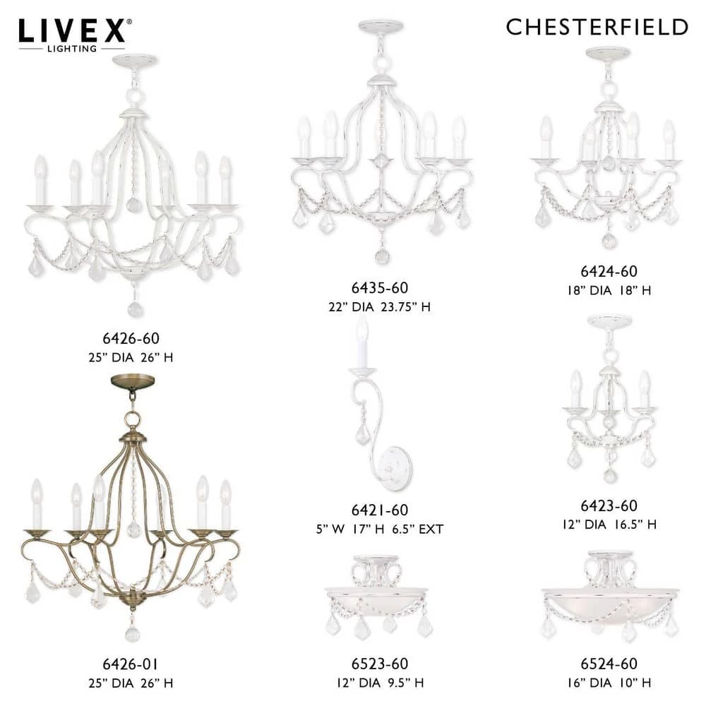 Simple elegance adorns the Chesterfield collection as strings of clear crystal gently cascade from a graceful frame of small scale tubing finished in antique white.