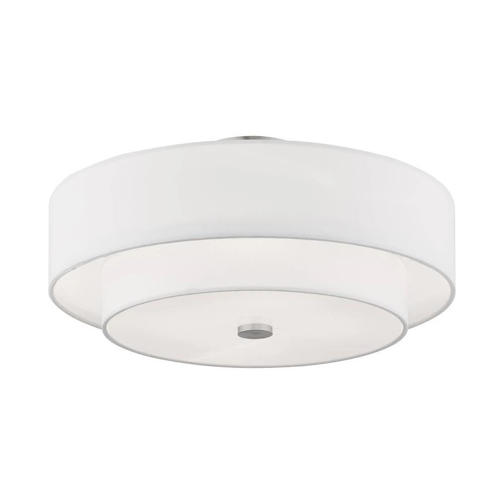 The sleek style and simple design of this semi flush mount, makes it easy to use in any space. This 4 light fixture features an off-white fabric hardback drum shade with a satin white hardened glass diffuser. With the superb craftsmanship and affordable price this fixture is sure to tastefully indulge your extravagant side.