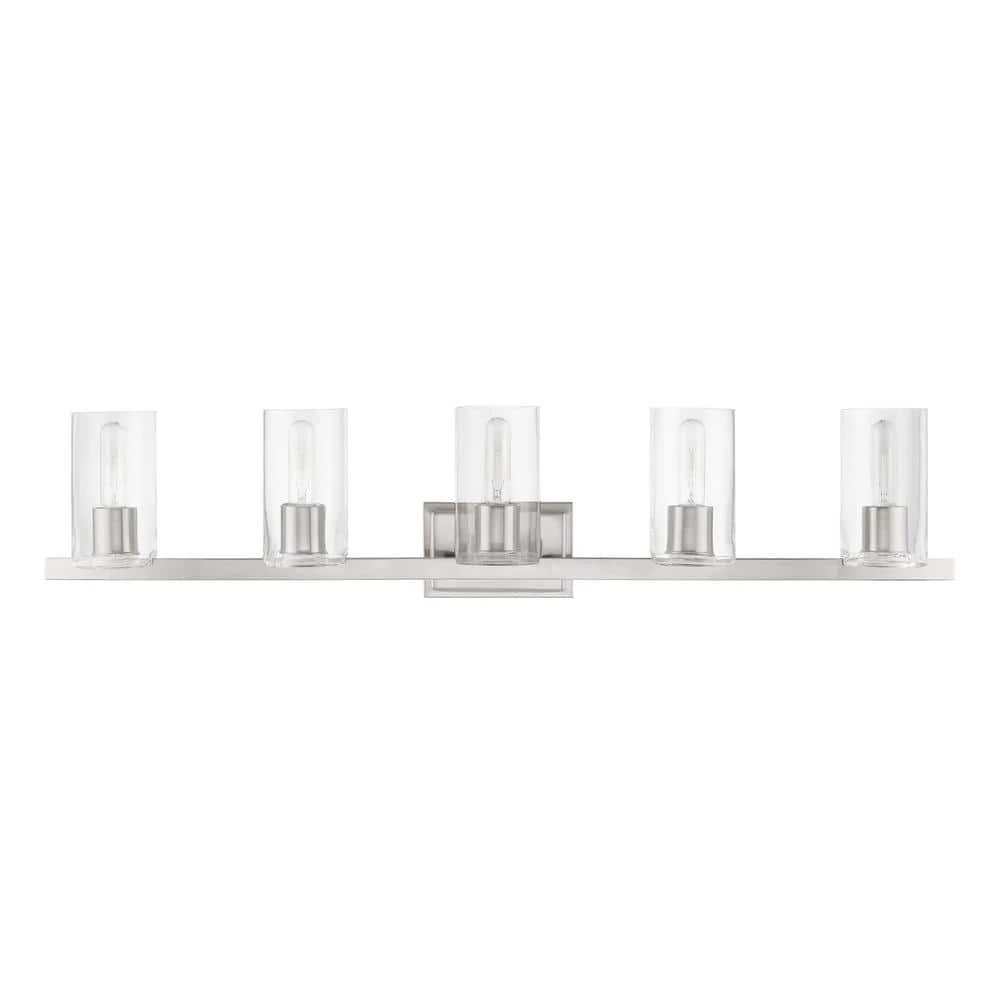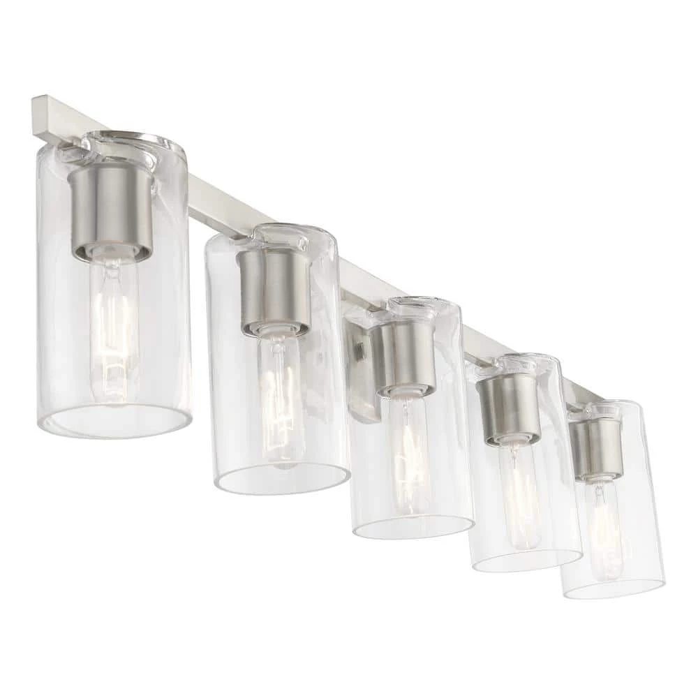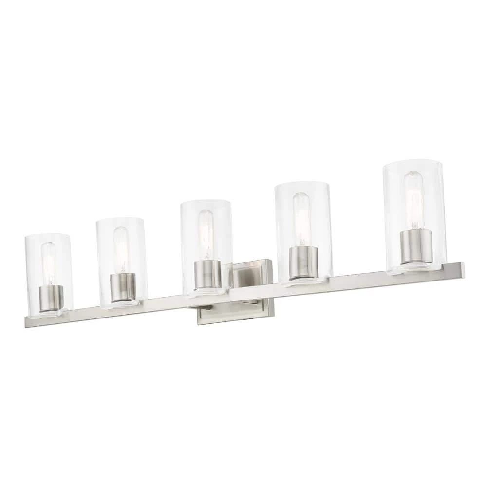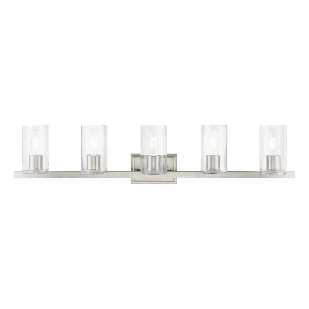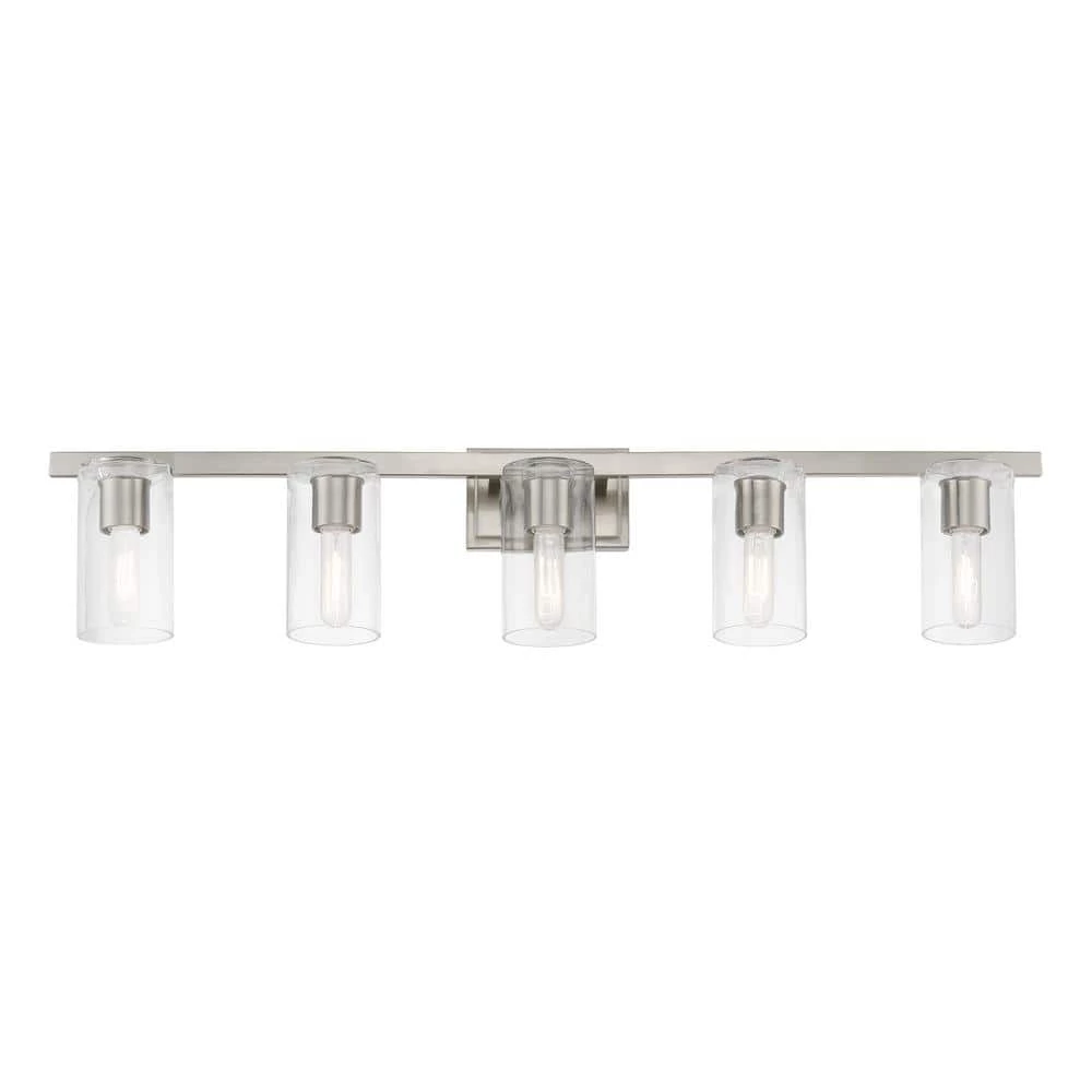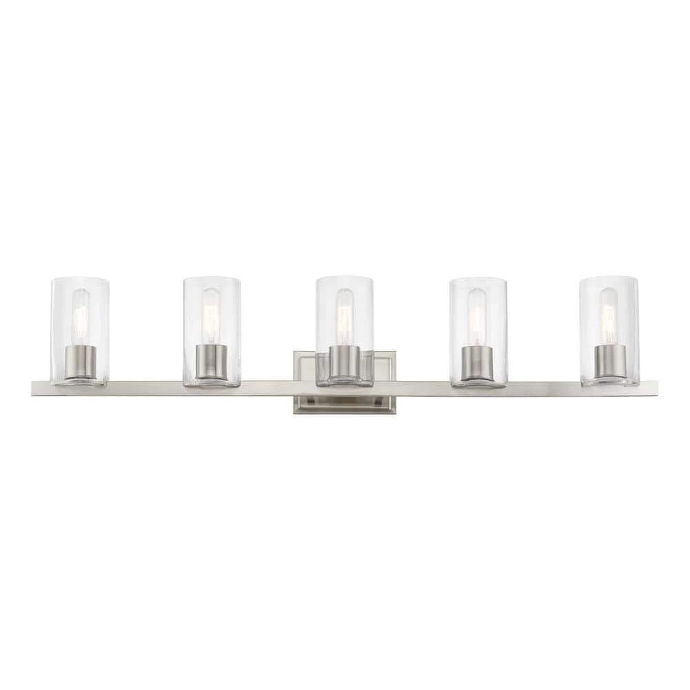 The clarion transitional 5-light vanity sconce will bring posh sophistication to your decor. The backplate and clear cylinder glass give this brushed nickel finish a sleek, contemporary look. With the superb craftsmanship and affordable price this fixture is sure to tastefully indulge your extravagant side.
