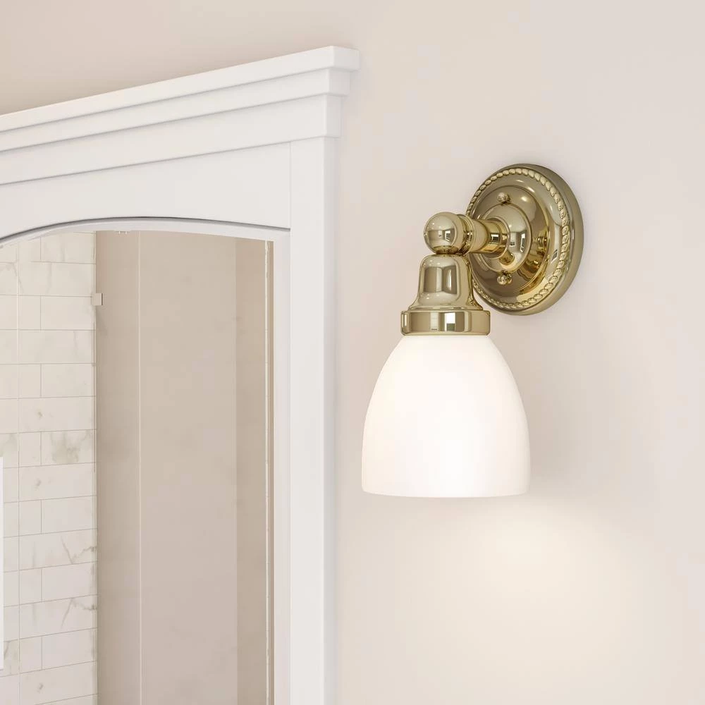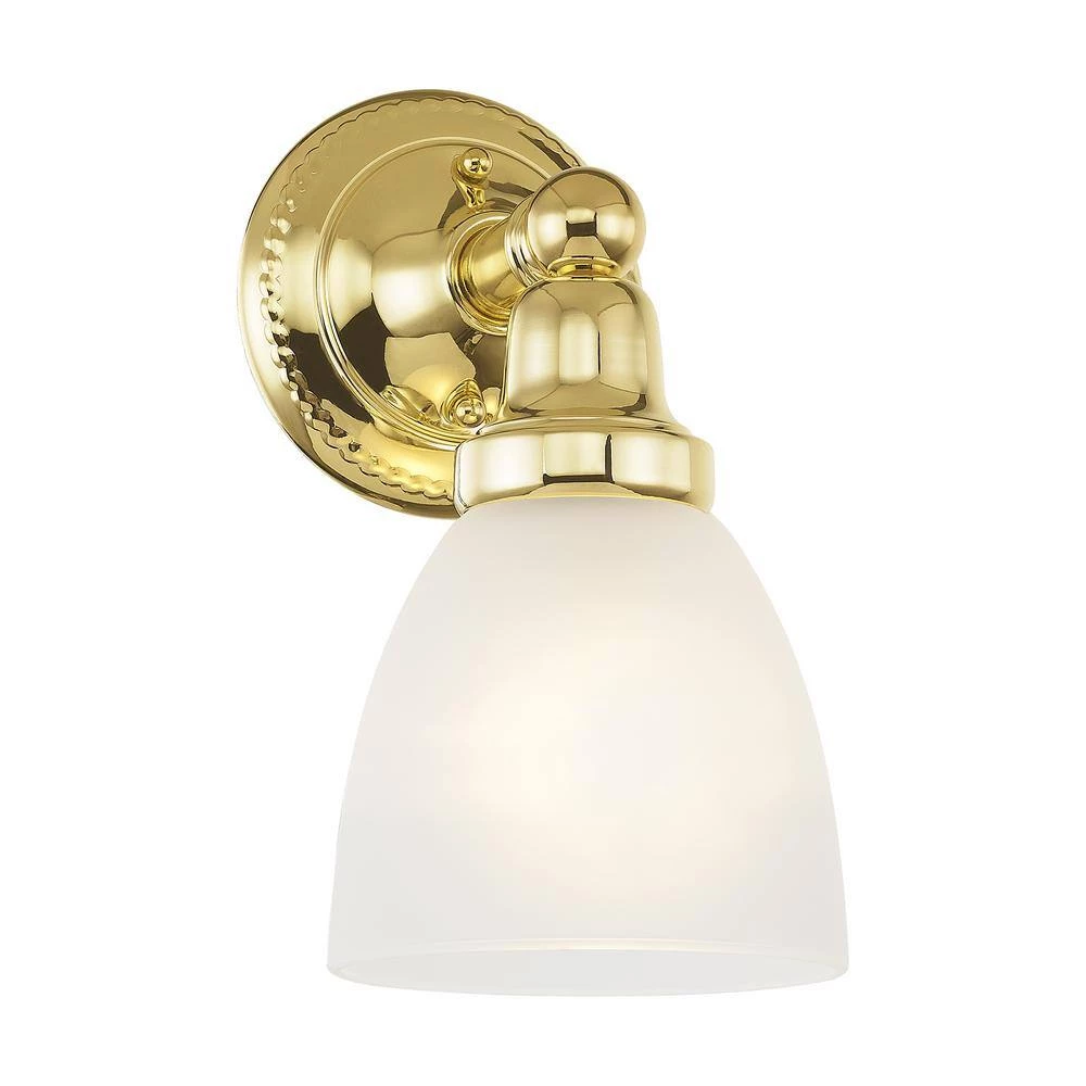 Livex Lighting is well known for quality, style and value. In a polished brass finish, this one light bath fixture features a timeless torchiere design. Topped with Satin Opal White glass shades which provide a clean and classic look that will complete any space. This fixture is the perfect finishing touch when arranged alone or in pairs. This well-rounded fixture is sure to satisfy your lighting needs.