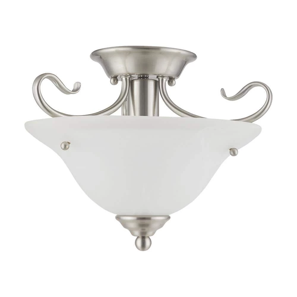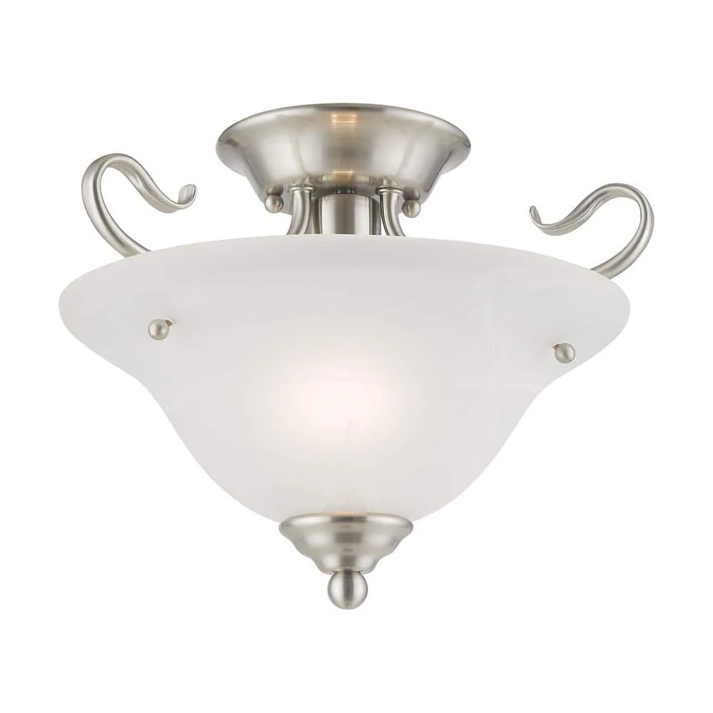 Livex Lighting is well known for quality, style and value. Classic brushed nickel one light semi flush mount paired with white alabaster glass. Timeless in its vintage appeal, this light is stylish for both new and restored homes. This well-rounded fixture is sure to satisfy your lighting needs.