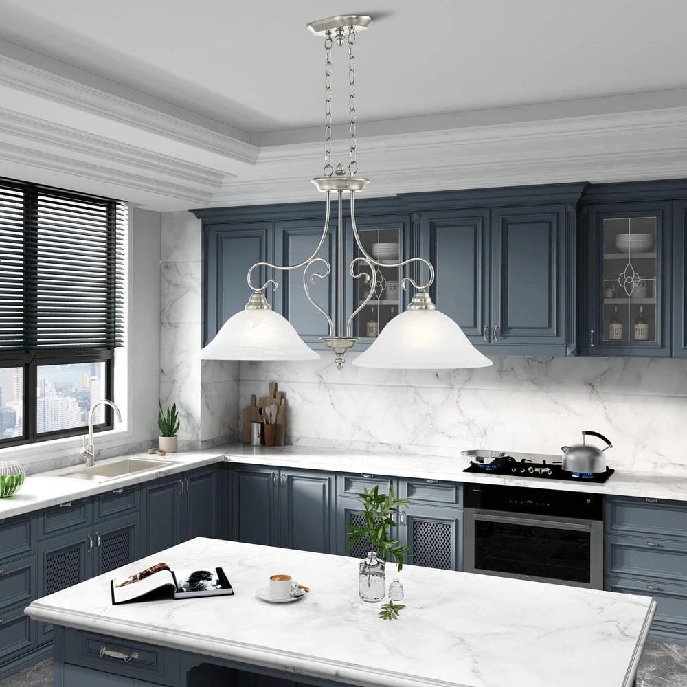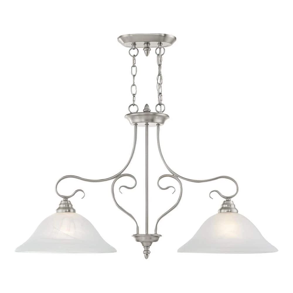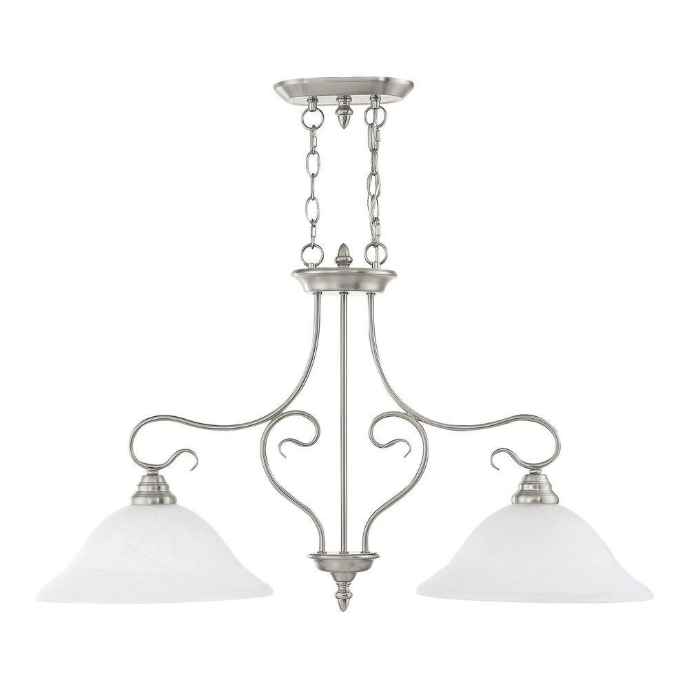 Livex Lighting is well known for quality, style and value. Classic brushed nickel 2 light linear chandelier paired with white alabaster glass. Timeless in its vintage appeal, this light is stylish for both new and restored homes. This well-rounded fixture is sure to satisfy your lighting needs.