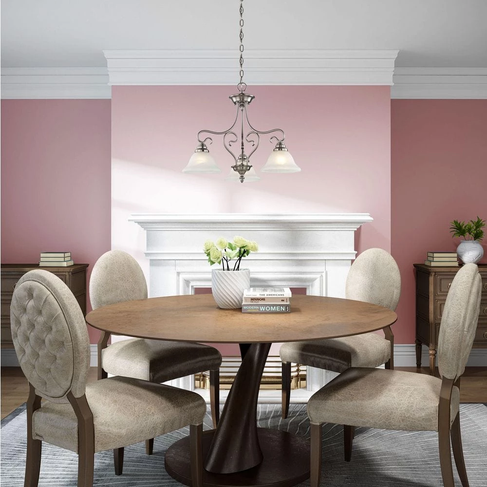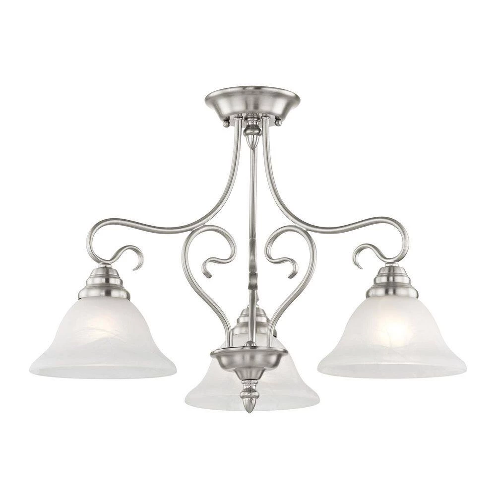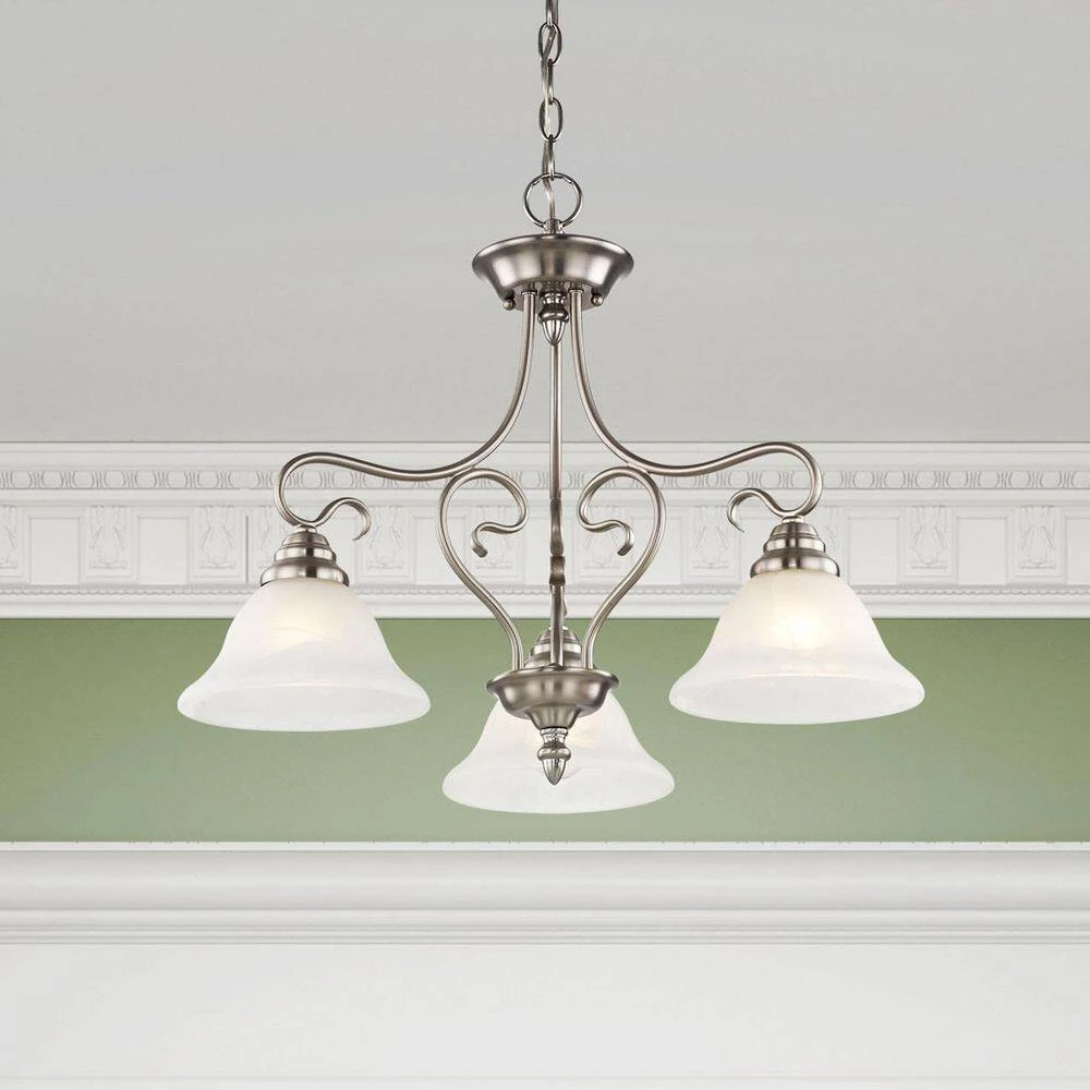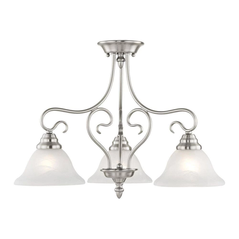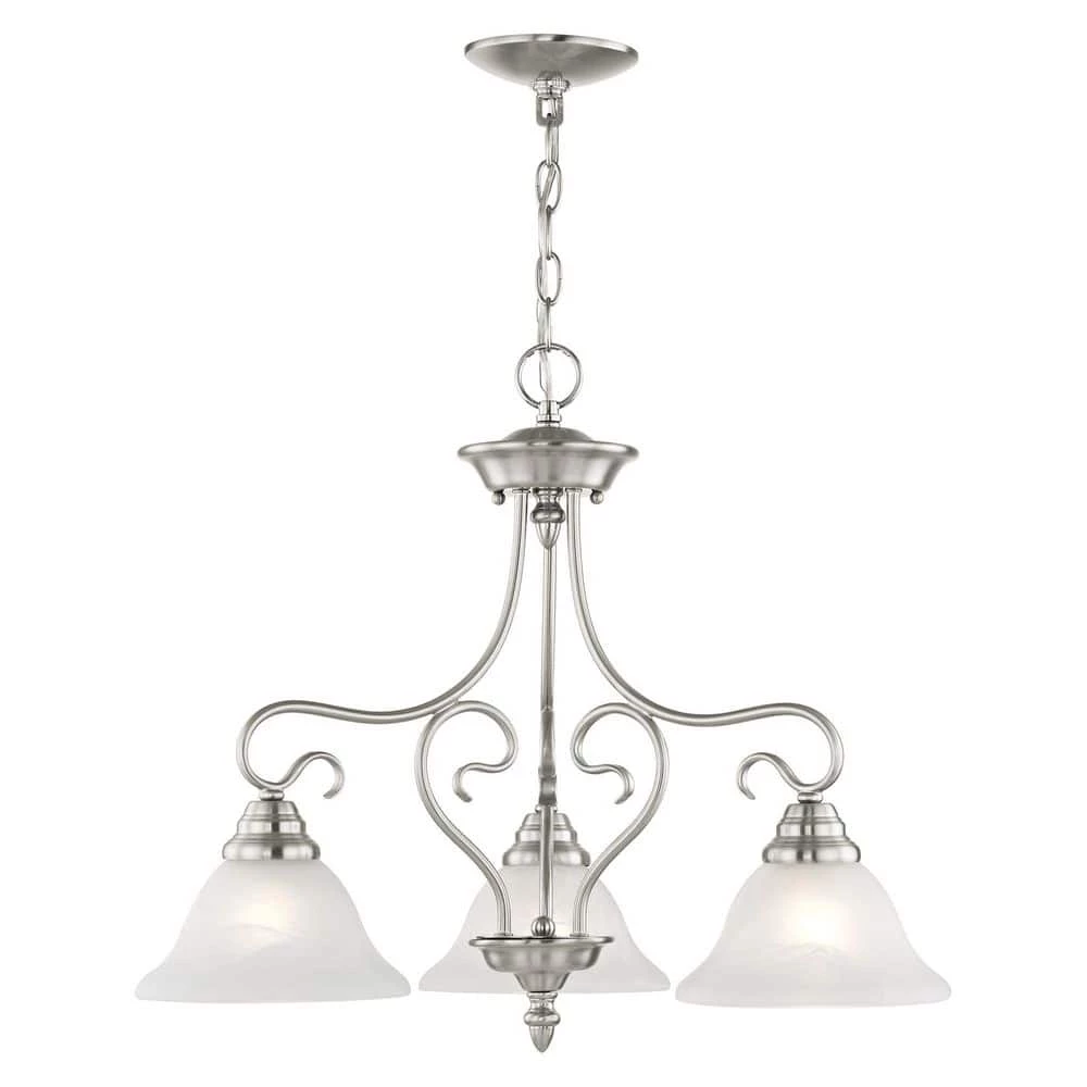 Livex Lighting is well known for quality, style and value. Classic brushed nickel 3 light chandelier paired with white alabaster glass. Timeless in its vintage appeal, this light is stylish for both new and restored homes. This well-rounded fixture is sure to satisfy your lighting needs.