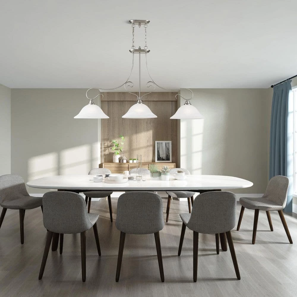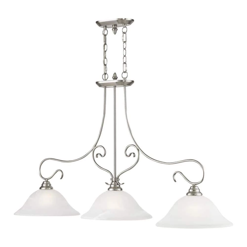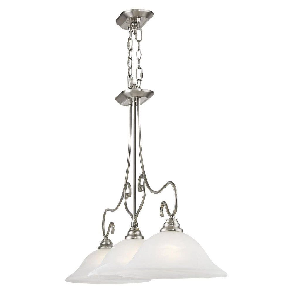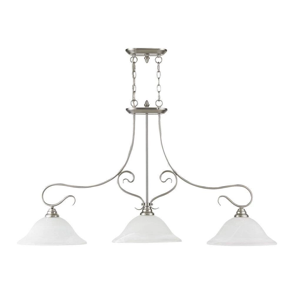 Livex Lighting is well known for quality, style and value. Classic brushed nickel 3 light linear chandelier paired with white alabaster glass. Timeless in its vintage appeal, this light is stylish for both new and restored homes. This well-rounded fixture is sure to satisfy your lighting needs.