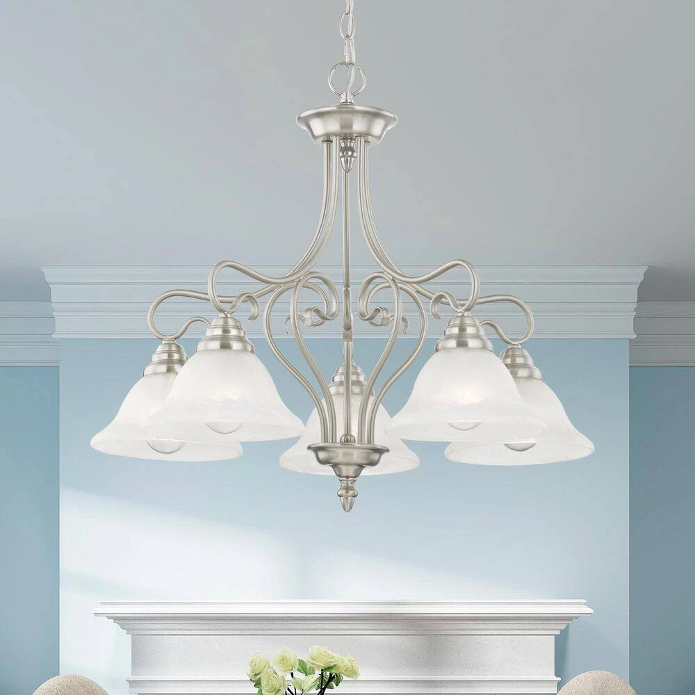 Add transitional illumination to your space with this 5-light chandelier from Livex Lighting. The white alabaster glass shades and brushed nickel finish make it perfect for modern and classic interiors. Eye-catching and stylish, this fixture adds visual interest to a dining room or living room. It uses five incandescent bulbs (sold separately) and includes all the hardware for an easy installation.