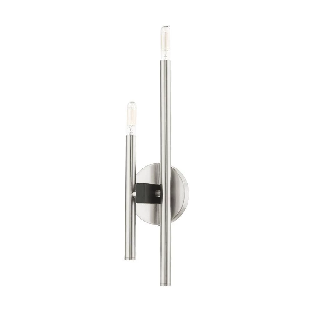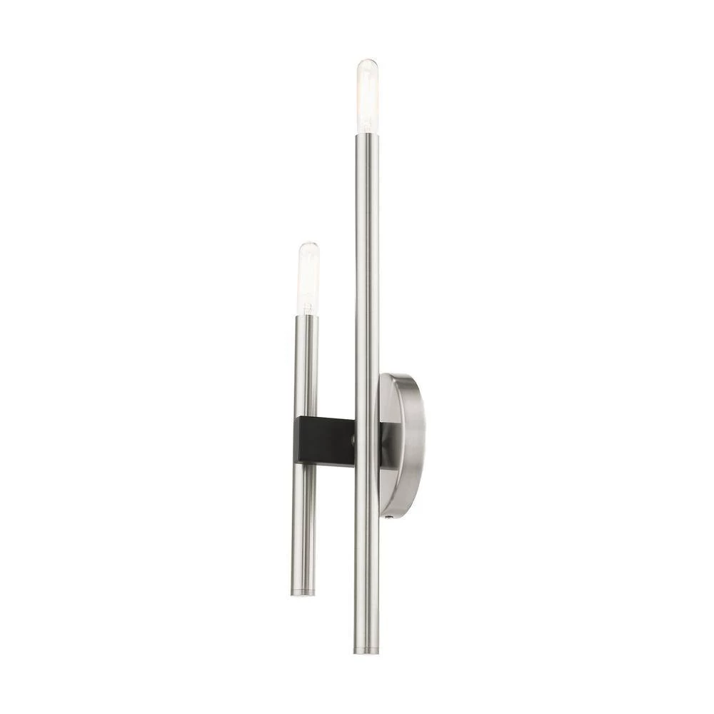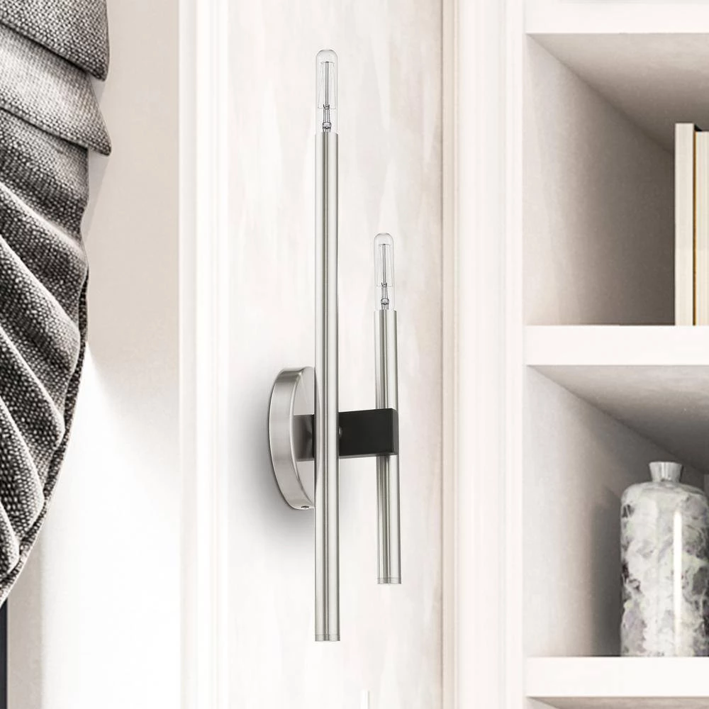 Livex Lighting is well known for quality, style and value. The clean lines of the Denmark collection remind of early modern Scandinavian style. The slim candles rise on the contrasting bar at different heights dynamically emulating the shape of a city skyline. This double-light exposed bulb sconce comes in a brushed nickel finish accented with black finish bars. Versatile enough for almost any interior where dramatic statement is needed such as a bathroom, hallway, dining room, living room or bedroom. This well-rounded fixture is sure to satisfy your lighting needs.