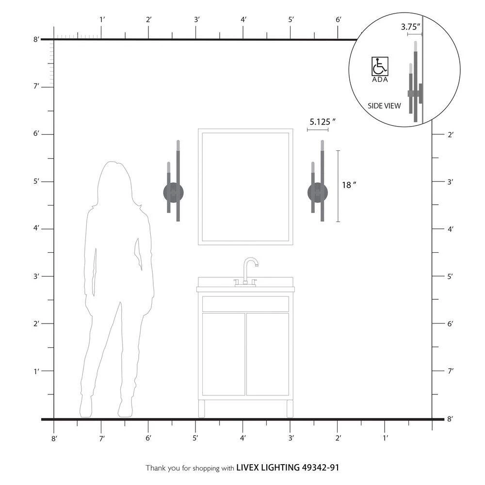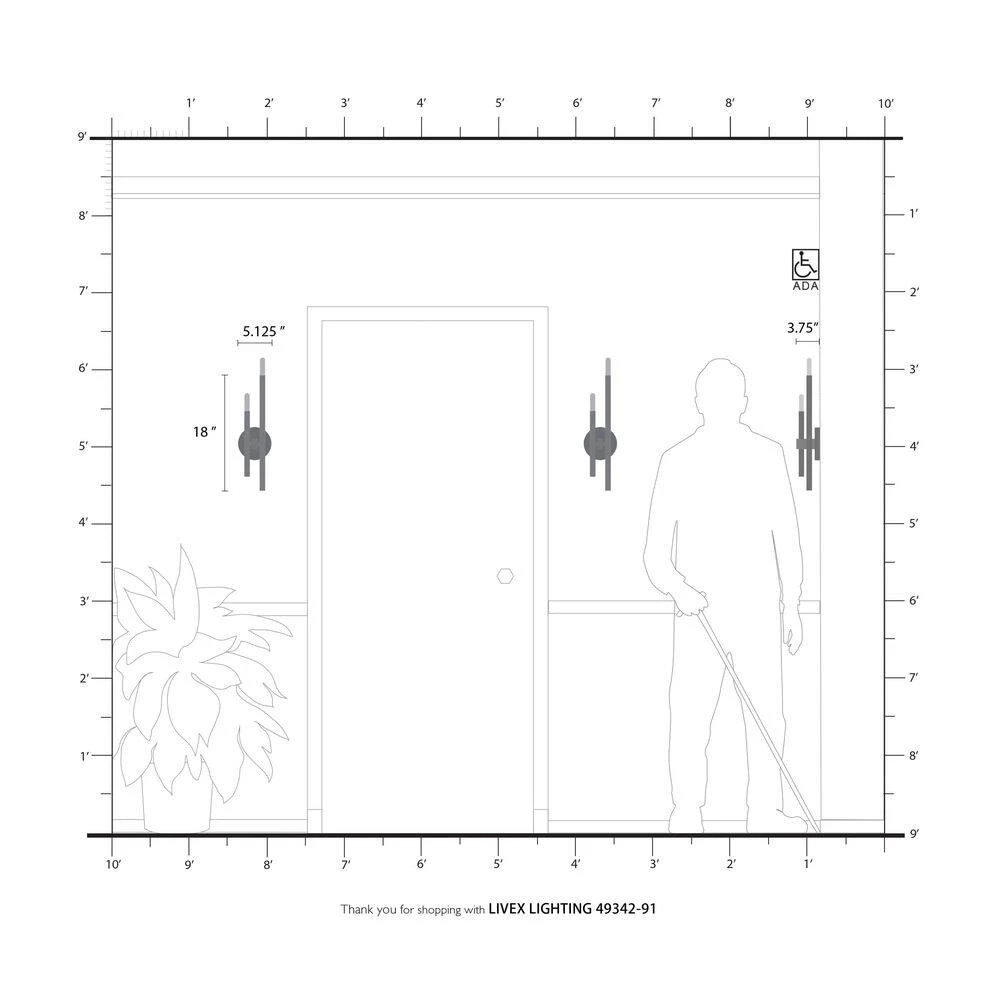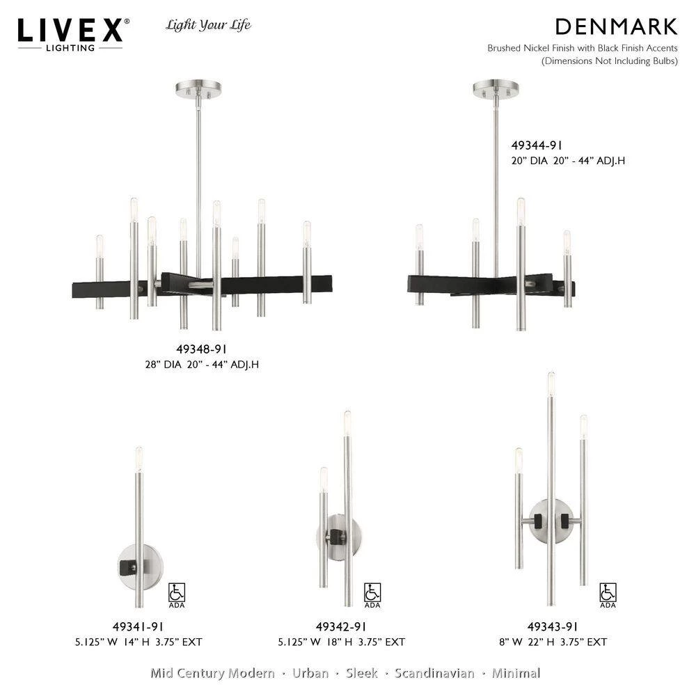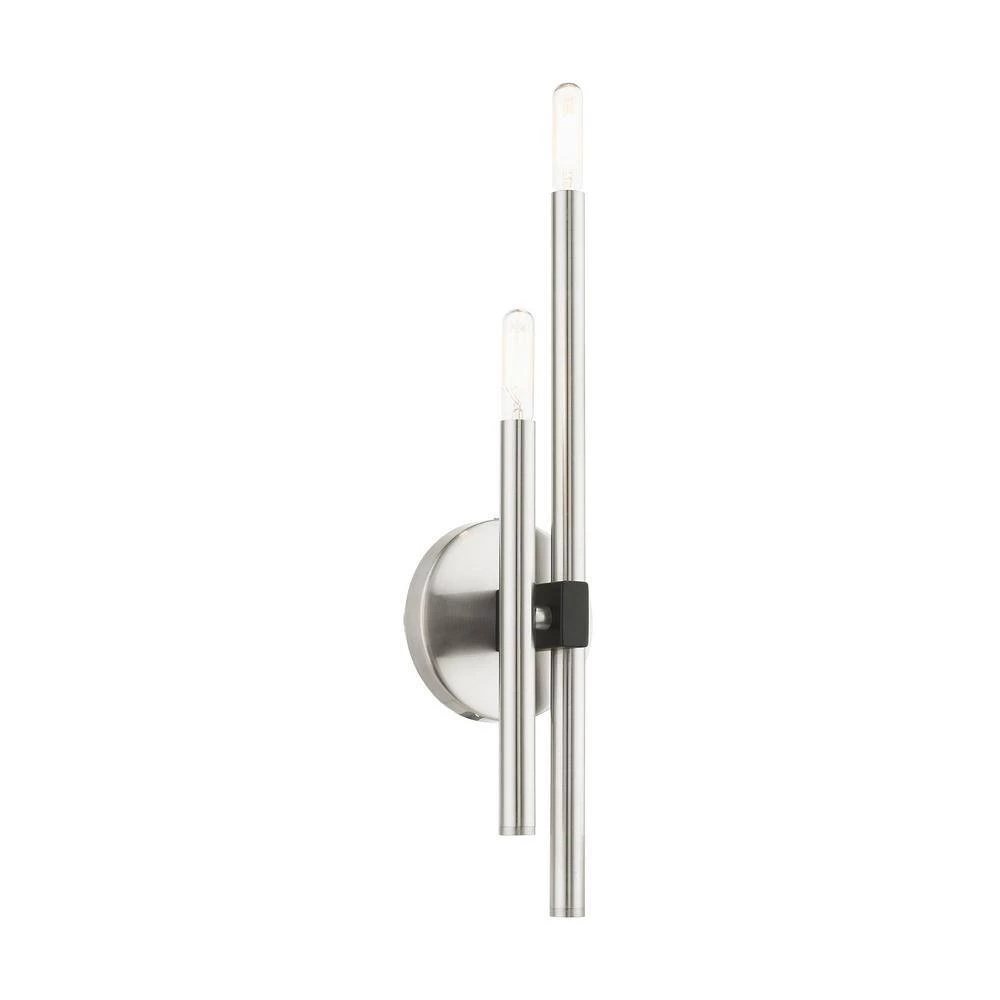 Livex Lighting is well known for quality, style and value. The clean lines of the Denmark collection remind of early modern Scandinavian style. The slim candles rise on the contrasting bar at different heights dynamically emulating the shape of a city skyline. This double-light exposed bulb sconce comes in a brushed nickel finish accented with black finish bars. Versatile enough for almost any interior where dramatic statement is needed such as a bathroom, hallway, dining room, living room or bedroom. This well-rounded fixture is sure to satisfy your lighting needs.