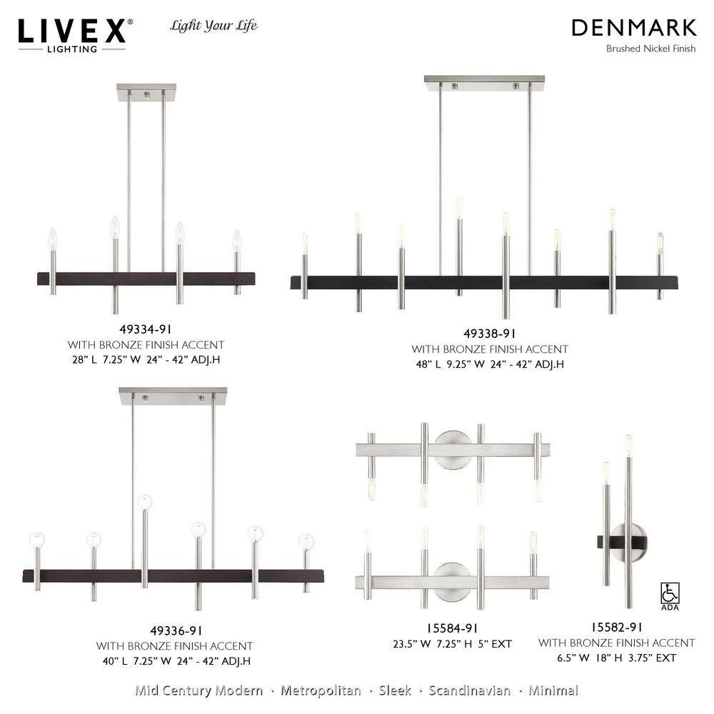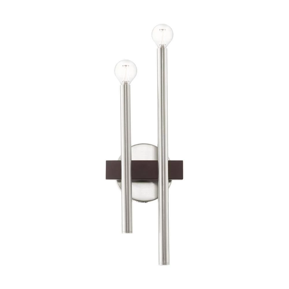 Livex Lighting is well known for quality, style and value. The clean lines of the Denmark collection remind of early modern Scandinavian style. The slim candles rise on the contrasting bar at different heights dynamically emulating the shape of a city skyline. This double-light exposed bulb sconce comes in a brushed nickel finish with bronze finish bars. Versatile enough for almost any interior where dramatic statement is needed such as a bathroom, hallway, dining room, living room or bedroom. This well-rounded fixture is sure to satisfy your lighting needs.
