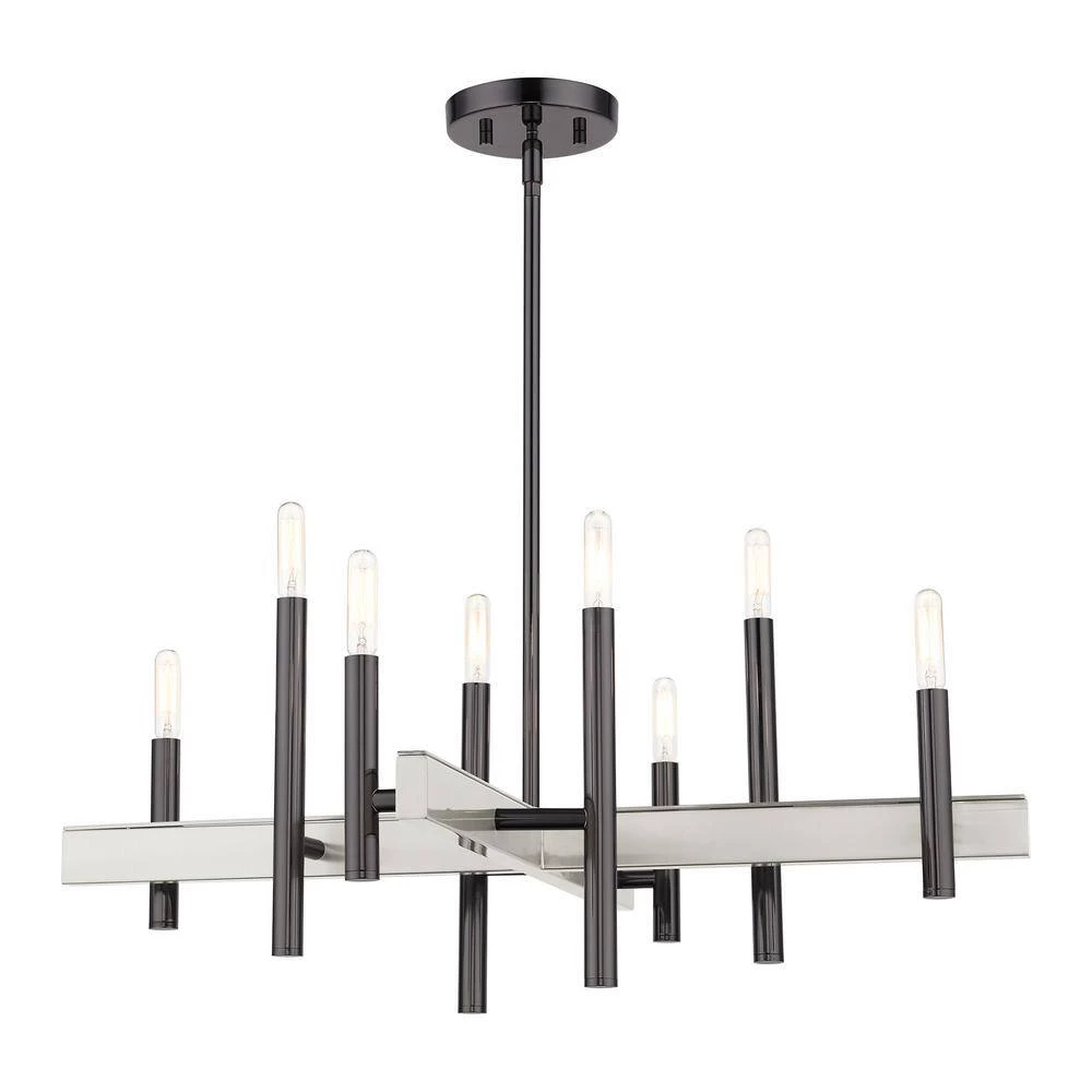 Livex Lighting is well known for quality, style and value. The clean lines of the Denmark collection remind of early modern Scandinavian style. The slim candles rise on the contrasting bar at different heights dynamically emulating the shape of a city skyline. This eight-light exposed bulb chandelier comes in a black chrome finish with brushed nickel finish bars. Versatile enough for almost any interior where dramatic statement is needed such as a foyer, dining room, living room or bedroom. This well-rounded fixture is sure to satisfy your lighting needs.