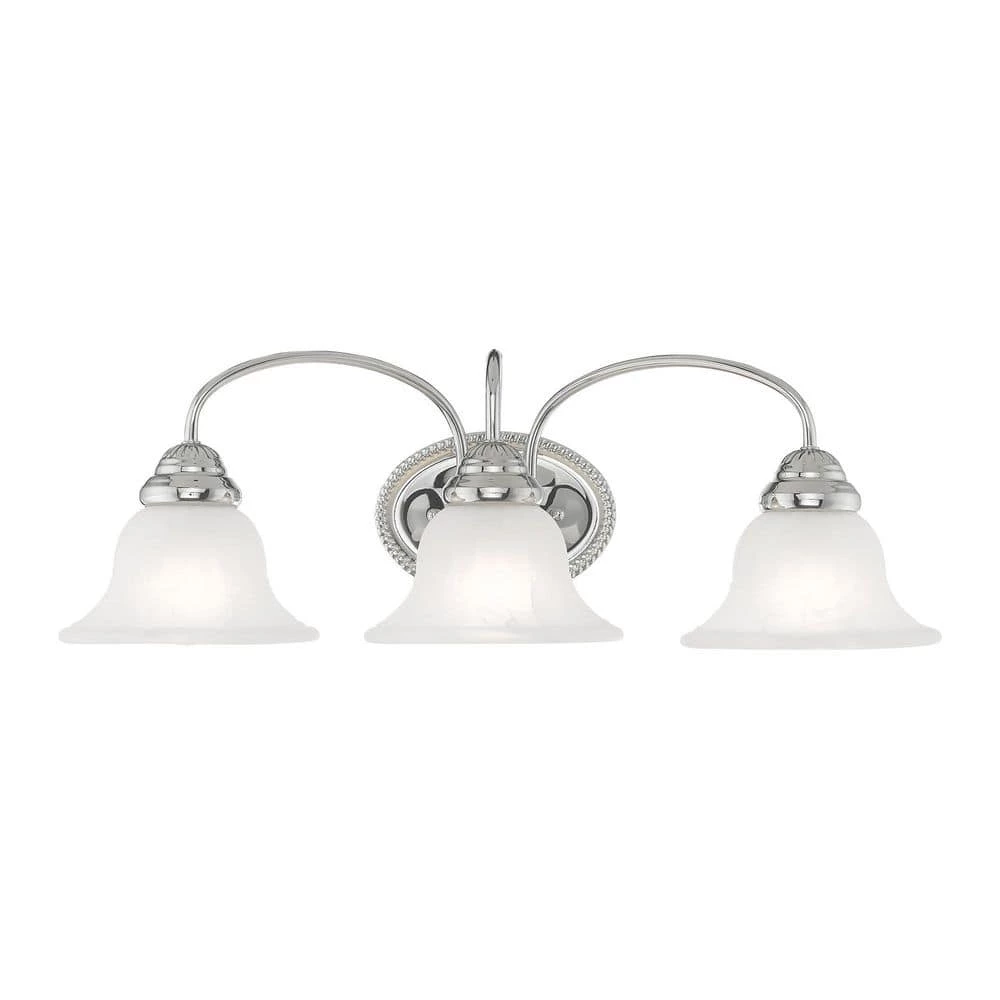 Livex Lighting is well known for quality, style and value. This 3 light bath vanity from the Edgemont collection is a fine and handsome fixture that features white alabaster glass. Edgemont is comprised of traditional iron forms in an polished chrome finish. This well-rounded fixture is sure to satisfy your lighting needs.